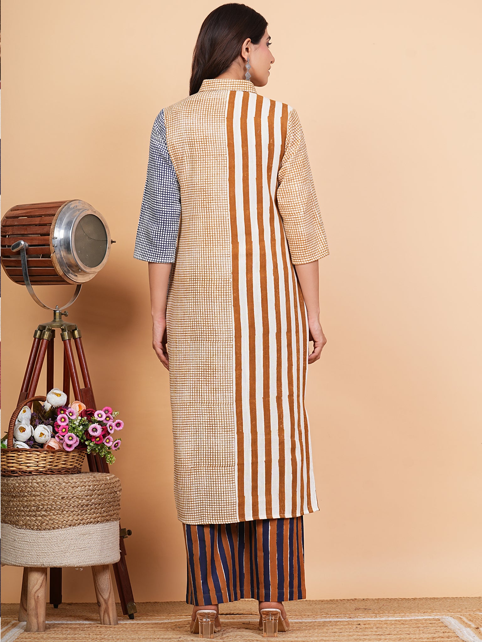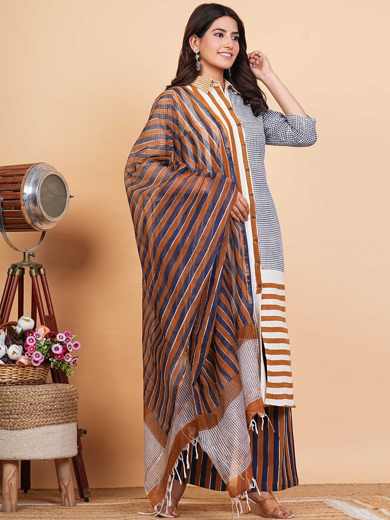 Product: This set contains Hand Block Printed Premium Cotton Slub Kurta, 100% Cotton Slub Pants and Kota Doria Dupatta.