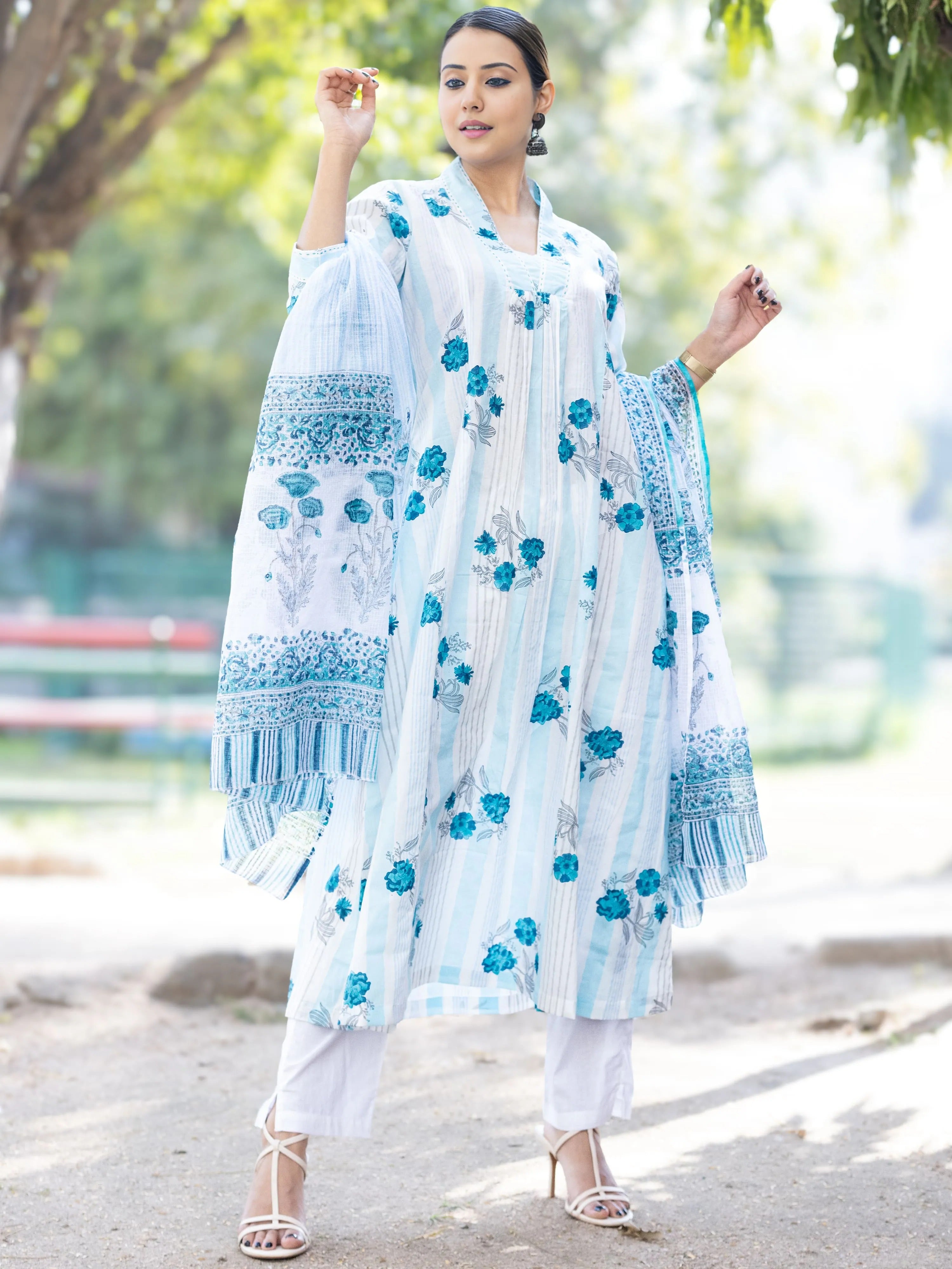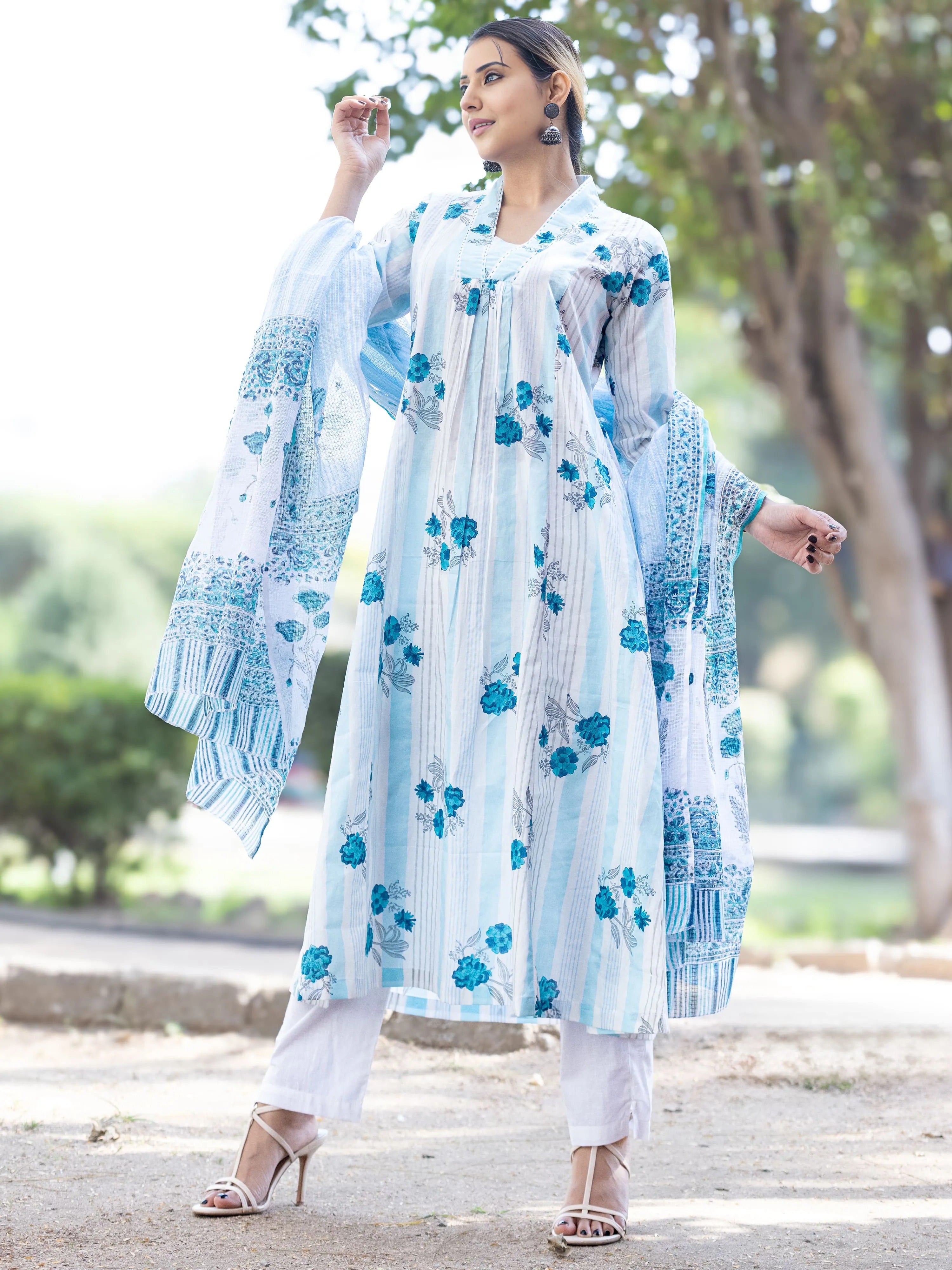 Product: This set contains Handcrafted Sanganeri Premium Cotton Kurta, 100% Cotton Pants and Kota Doria Dupatta.