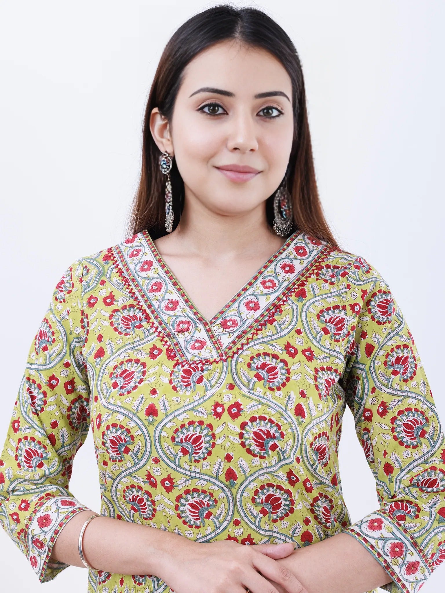 Product: Contains Hand Block Printed Cotton Kurta. Matching Pants/Bottoms and Dupatta are also available separately under BUY THE LOOK section.