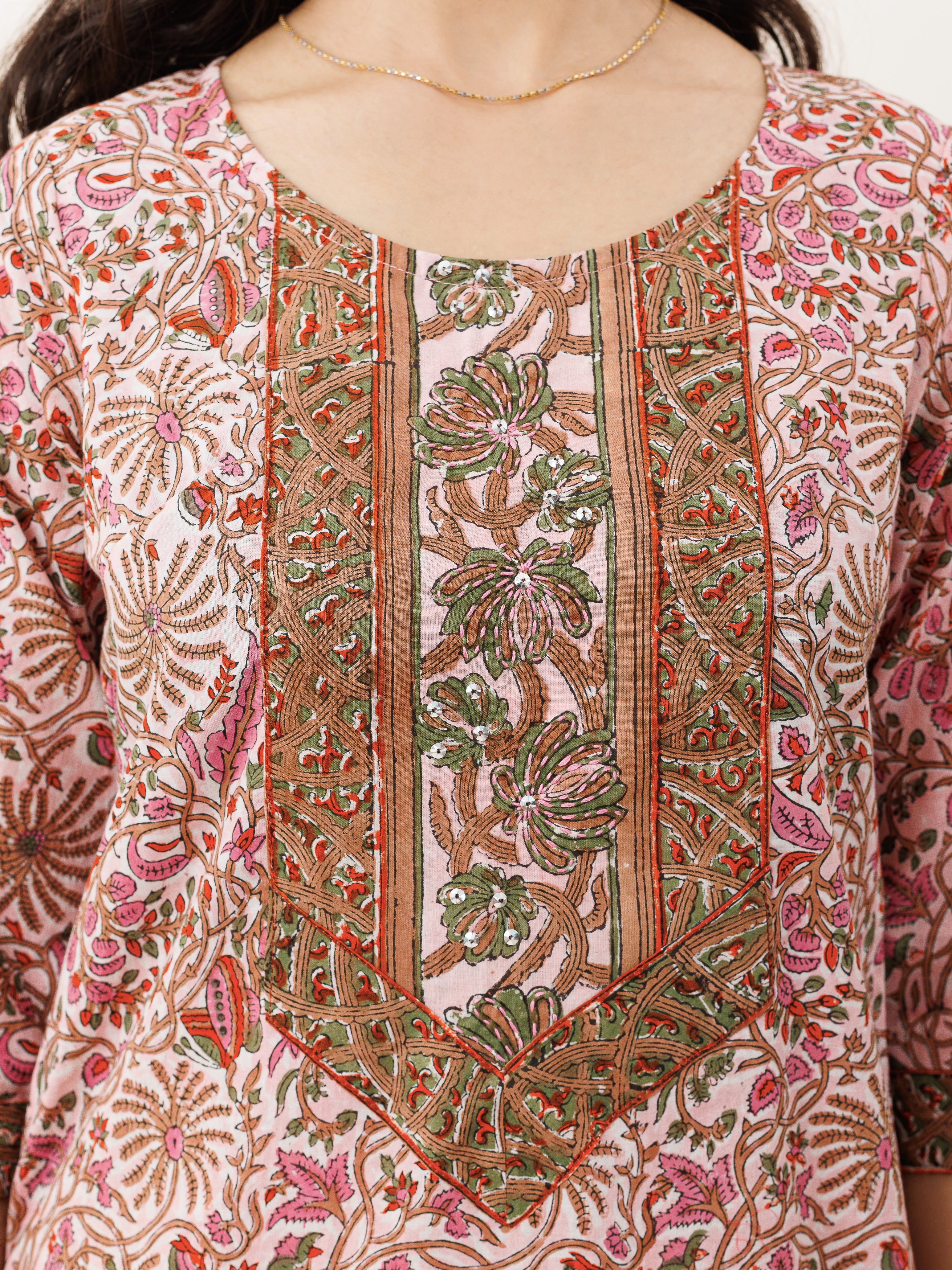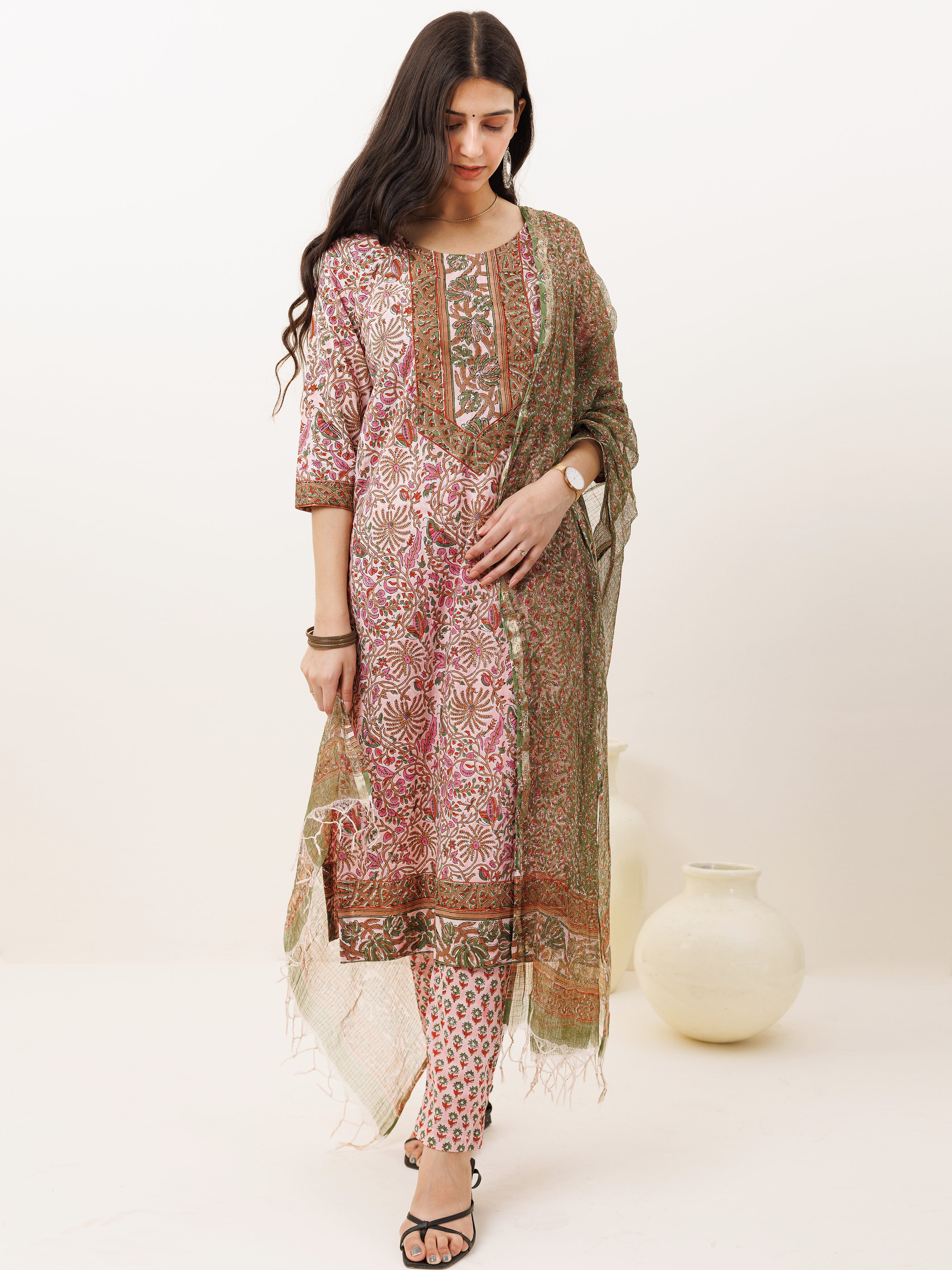 Product: This set contains Handcrafted Sanganeri Premium Cotton Kurta, 100% Cotton Pants and Kota Doria Dupatta.
