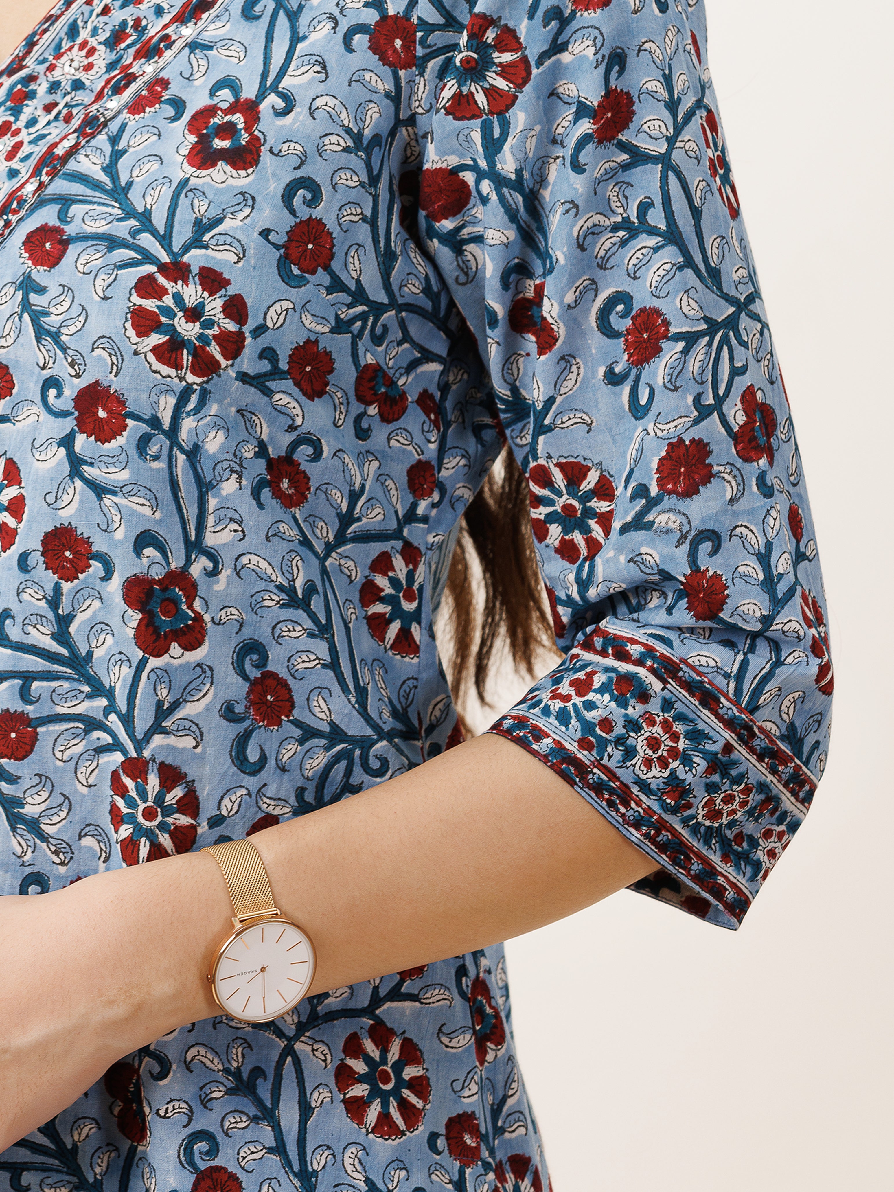 Product: Contains Hand Block Printed Cotton Kurta. Matching Pants/Bottoms and Dupatta are also available separately under BUY THE LOOK section.