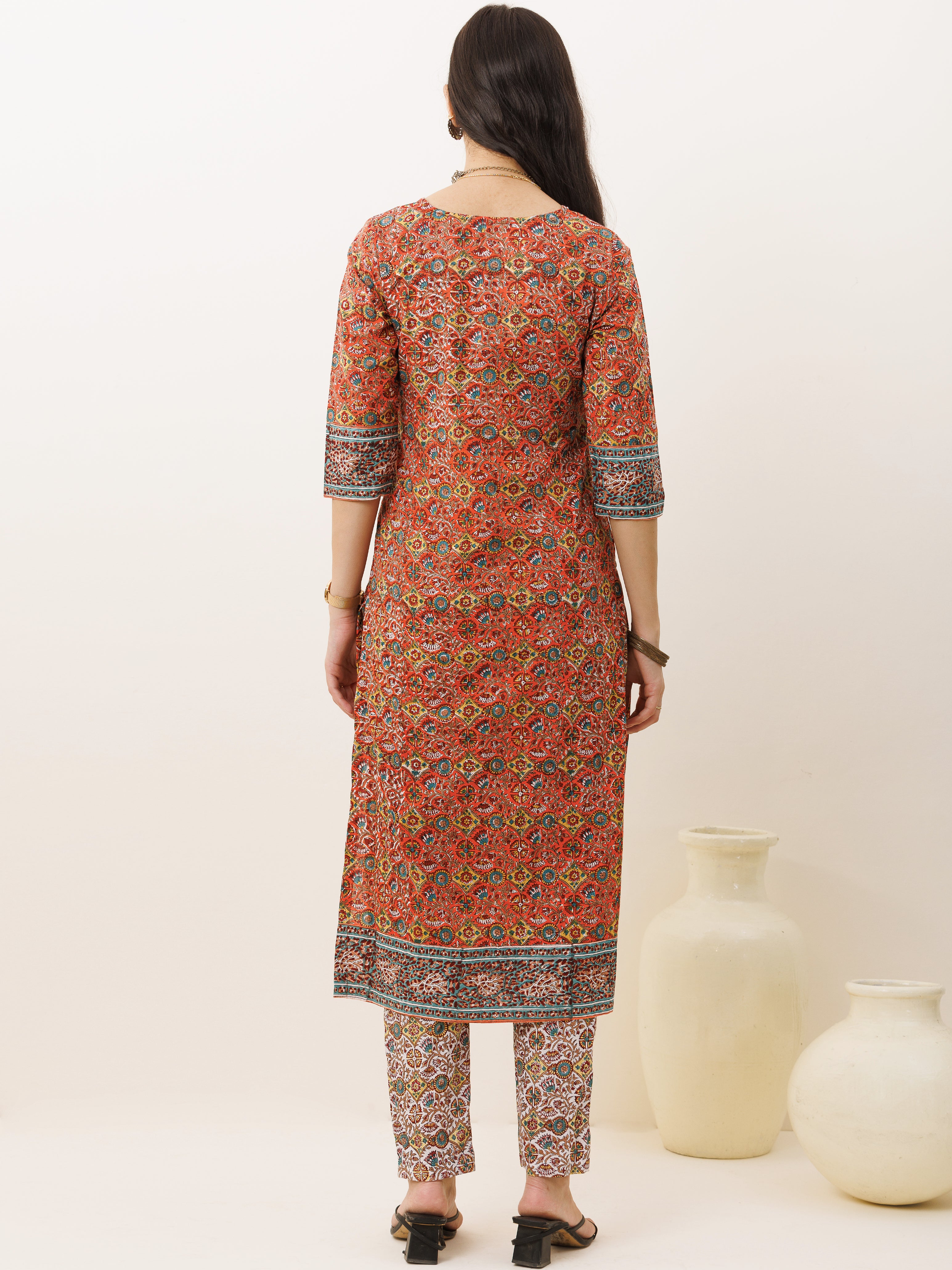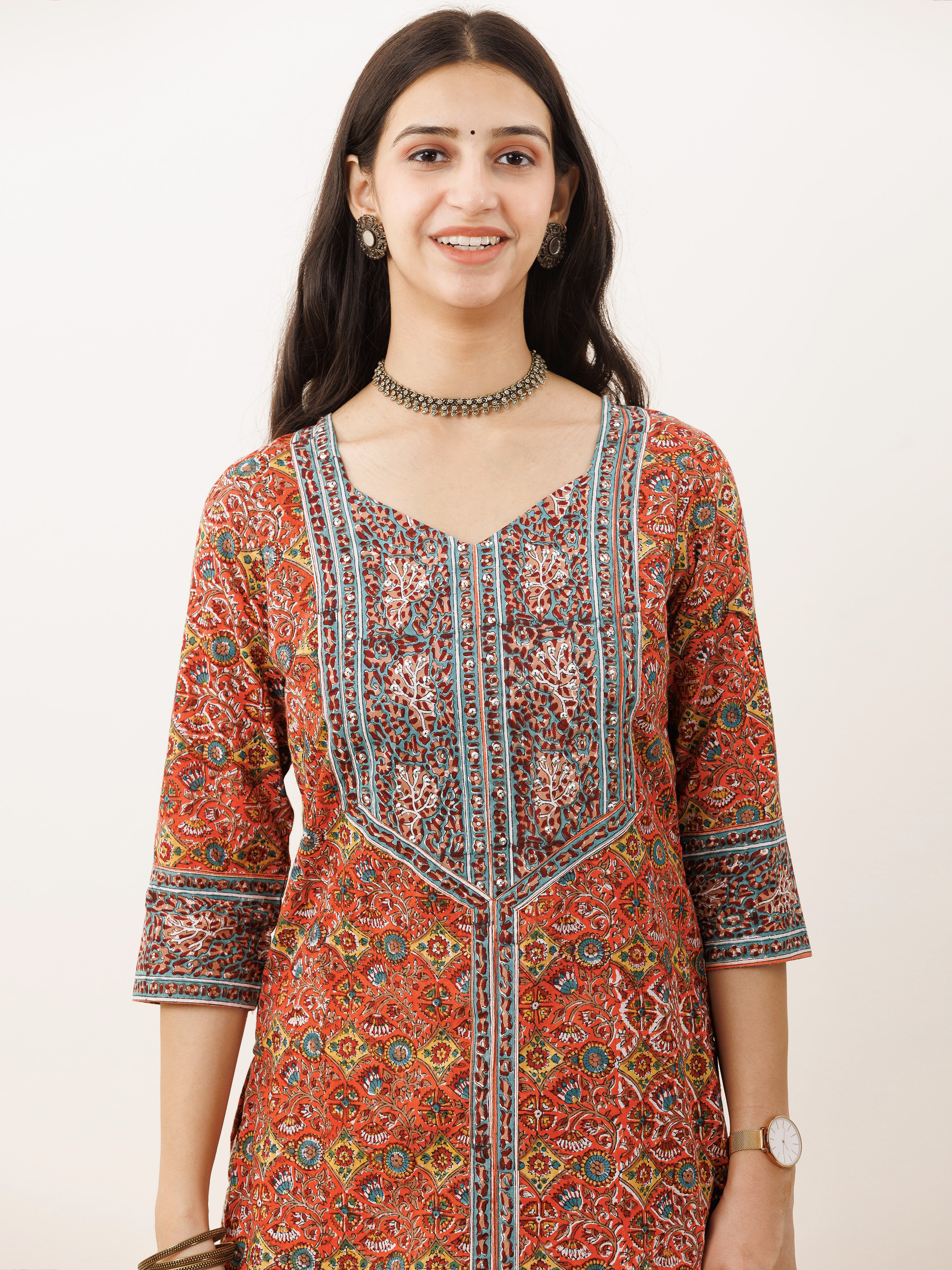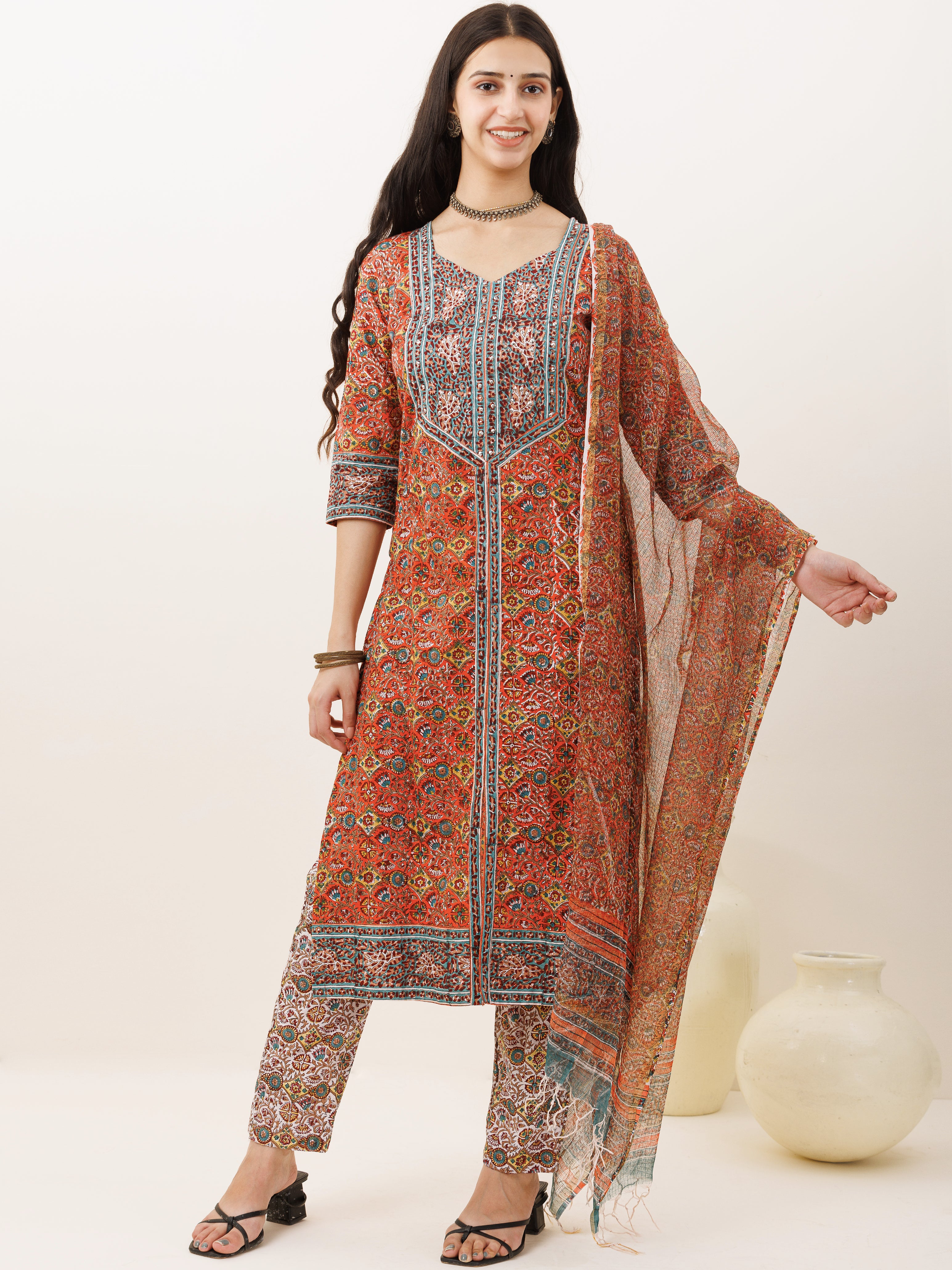 Product: This set contains Handcrafted Sanganeri Premium Cotton Kurta, 100% Cotton Pants and Kota Doria Dupatta.
