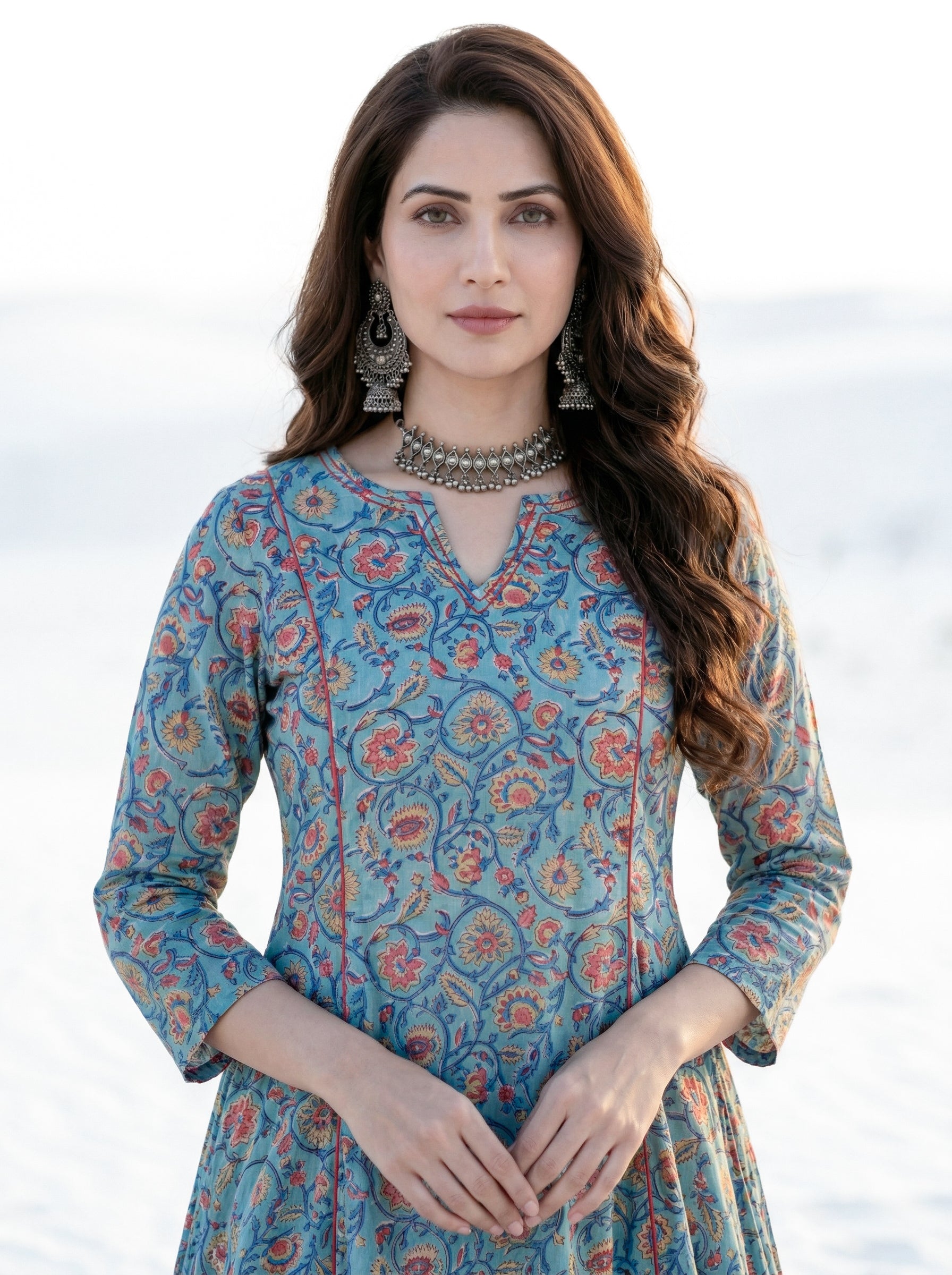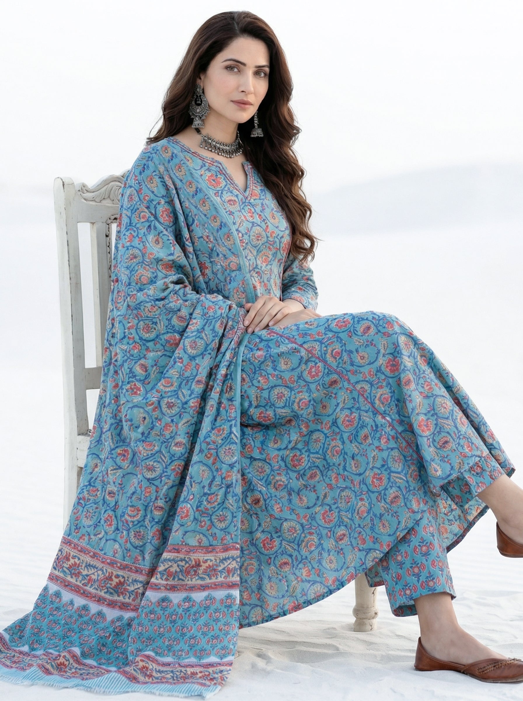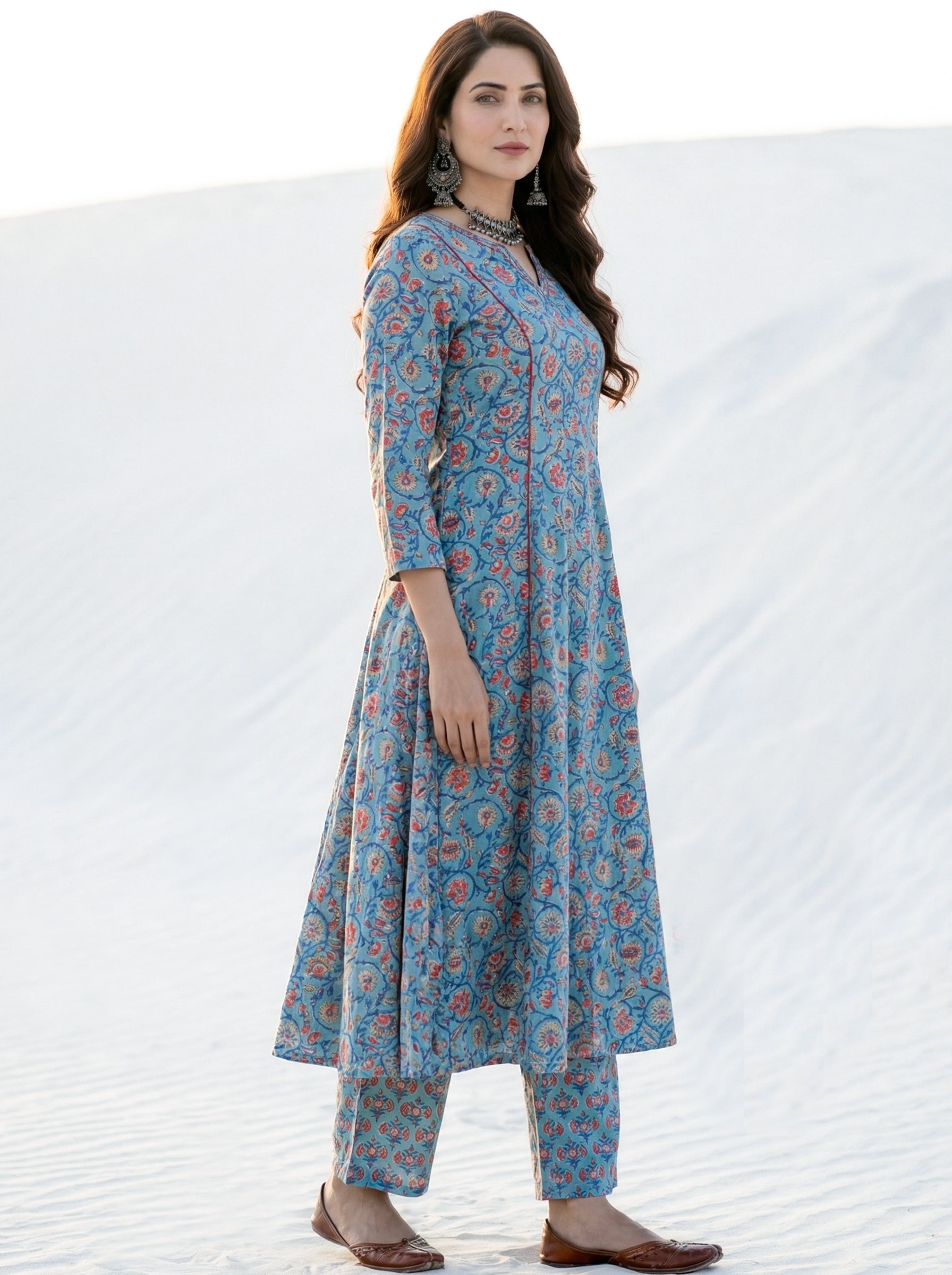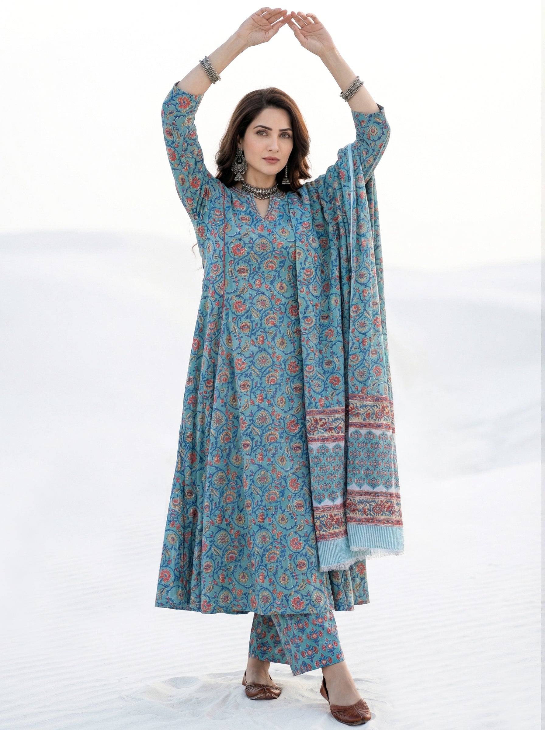 Product: This set contains Hand Block Printed Premium Cotton Kurta, 100% Cotton Pants and Kota Doria Dupatta.