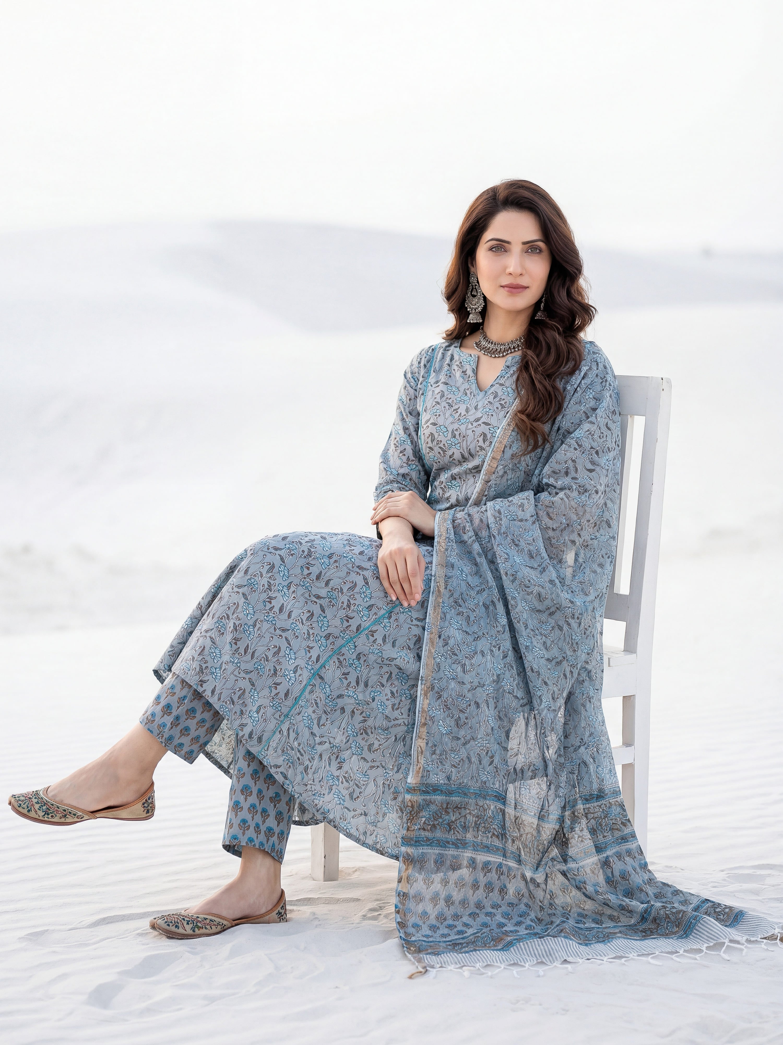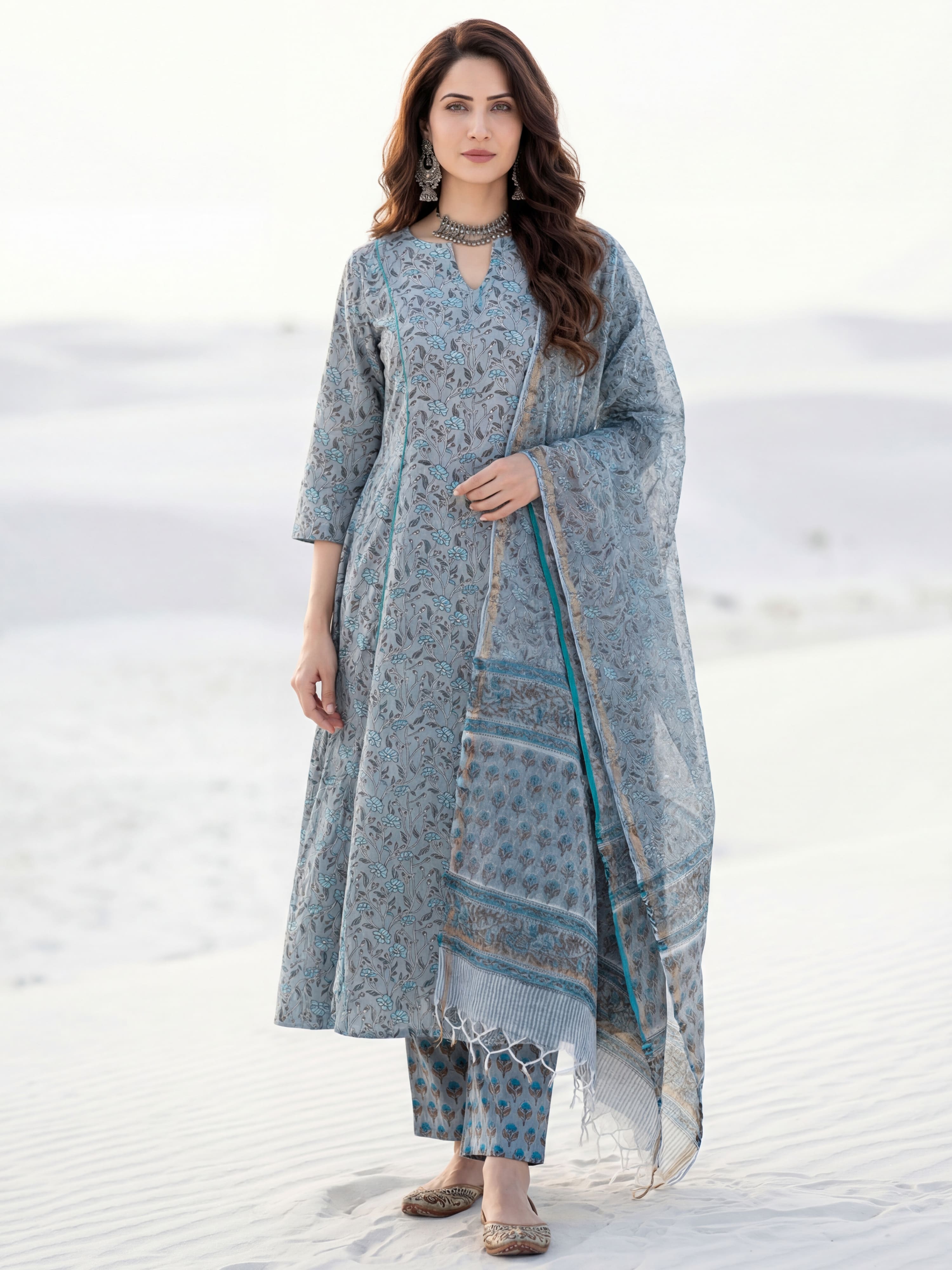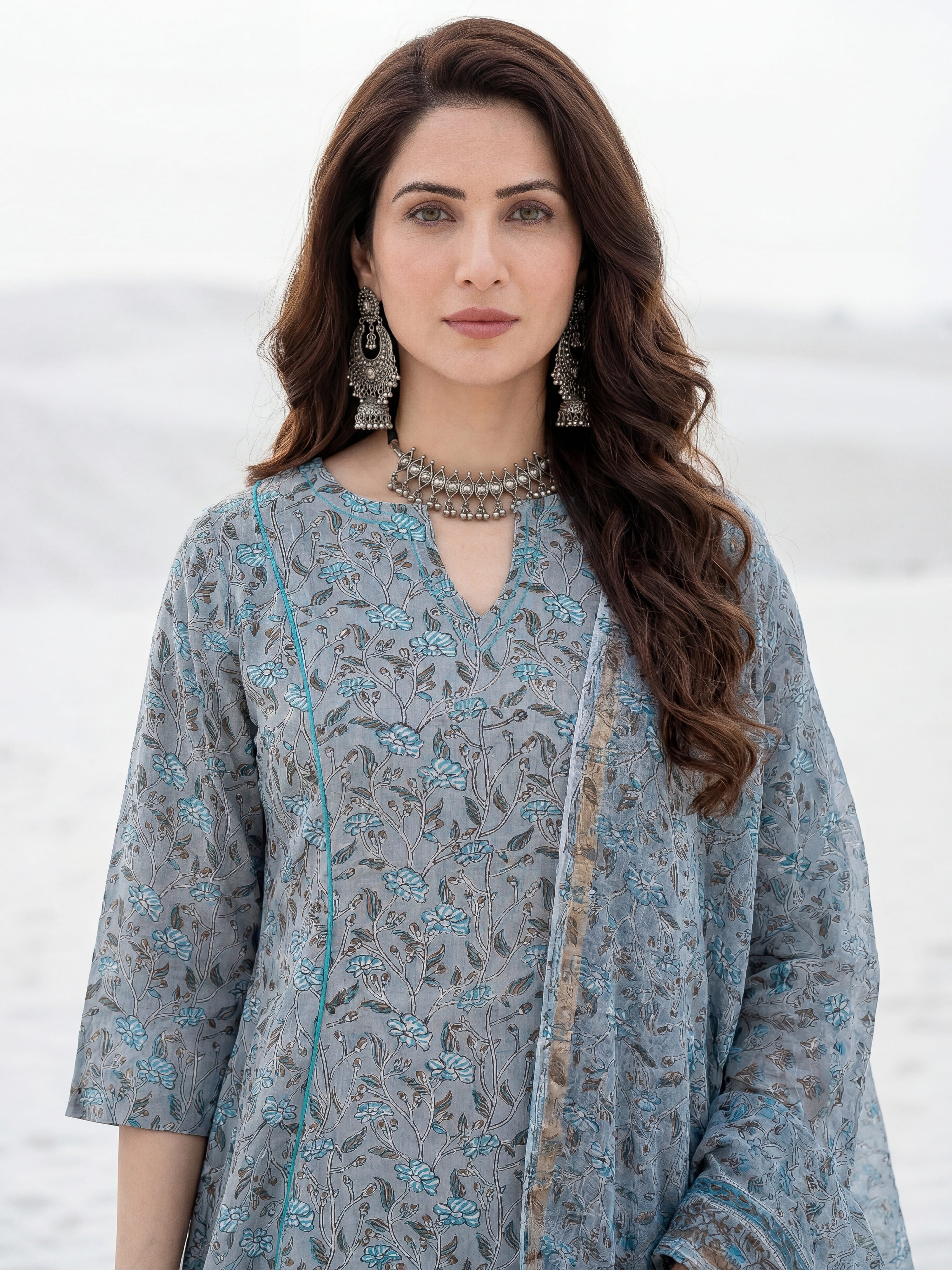 Product: This set contains Hand Block Printed Premium Cotton Kurta, 100% Cotton Pants and Kota Doria Dupatta.