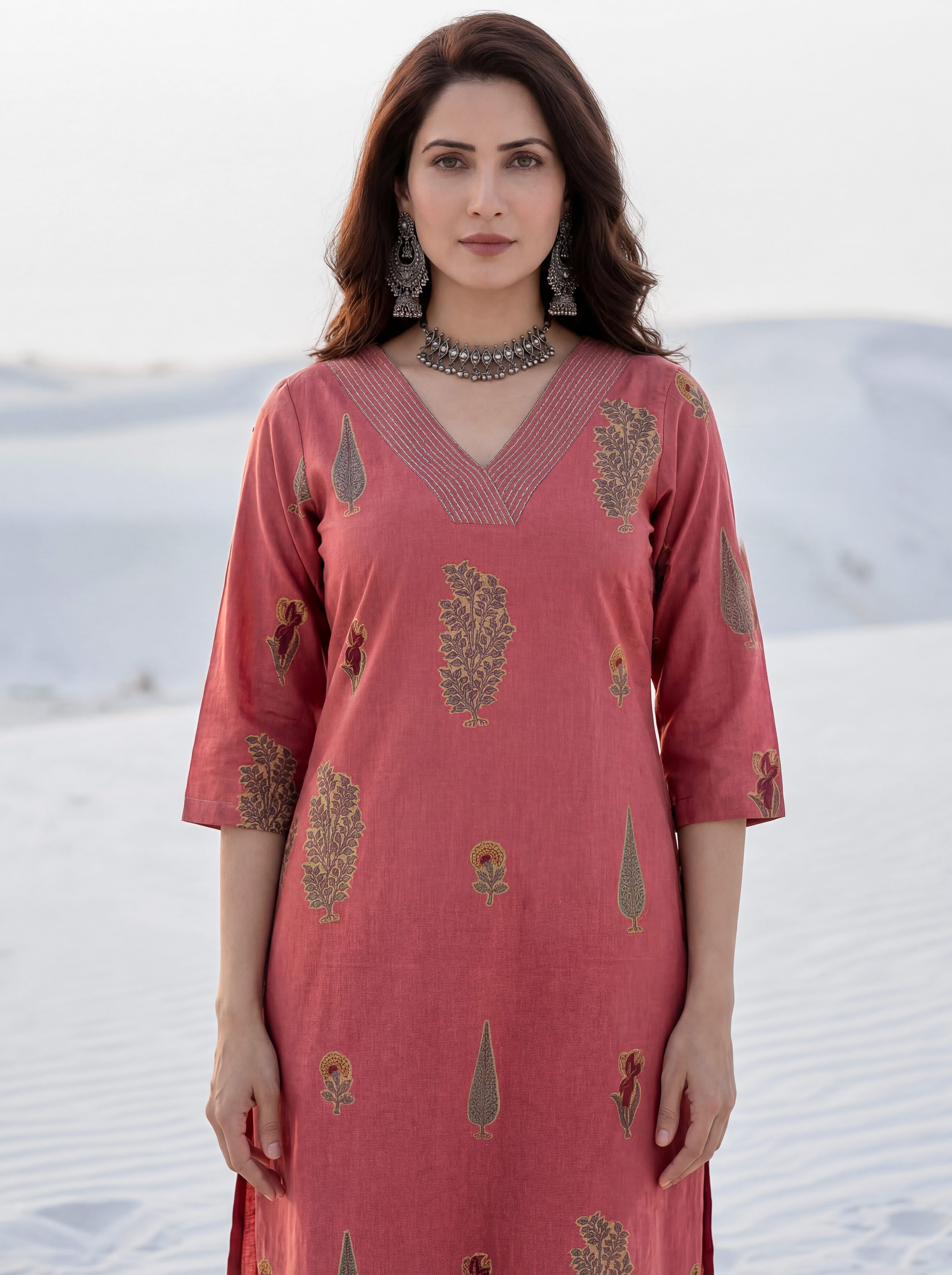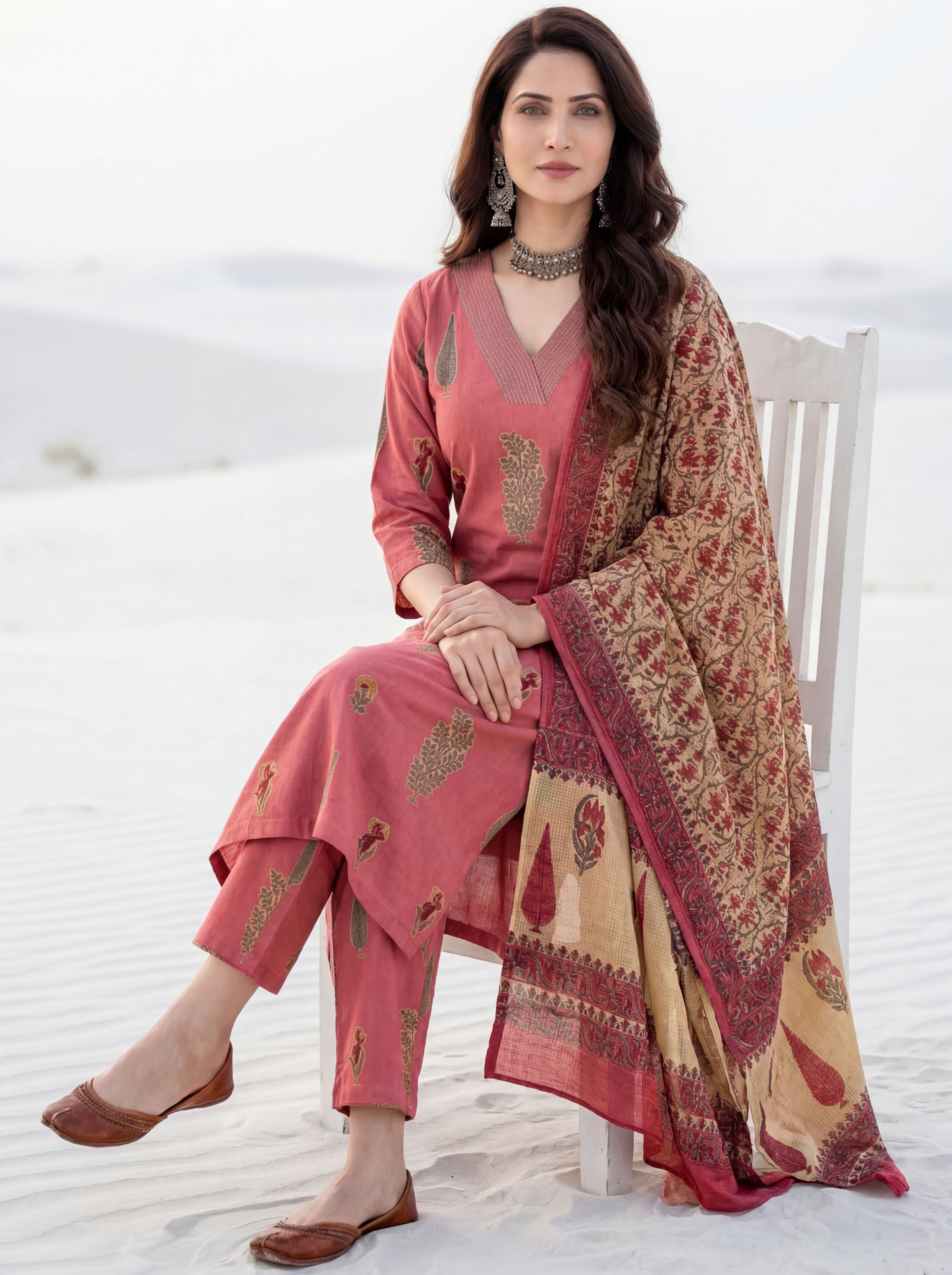 Product: This set contains Handcrafted Sanganeri Premium Cotton Linen Kurta, 100% Cotton Linen Pants and Kota Doria Dupatta.