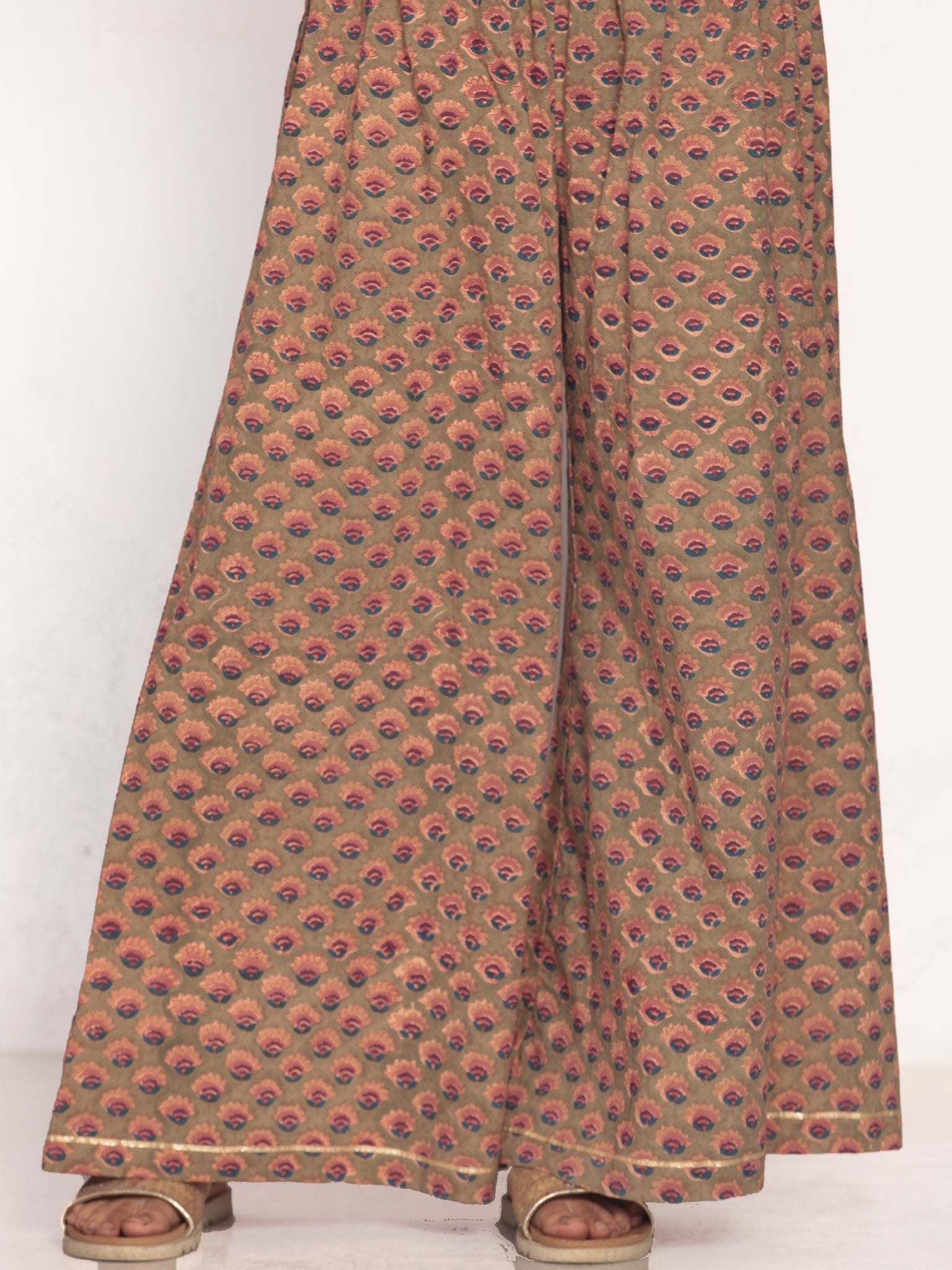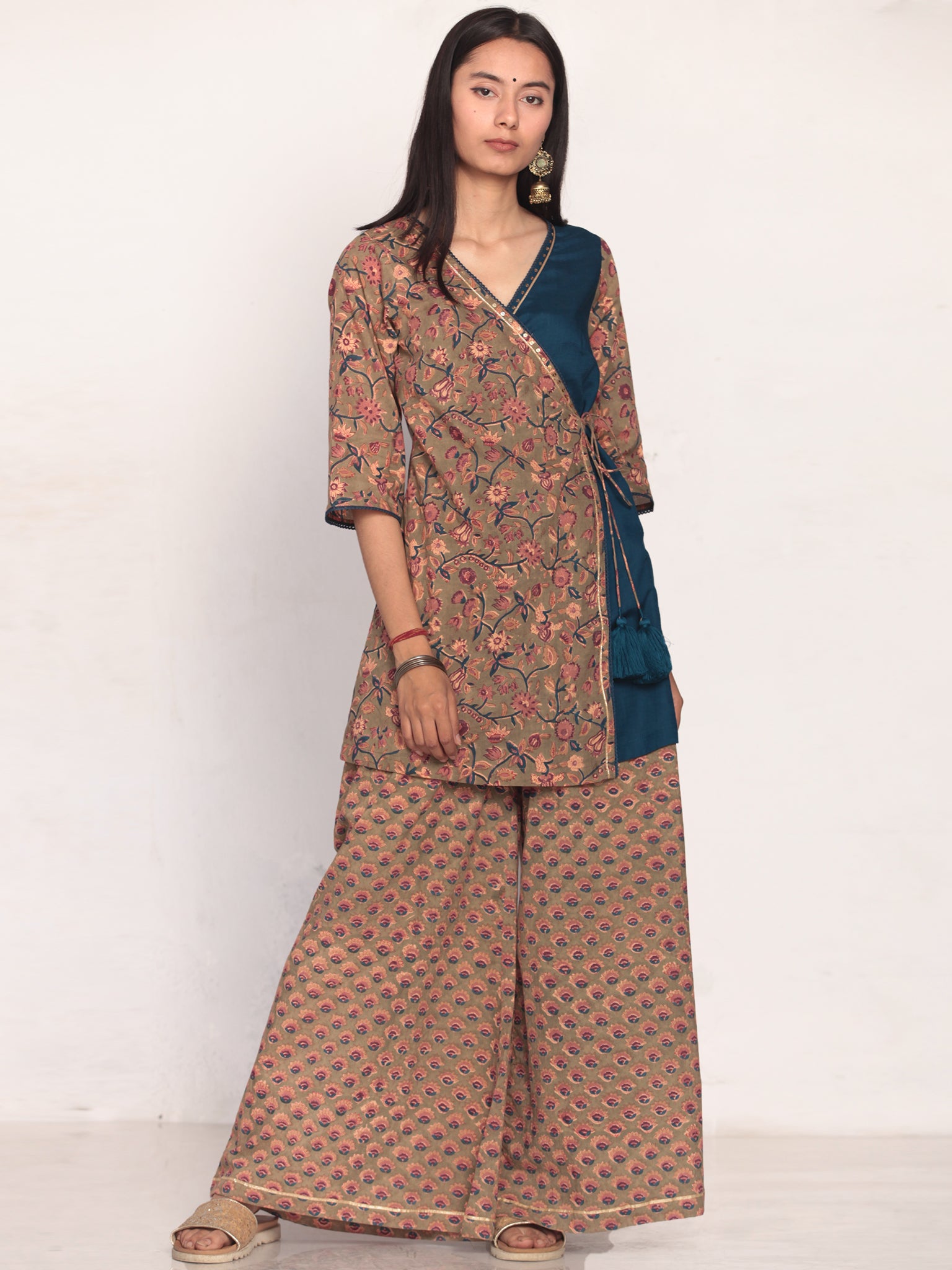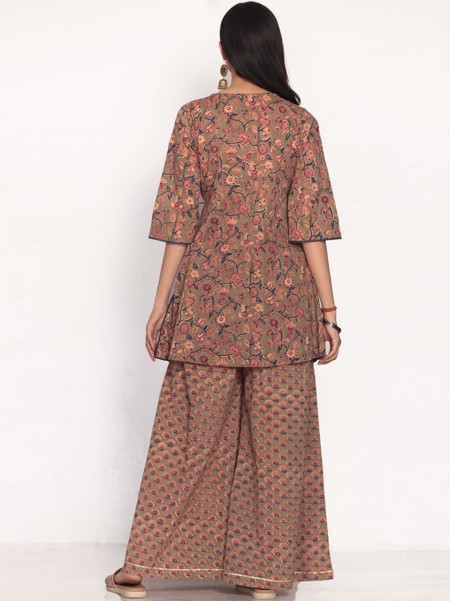 Product: This set contains Handcrafted Sanganeri Premium Cotton Kurta, Sharara and Kota Doria Dupatta