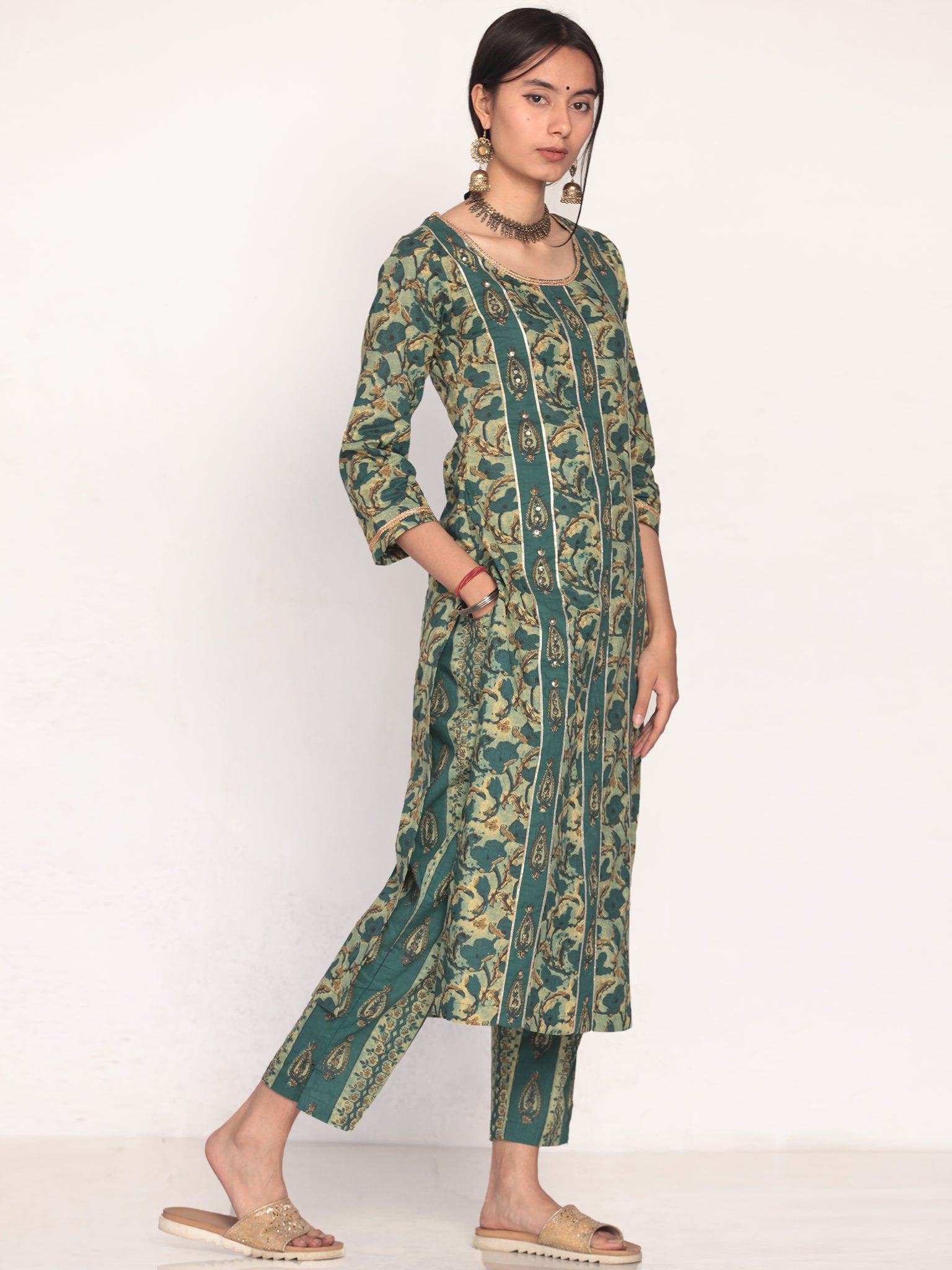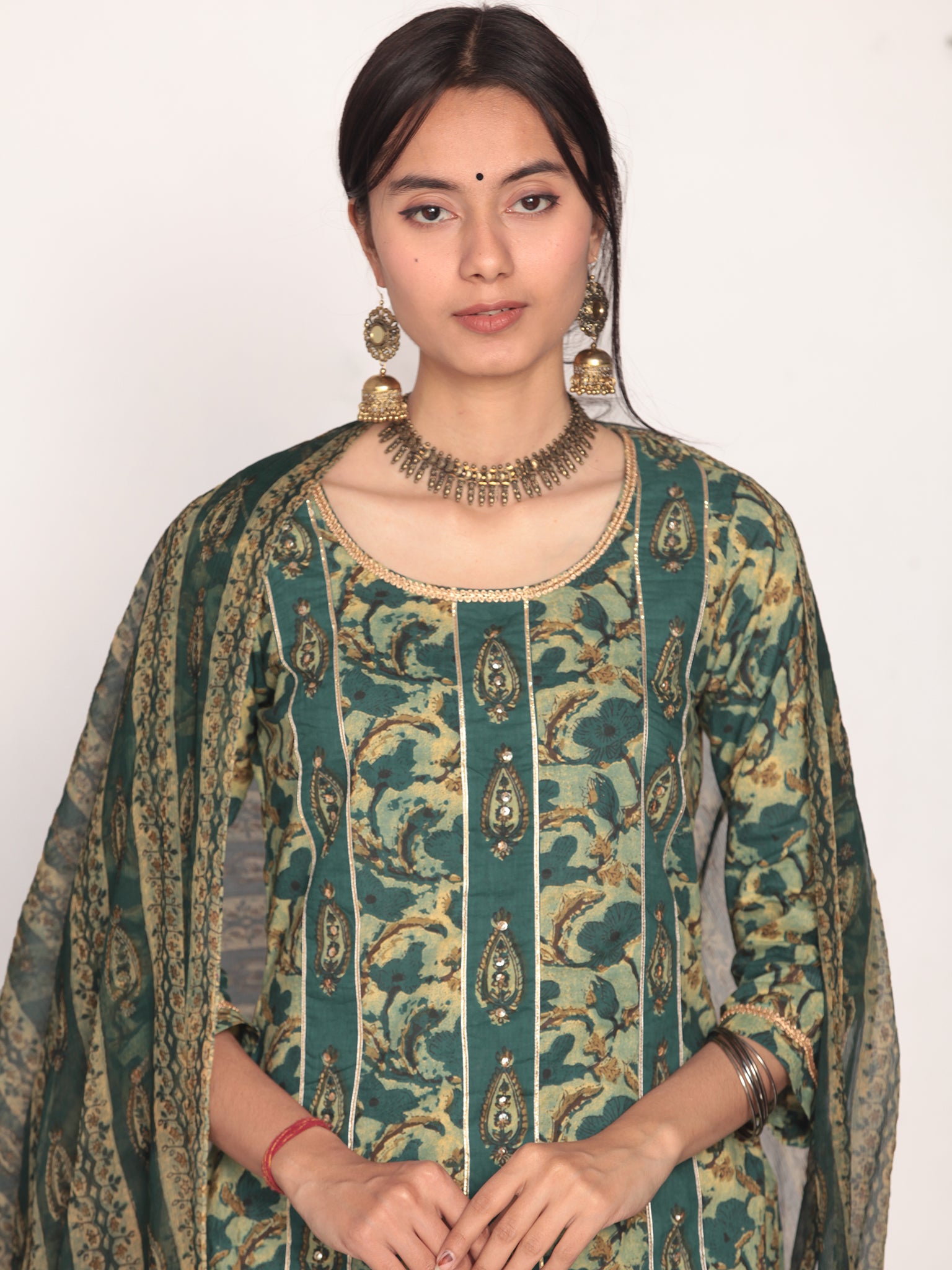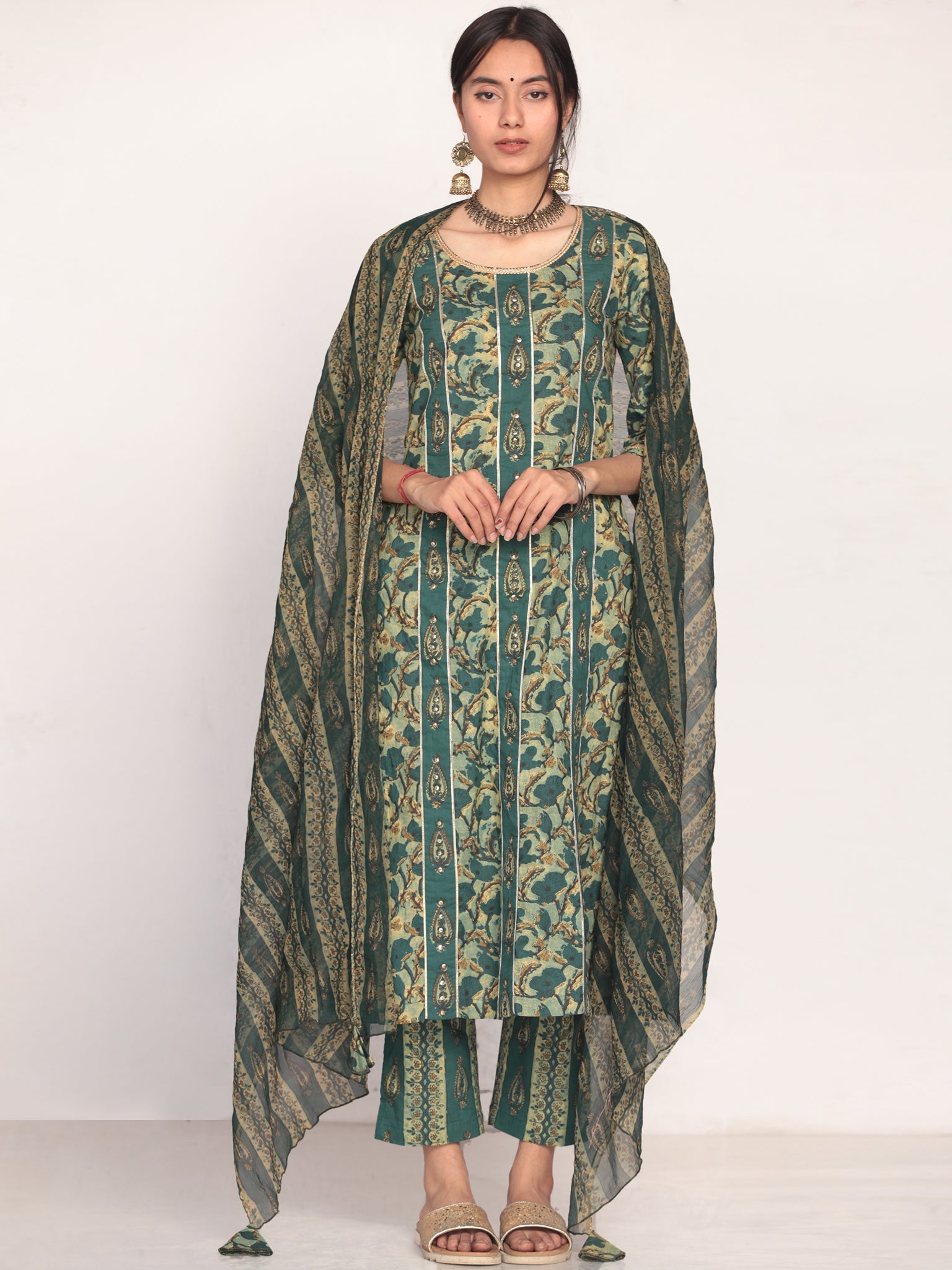 Product: This set contains Handcrafted Sanganeri Premium Cotton Kurta, 100% Cotton Pants and Chiffon Dupatta.