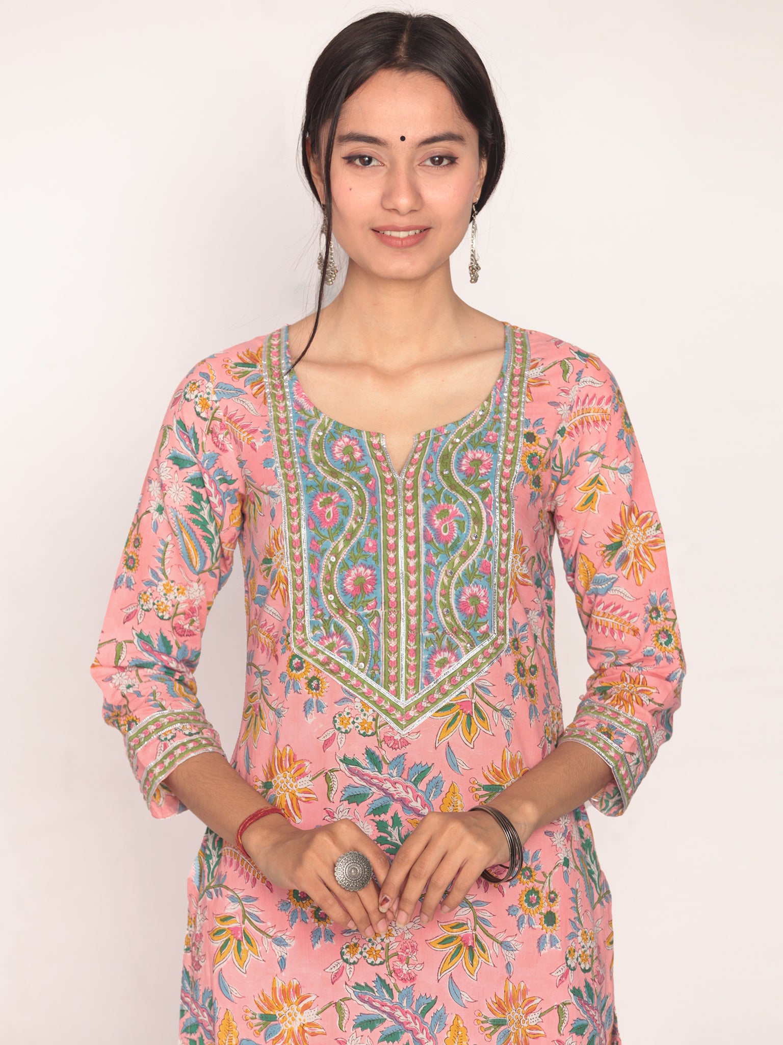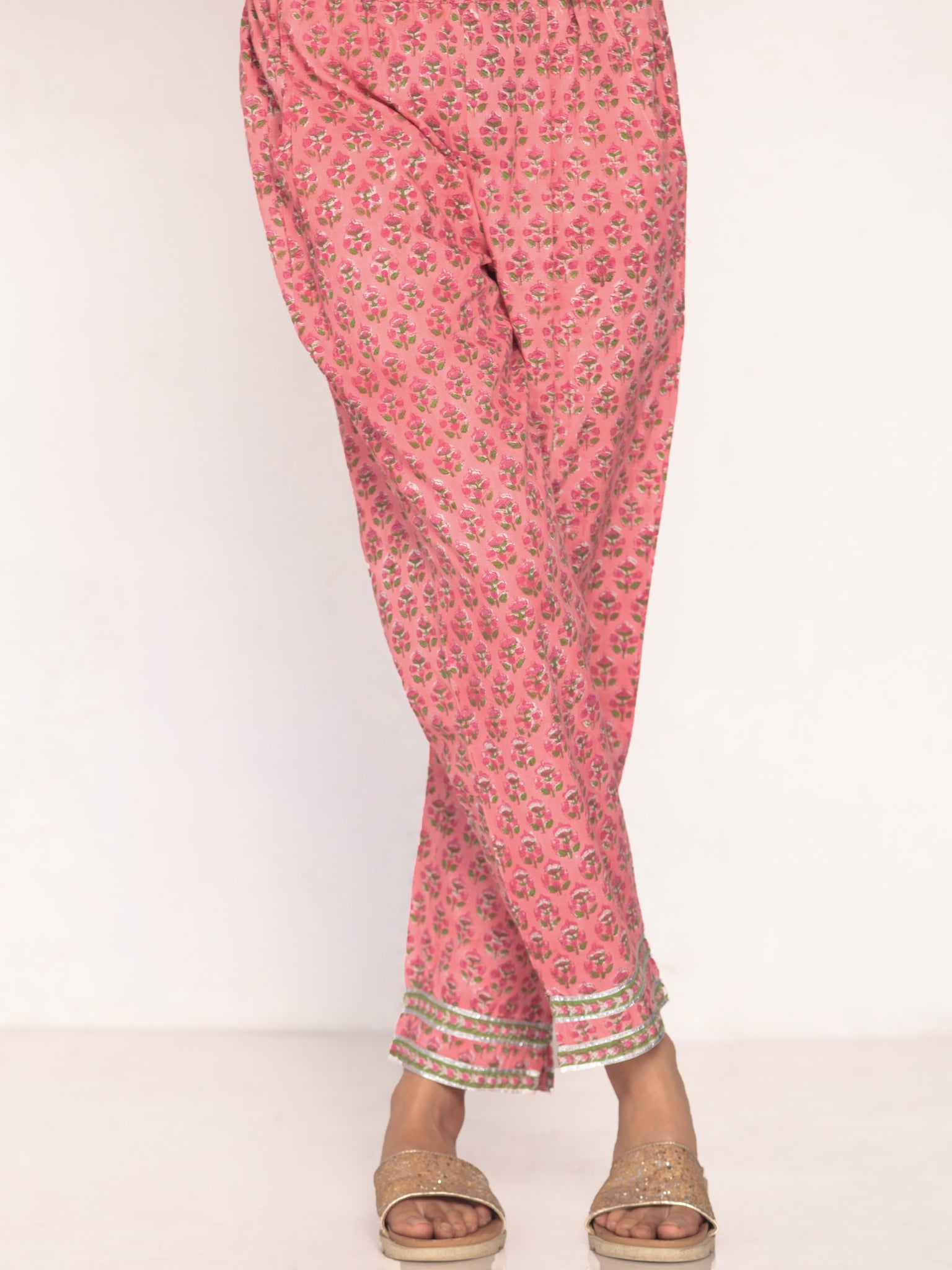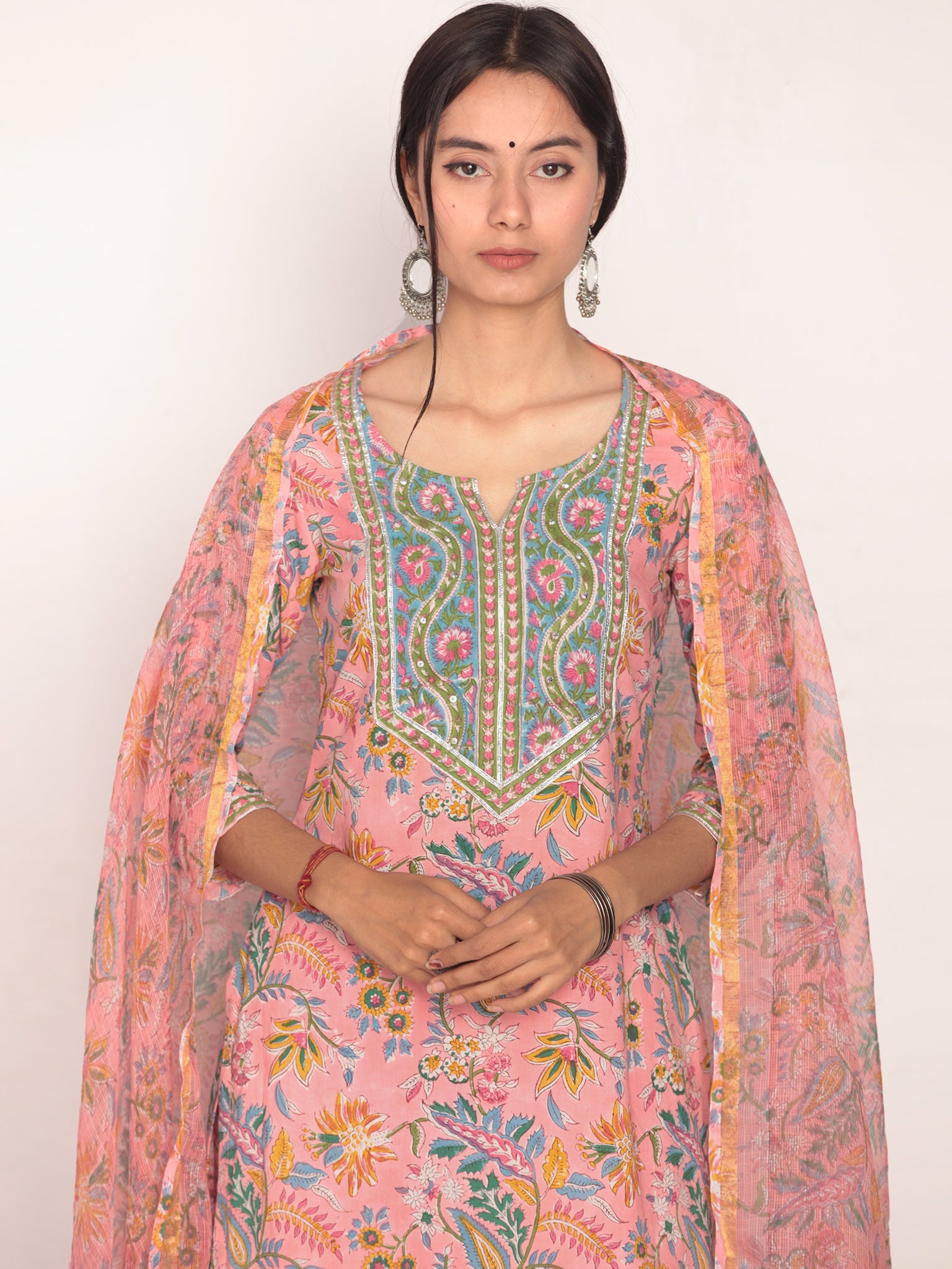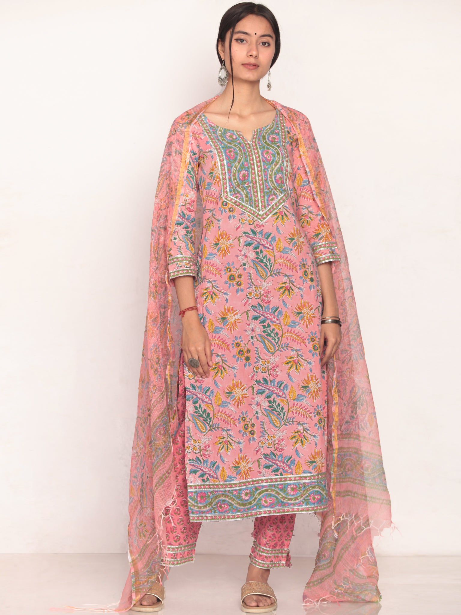 Product: This set contains Handcrafted Sanganeri Premium Cotton Kurta, 100% Cotton Pants and Kota Doria Dupatta.