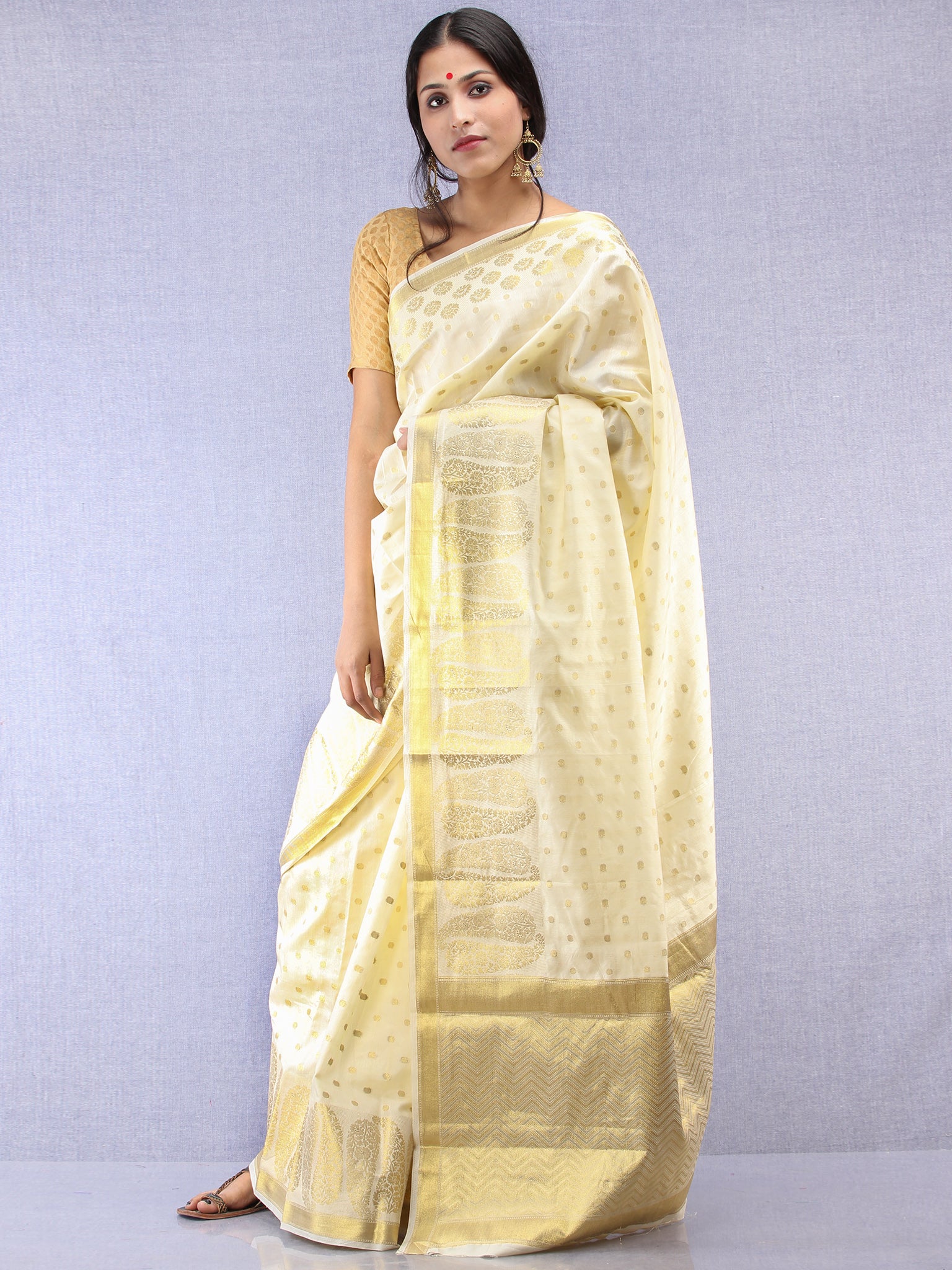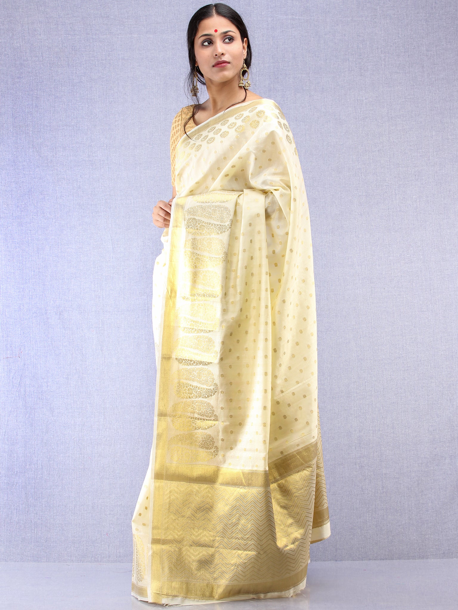 Banarasee Semi Silk Saree With Golden Zari Work - Ivory & Gold - S031704366