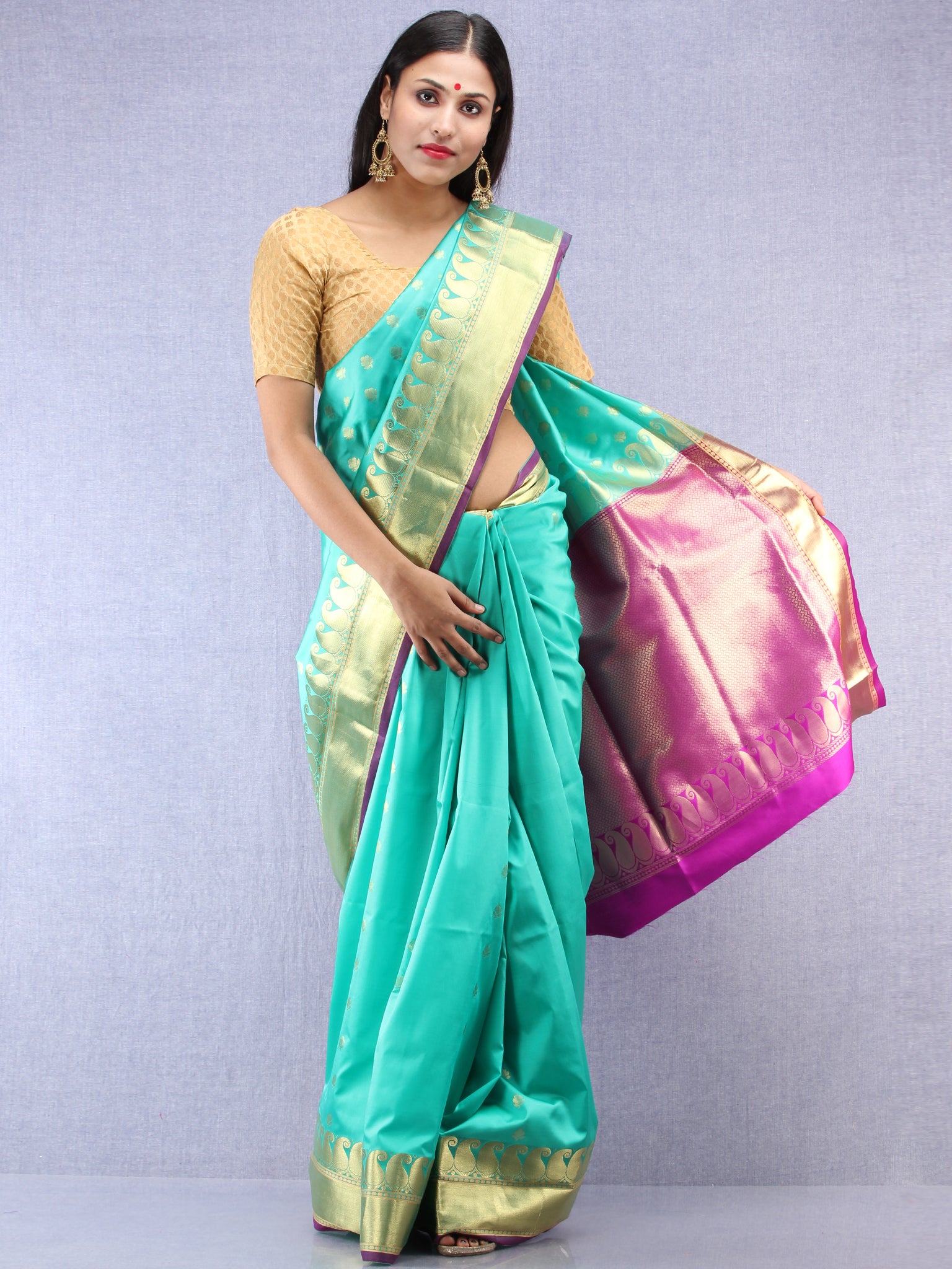 Banarasee Art Silk Saree With Zari Work - Sea Green Purple & Gold - S031704417