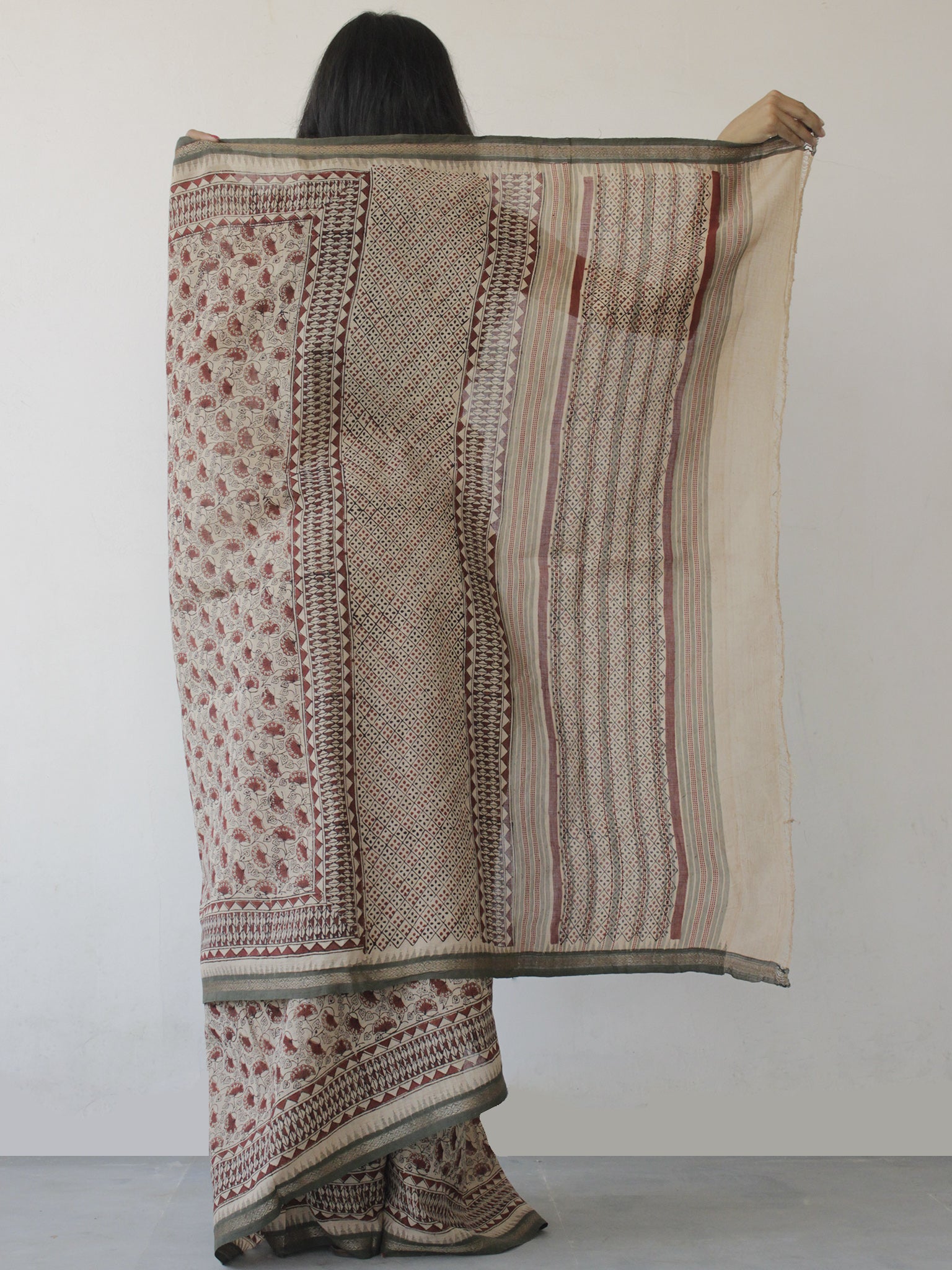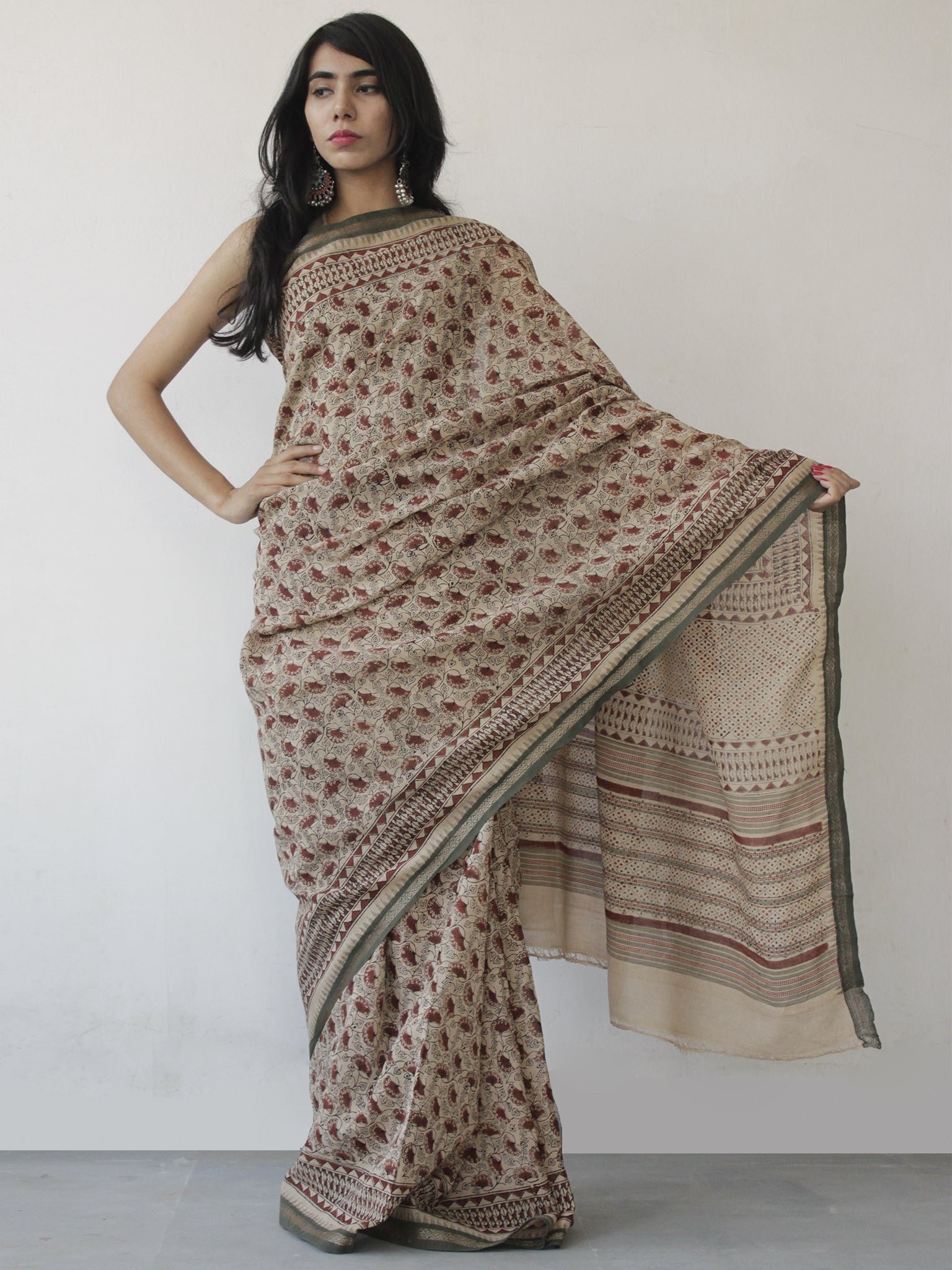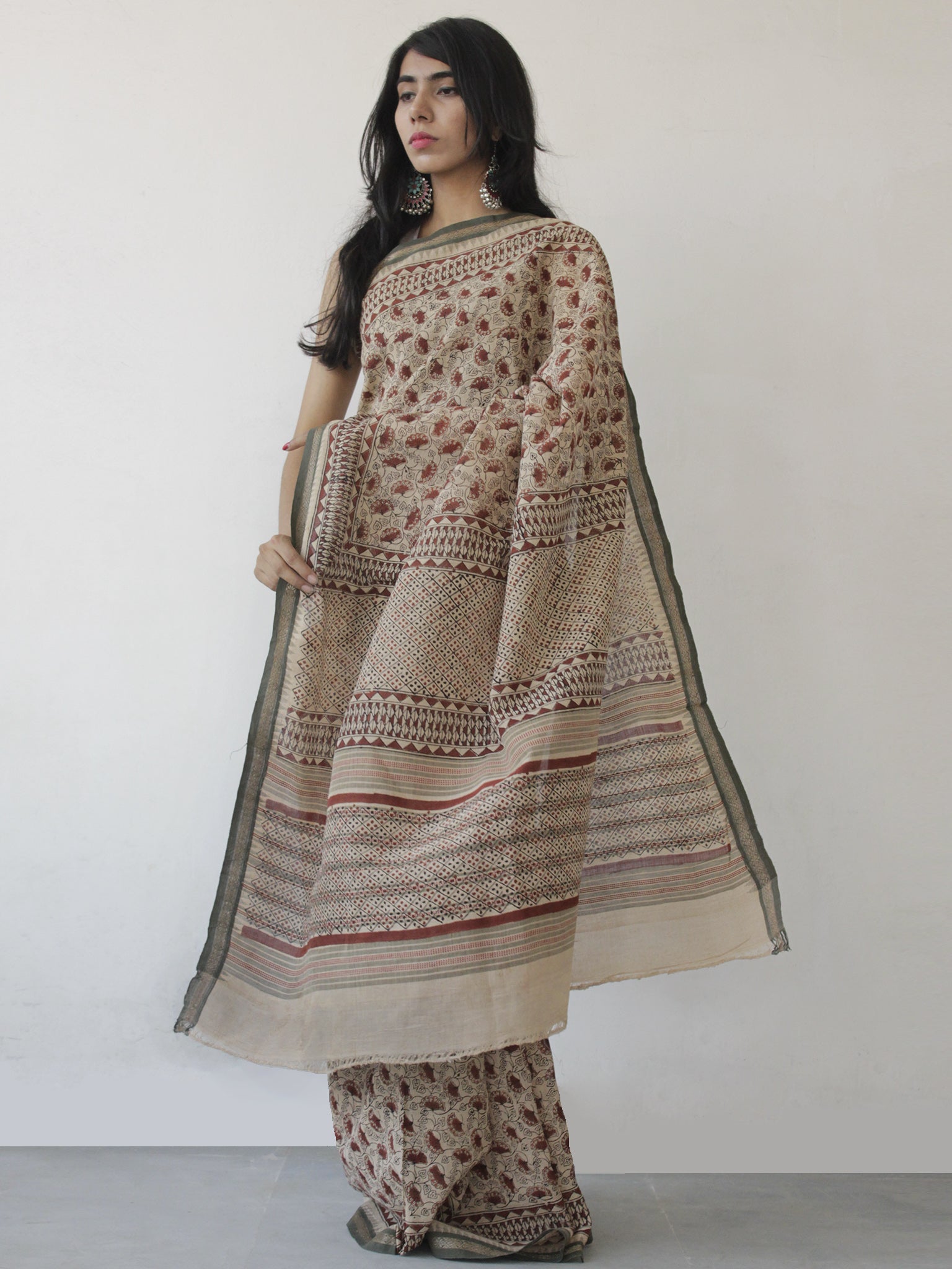 Beige Maroon Black Green Handloom Cotton Hand Block Printed Saree in Natural Dyes - S031702491