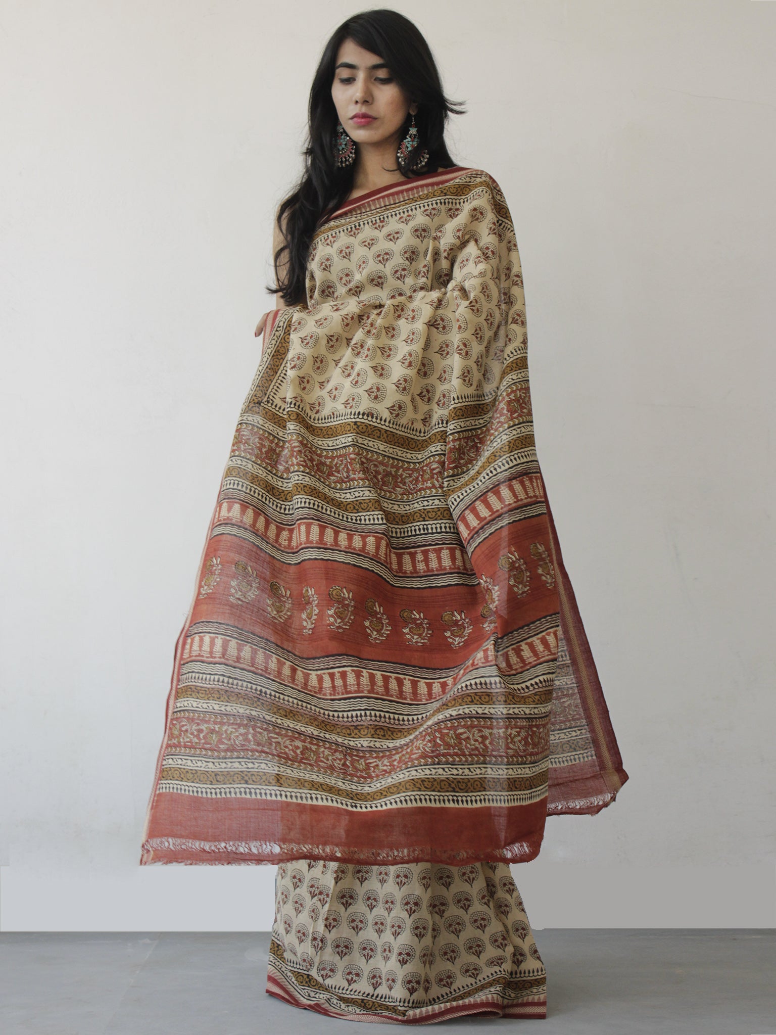Beige Maroon Black Handloom Cotton Hand Block Printed Saree in Natural Dyes - S031702480