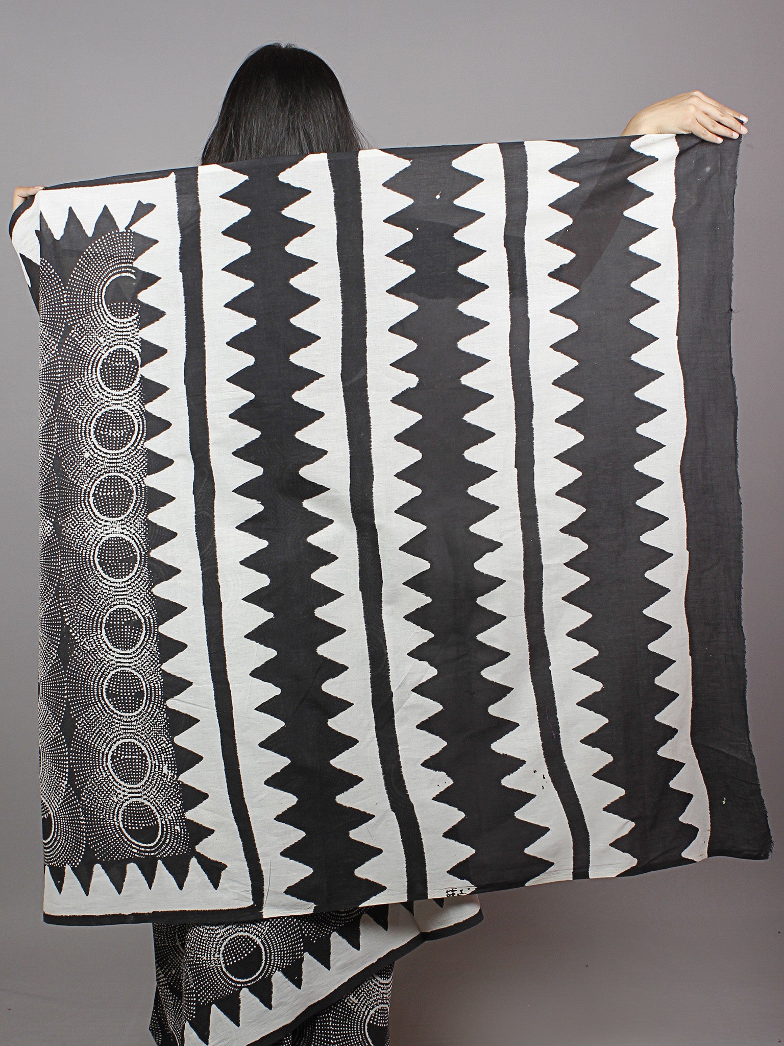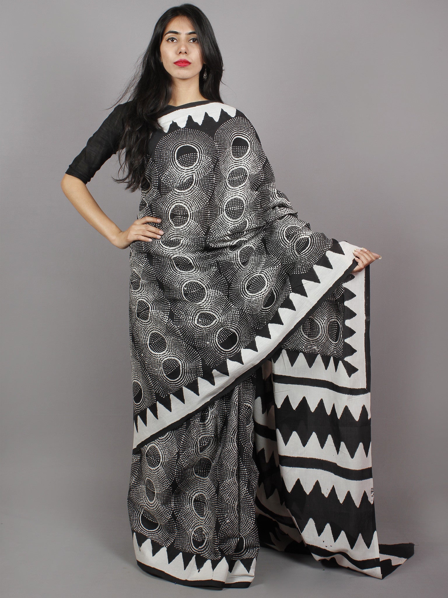 Black White Grey Hand Block Printed Cotton Mul Saree - S031701343