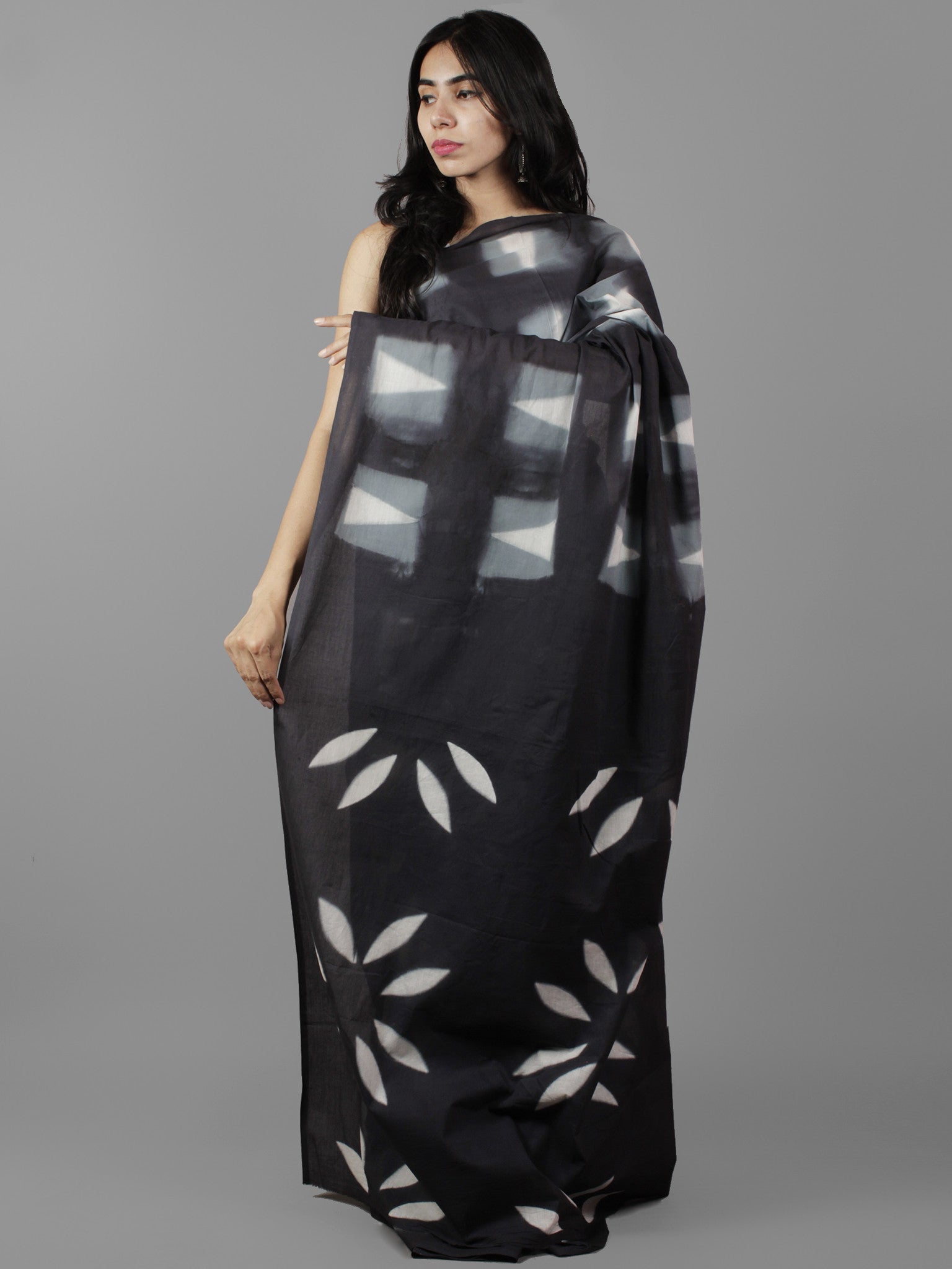 Black White Grey Shibori Dyed Cotton Saree - S031702065