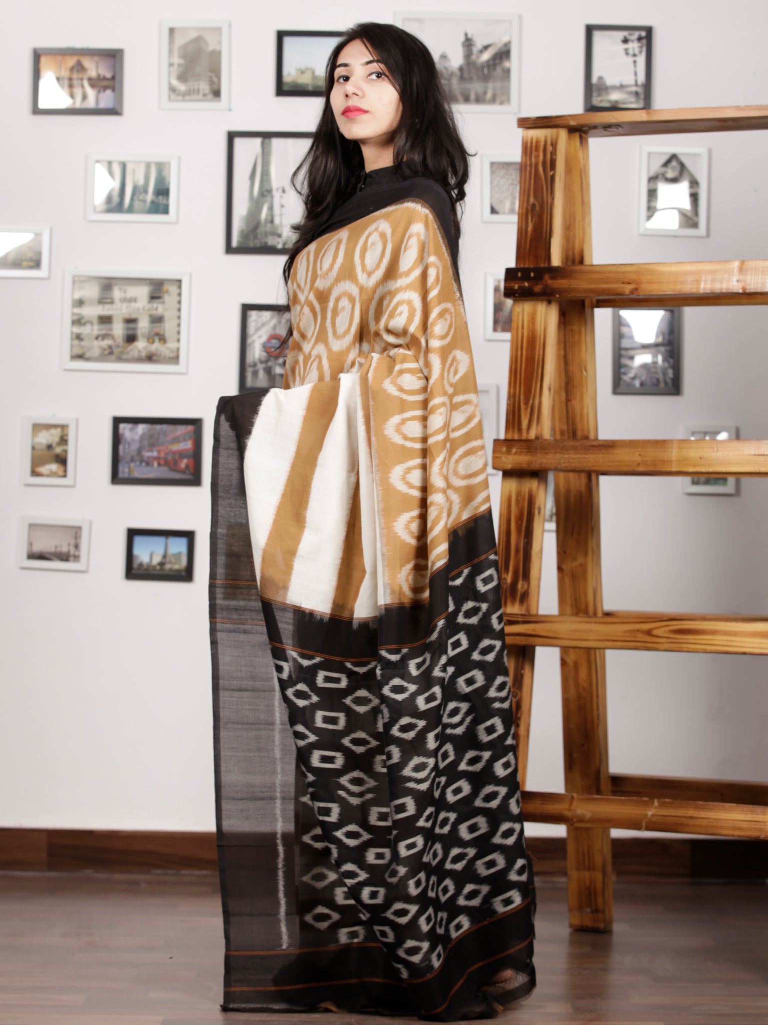Olive Green Black Ivory Ikat Handwoven Pochampally Mercerized Cotton Saree - S031701429