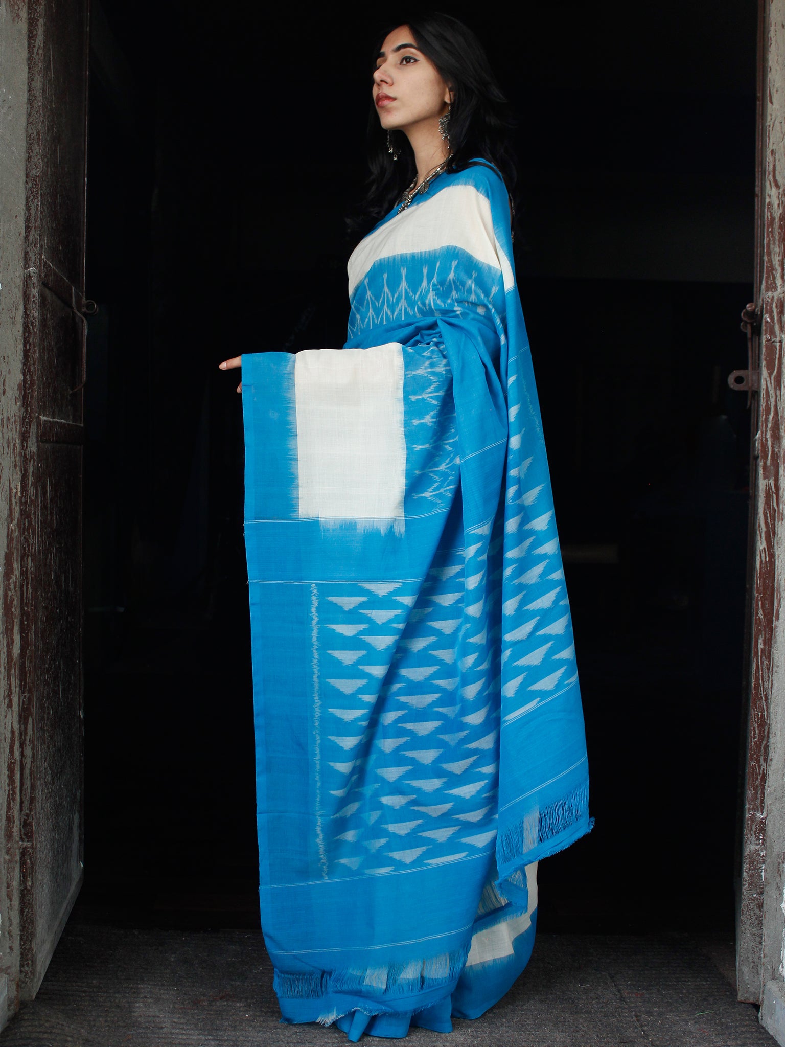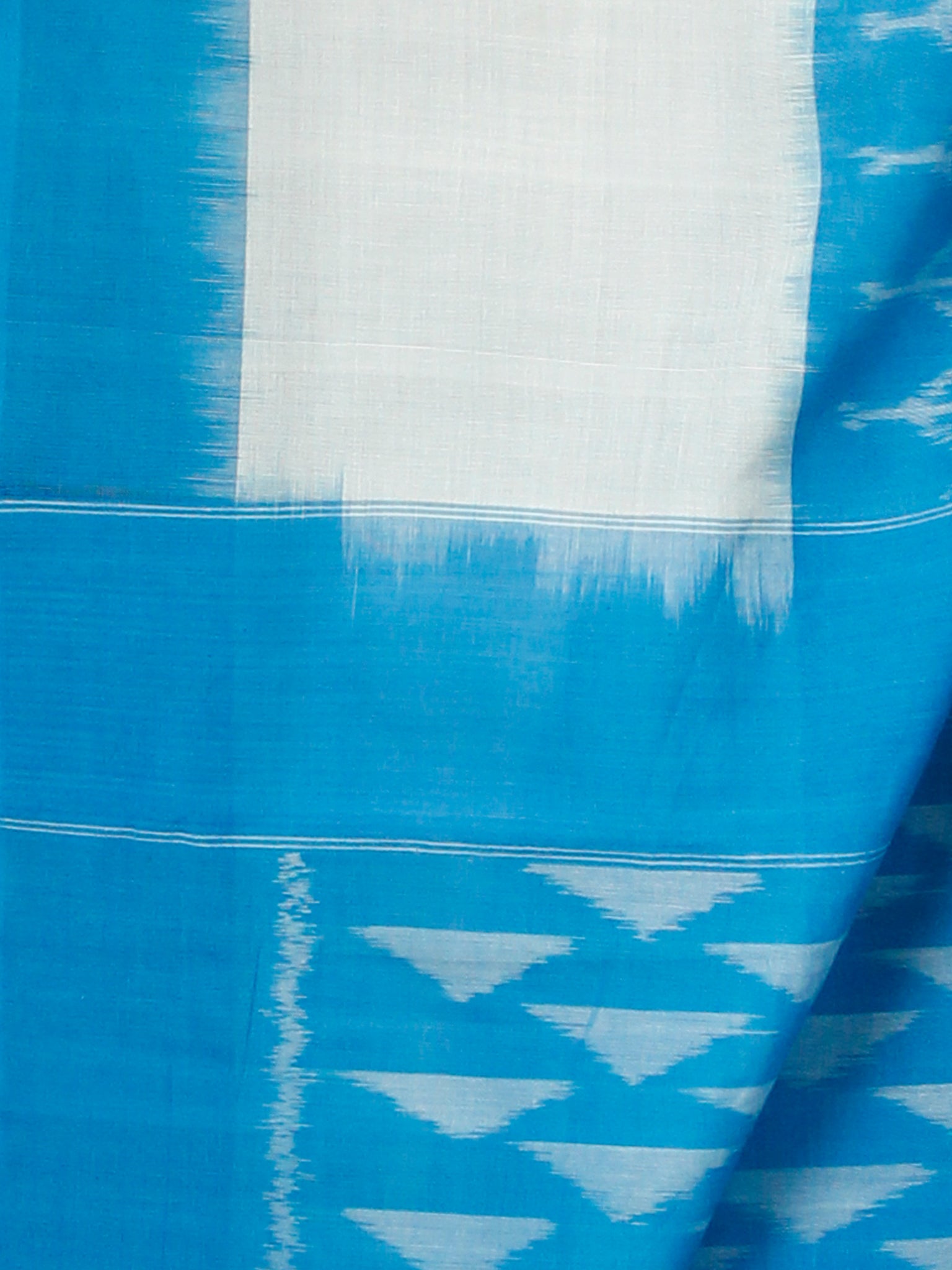 Sky Blue White Ikat Handwoven Mercerised Cotton Saree - S031703535