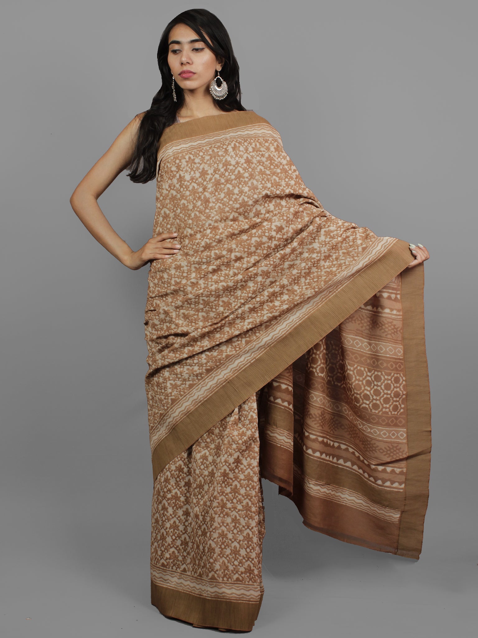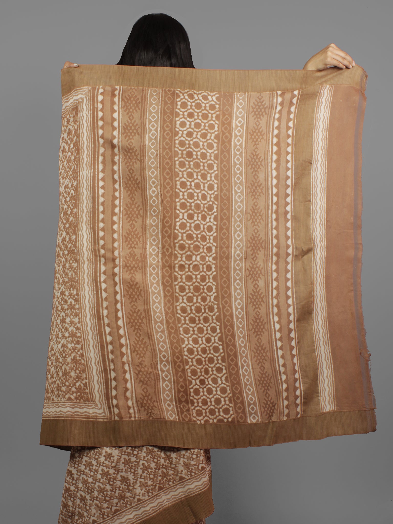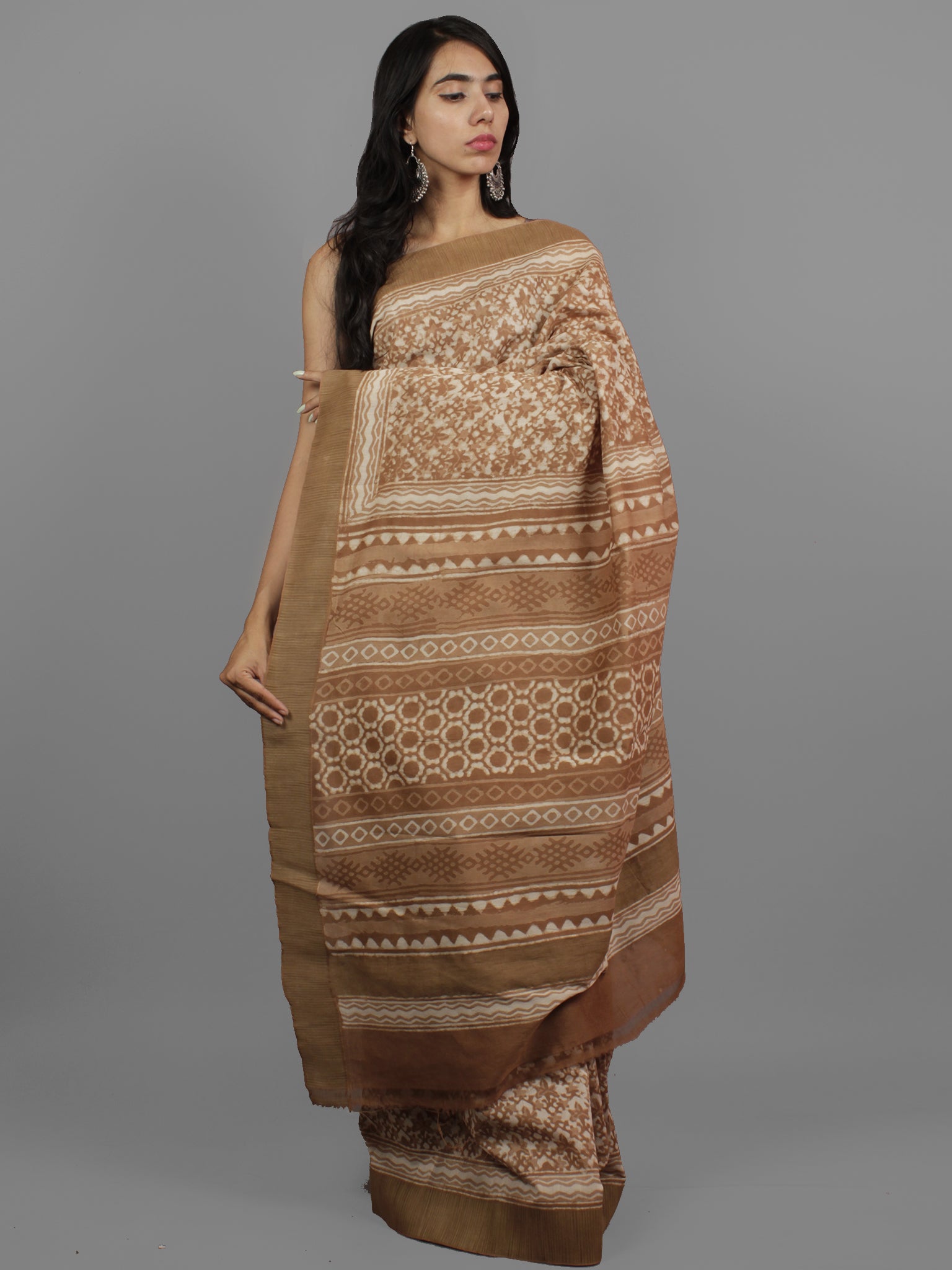 Brown Ivory Chanderi Hand Block Printed Saree With Ghicha Border - S031702450