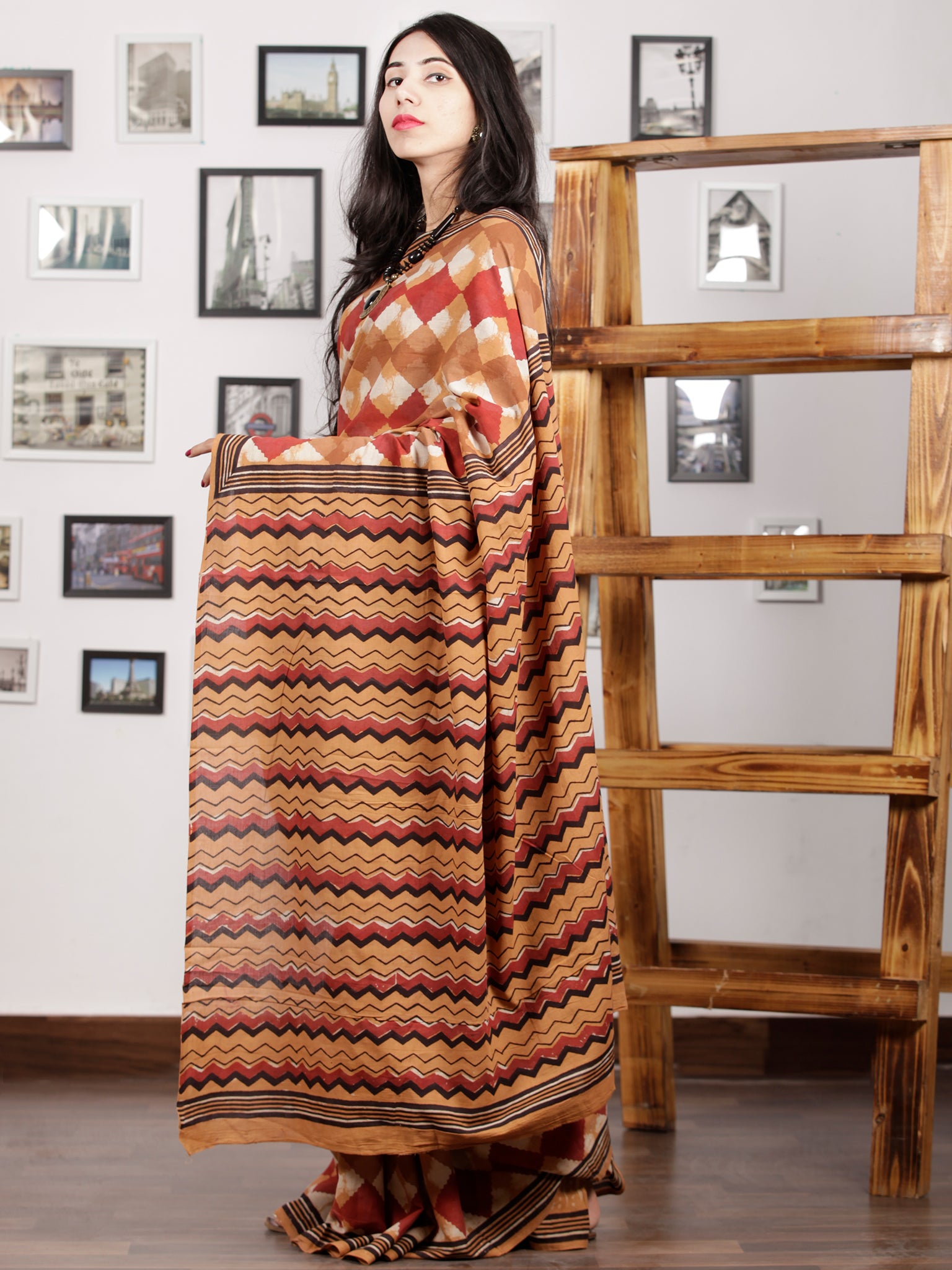 Brown Maroon Ivory Black Hand Block Printed Cotton Mul Saree - S031703011