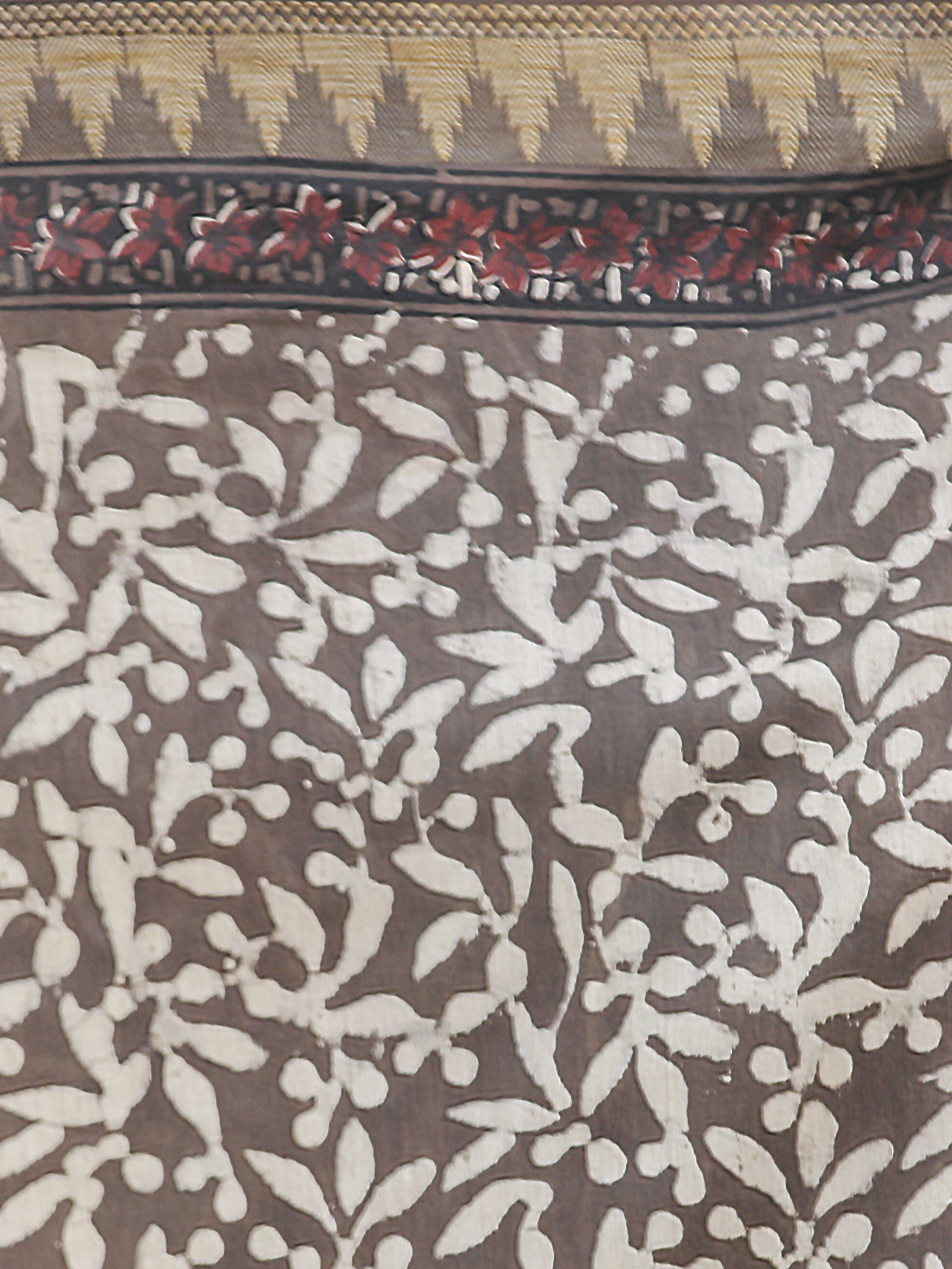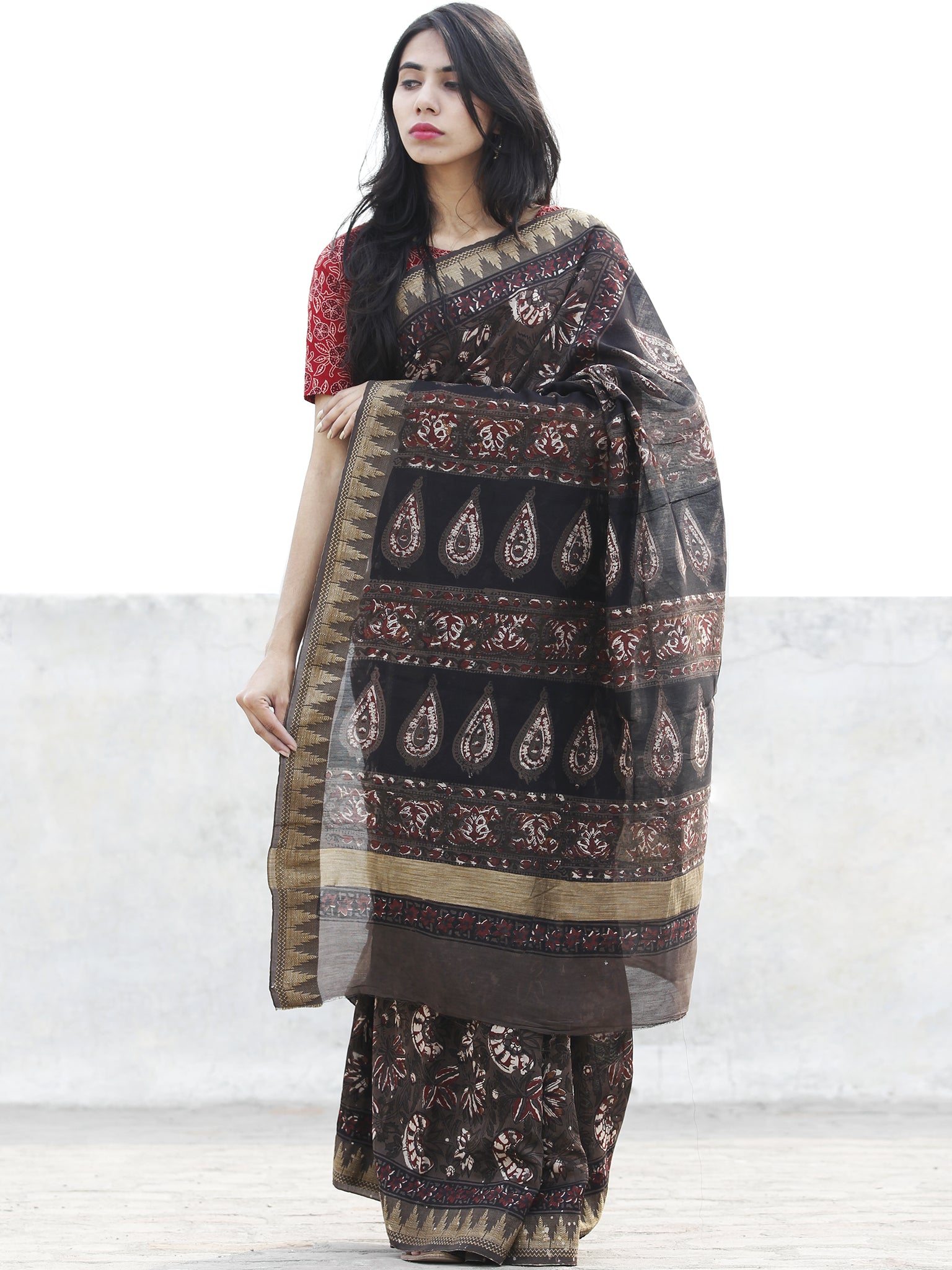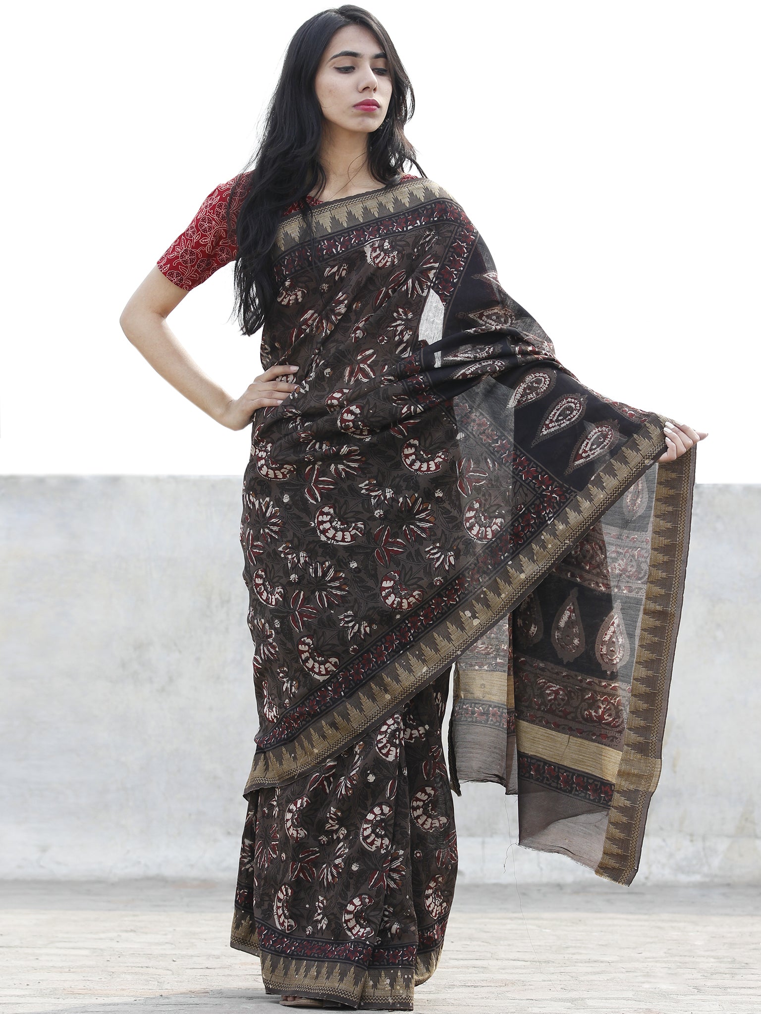 Dark Brown Maroon Ivory Chanderi Silk Hand Block Printed Saree With Geecha Border - S031702621