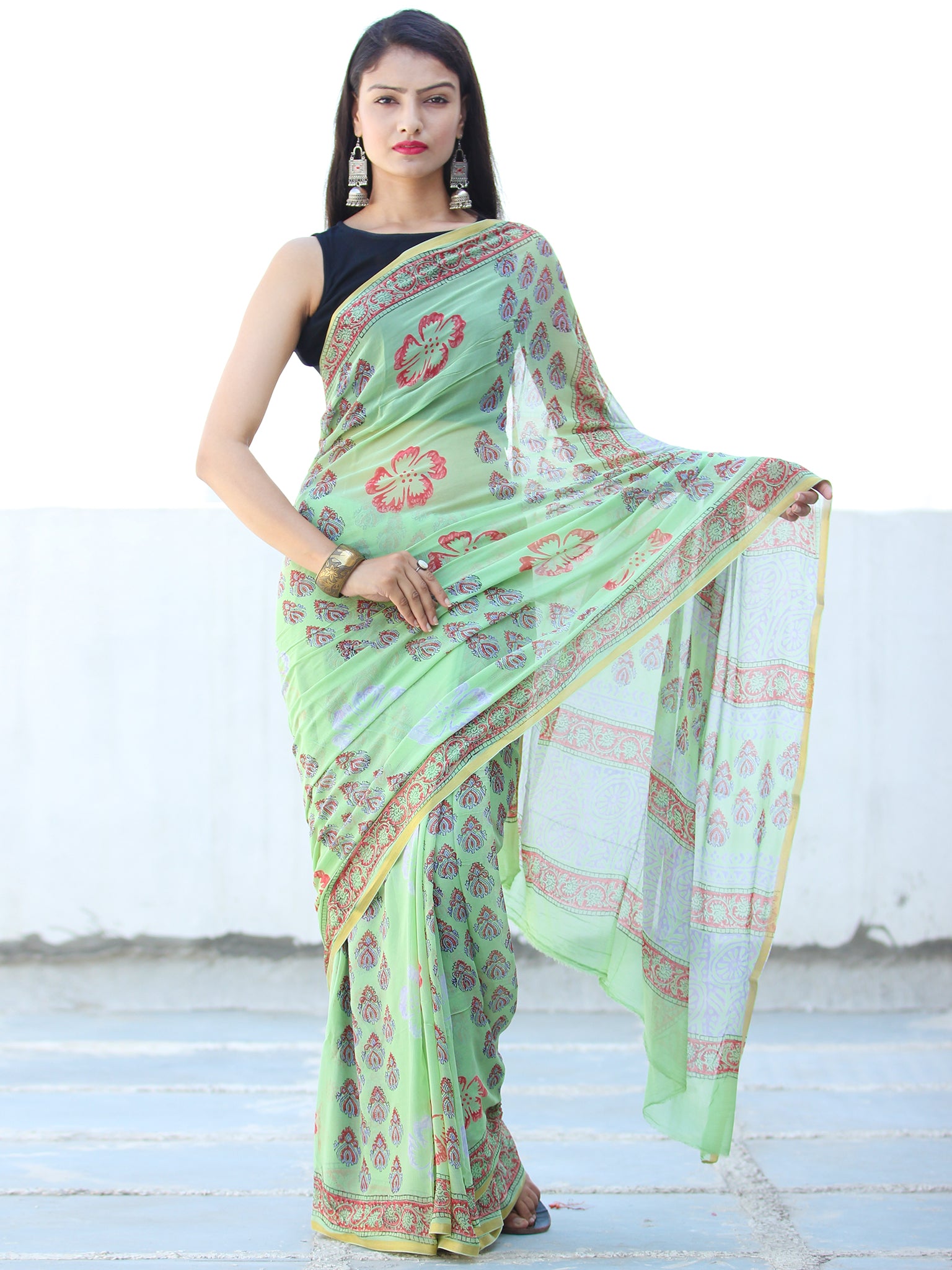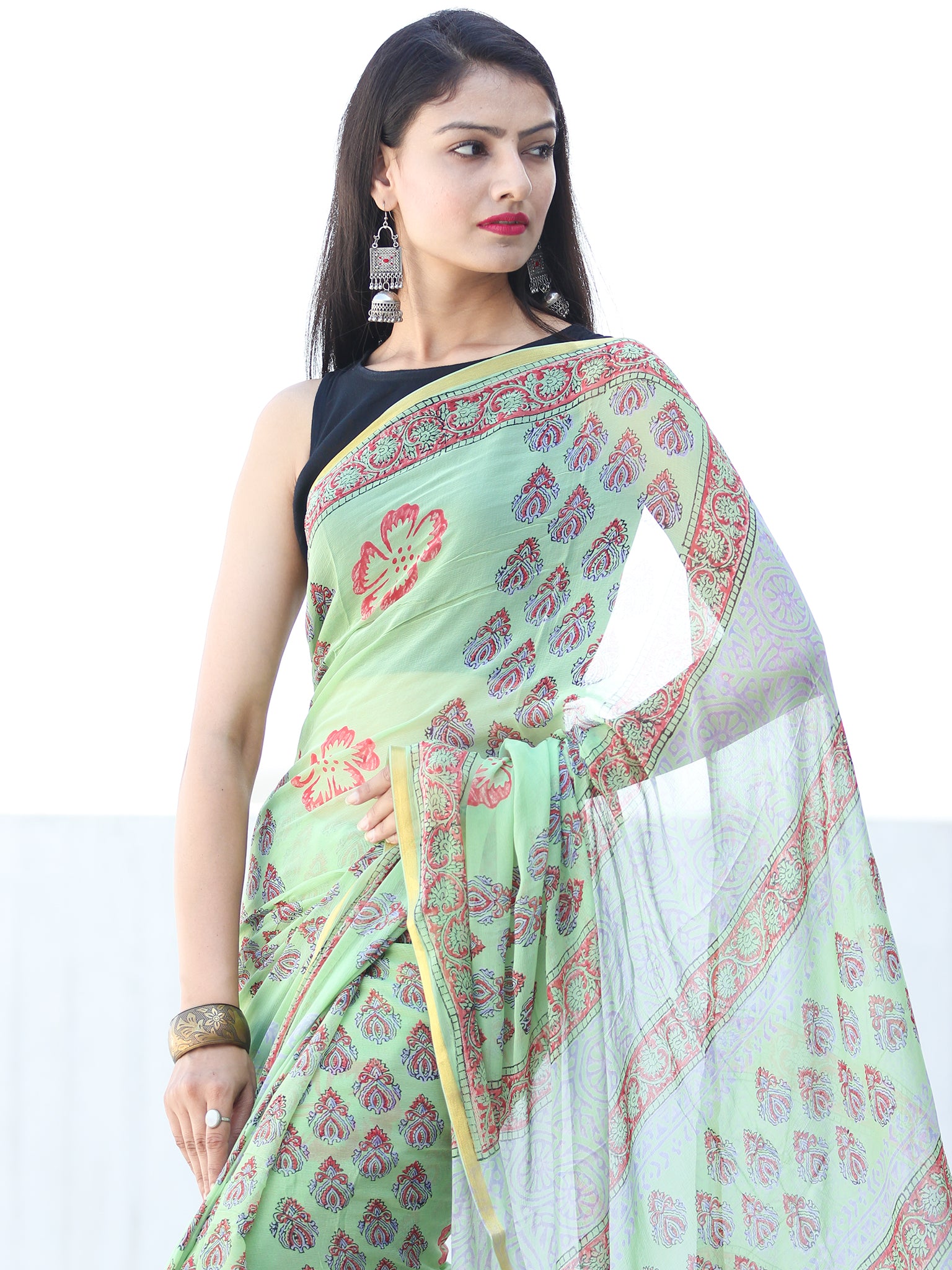 Green Coral Hand Block Printed Chiffon Saree with Zari Border - S031703929