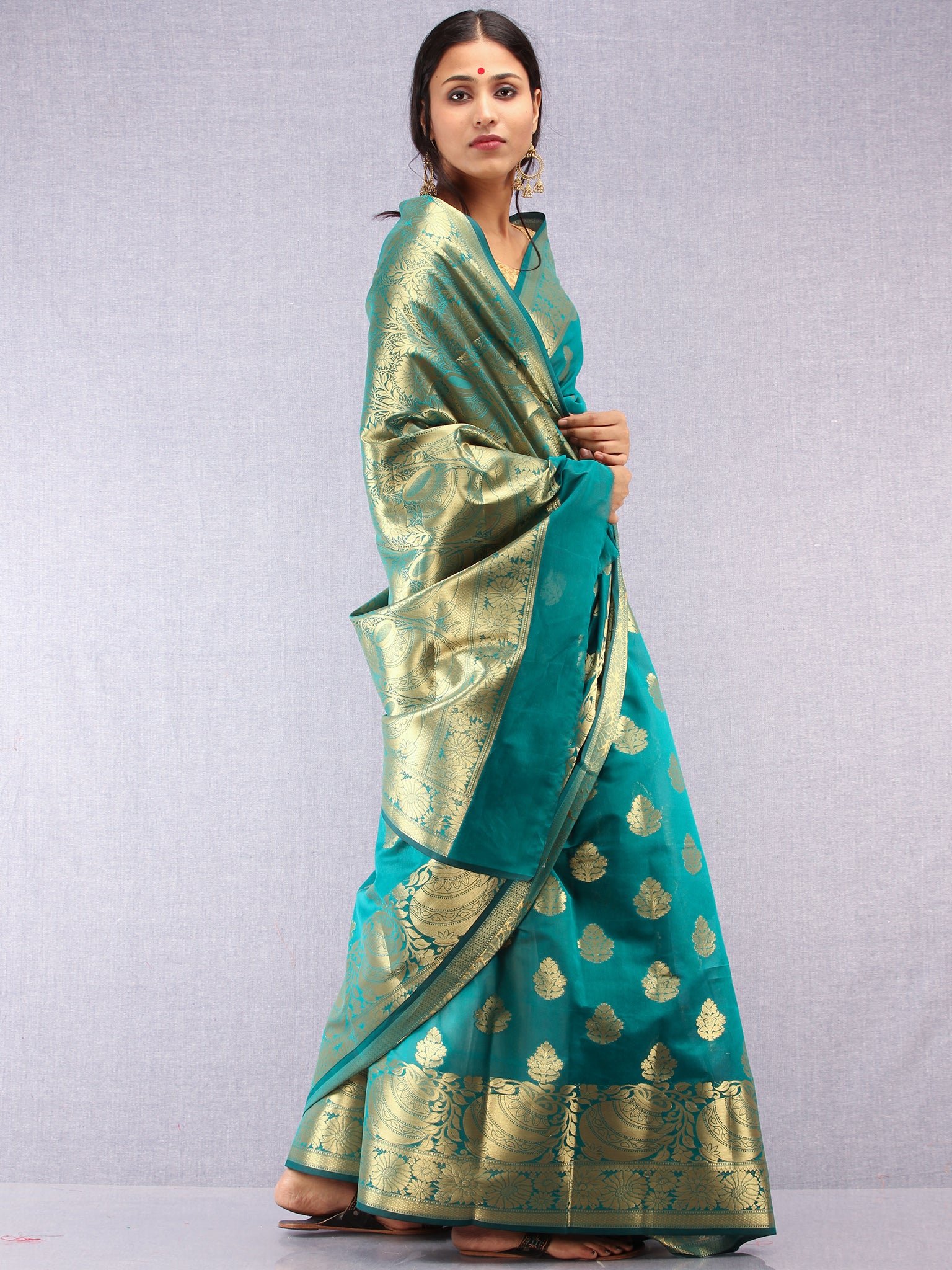 Banarasee Semi Silk Saree With Zari Work - Green & Gold - S031704376