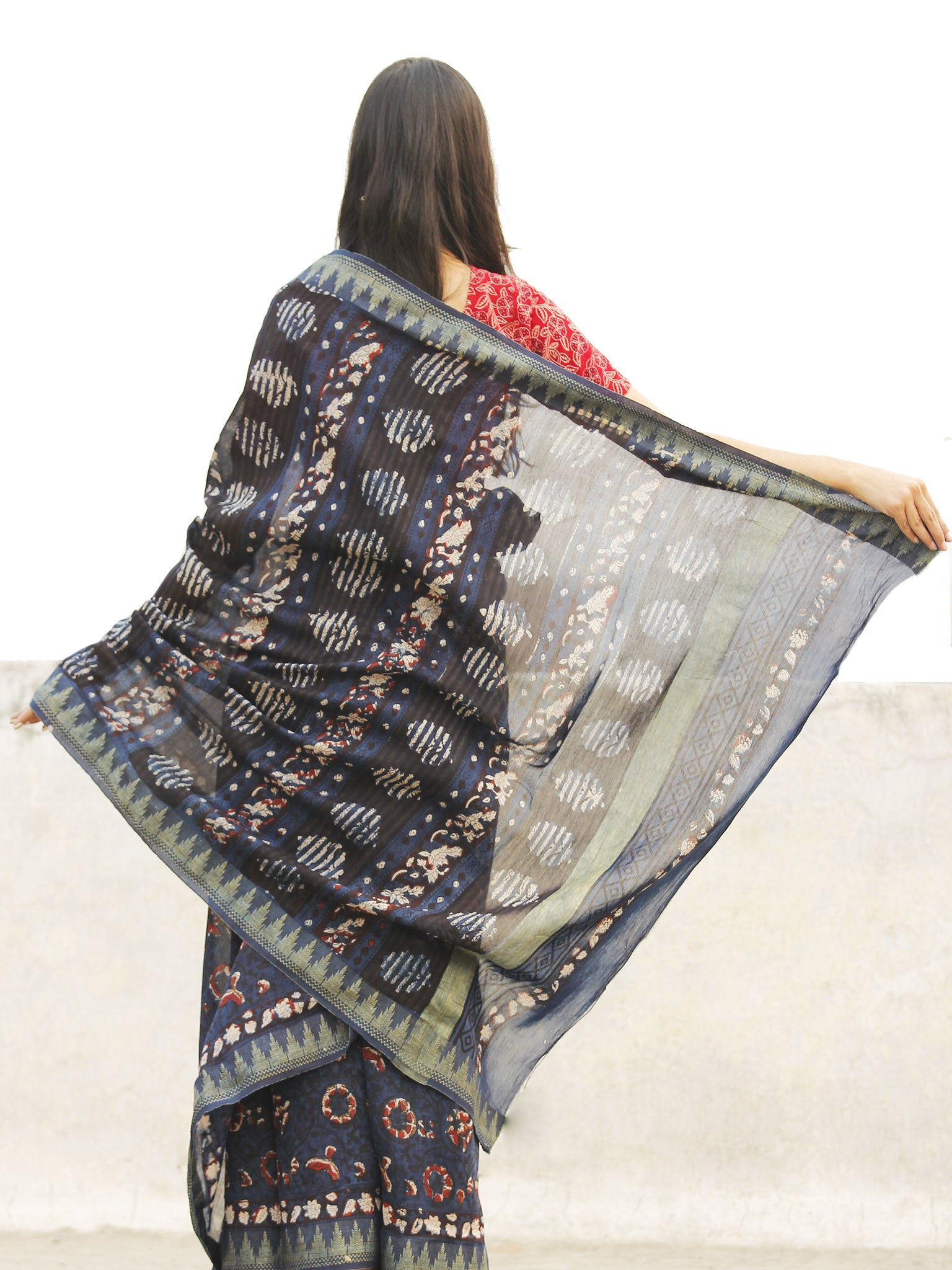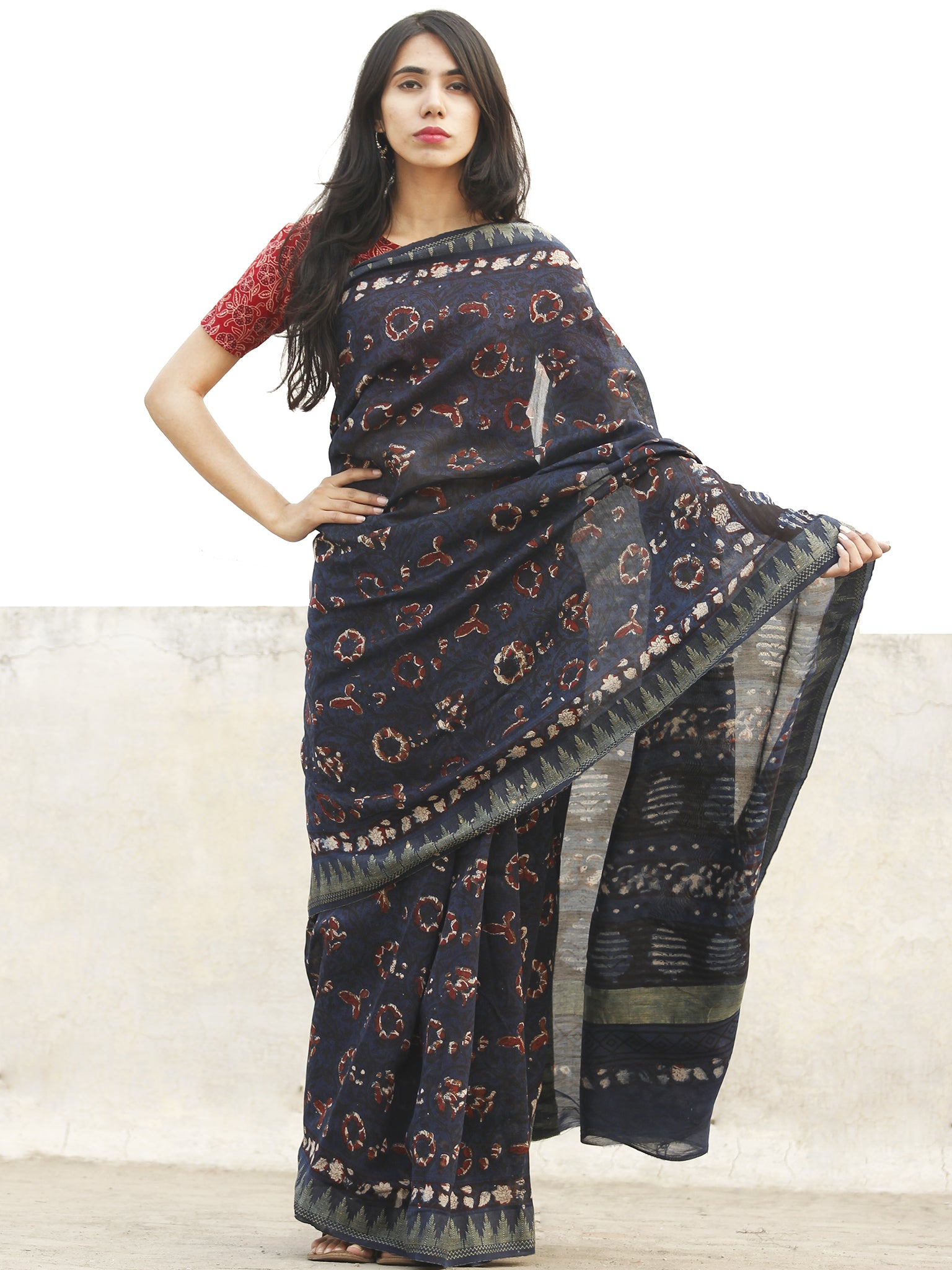 Indigo Black Maroon Chanderi Silk Ajrakh Hand Block Printed Saree With Geecha Border - S031702656