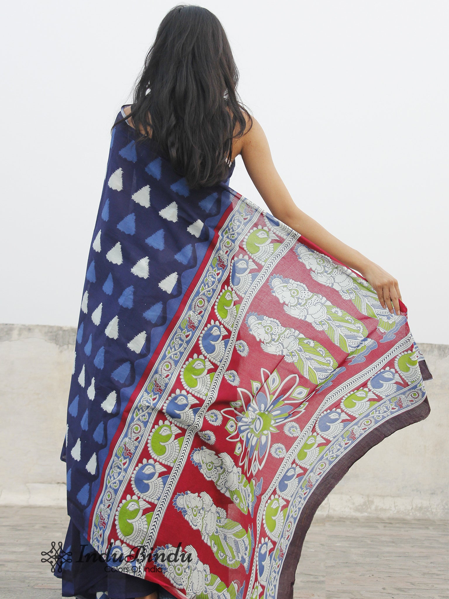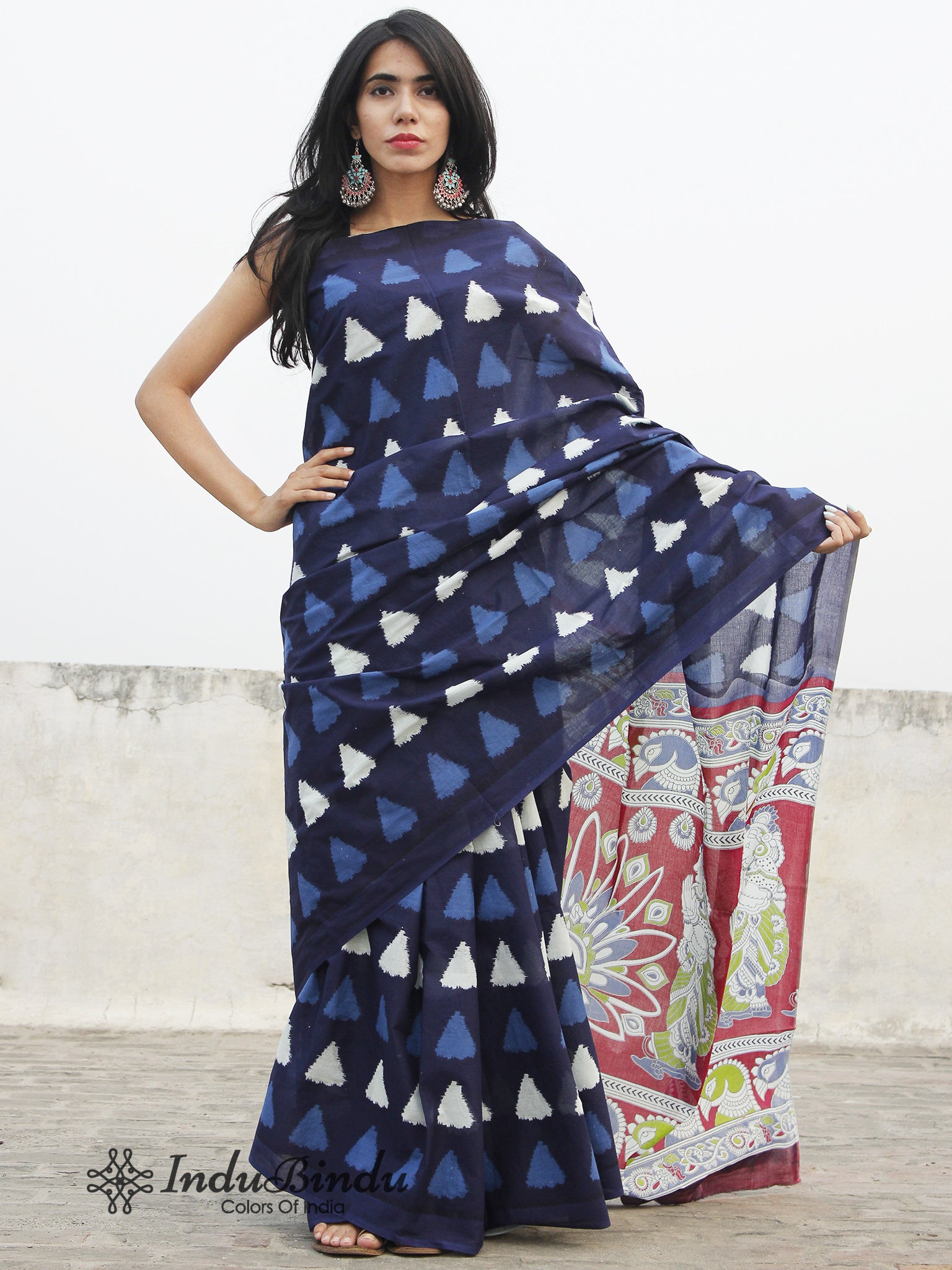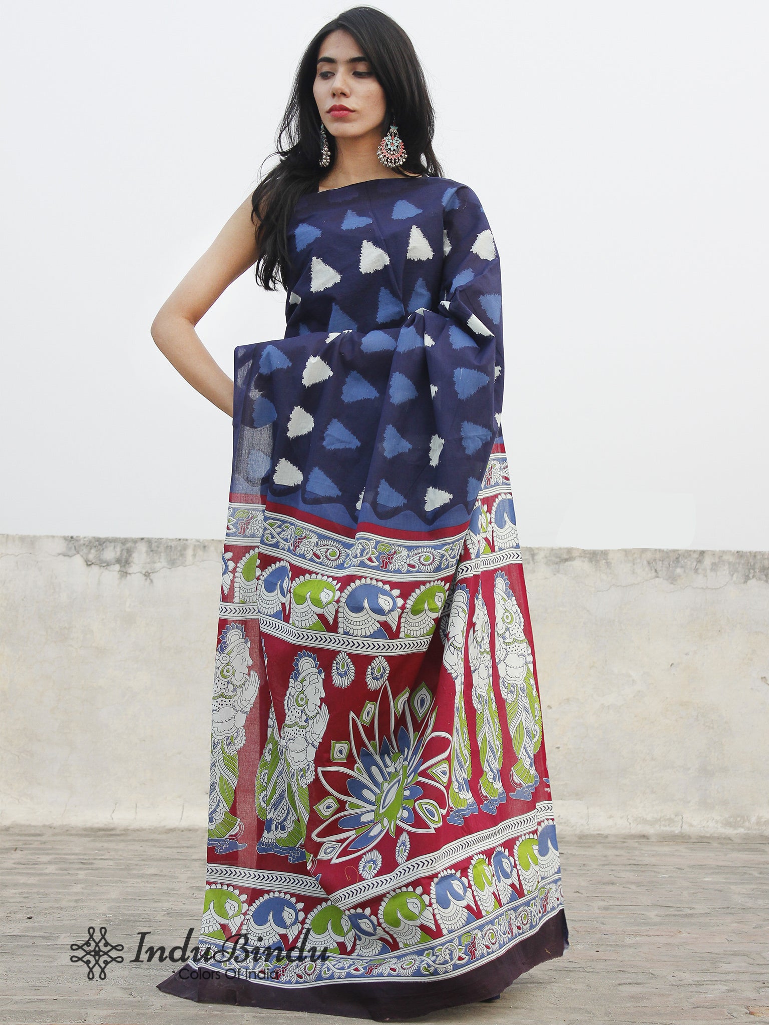 Indigo Blue Ivory Hand Block Printed Cotton Saree With Maroon Green Kalamkari Printed Pallu - S031702389