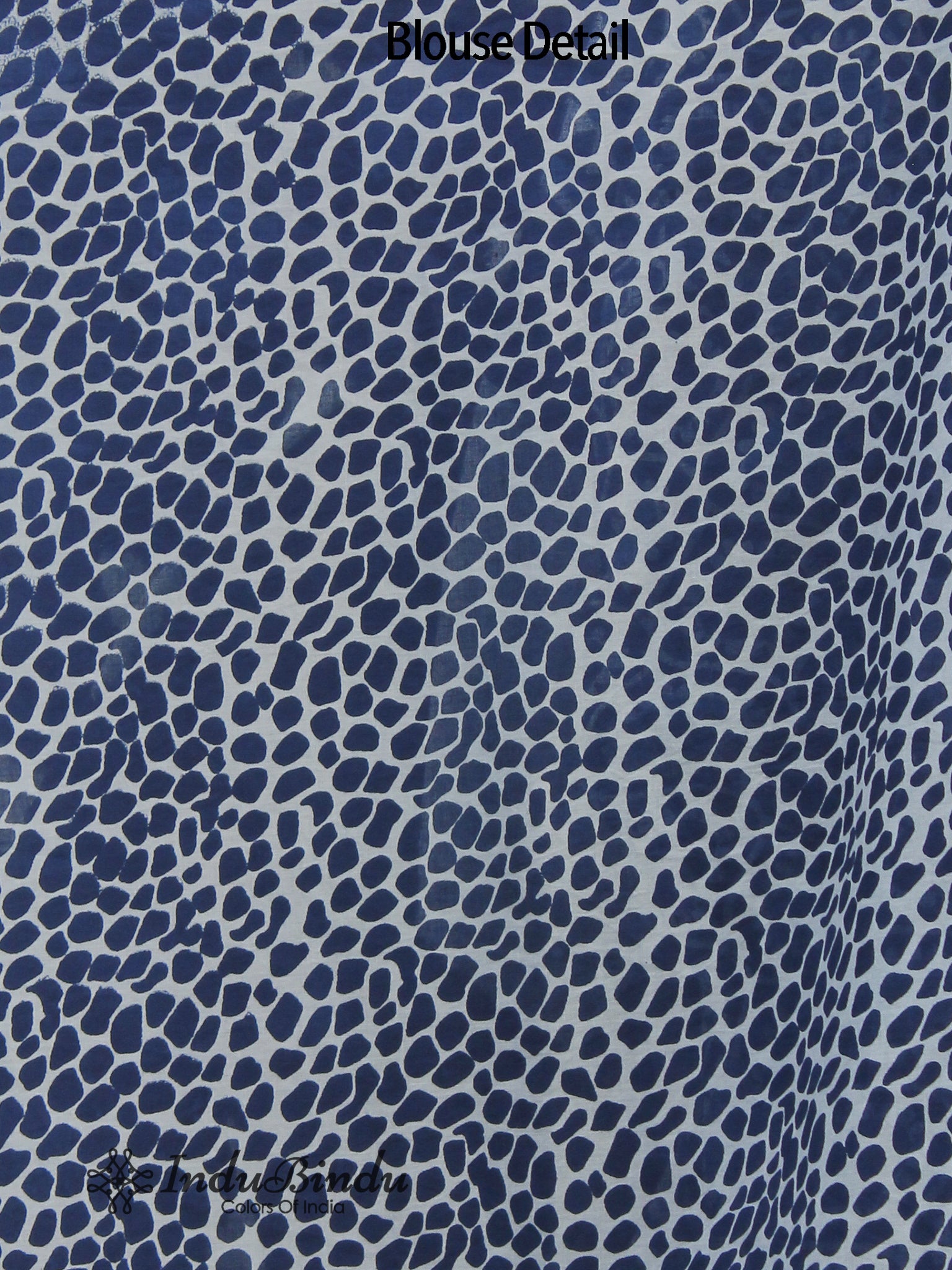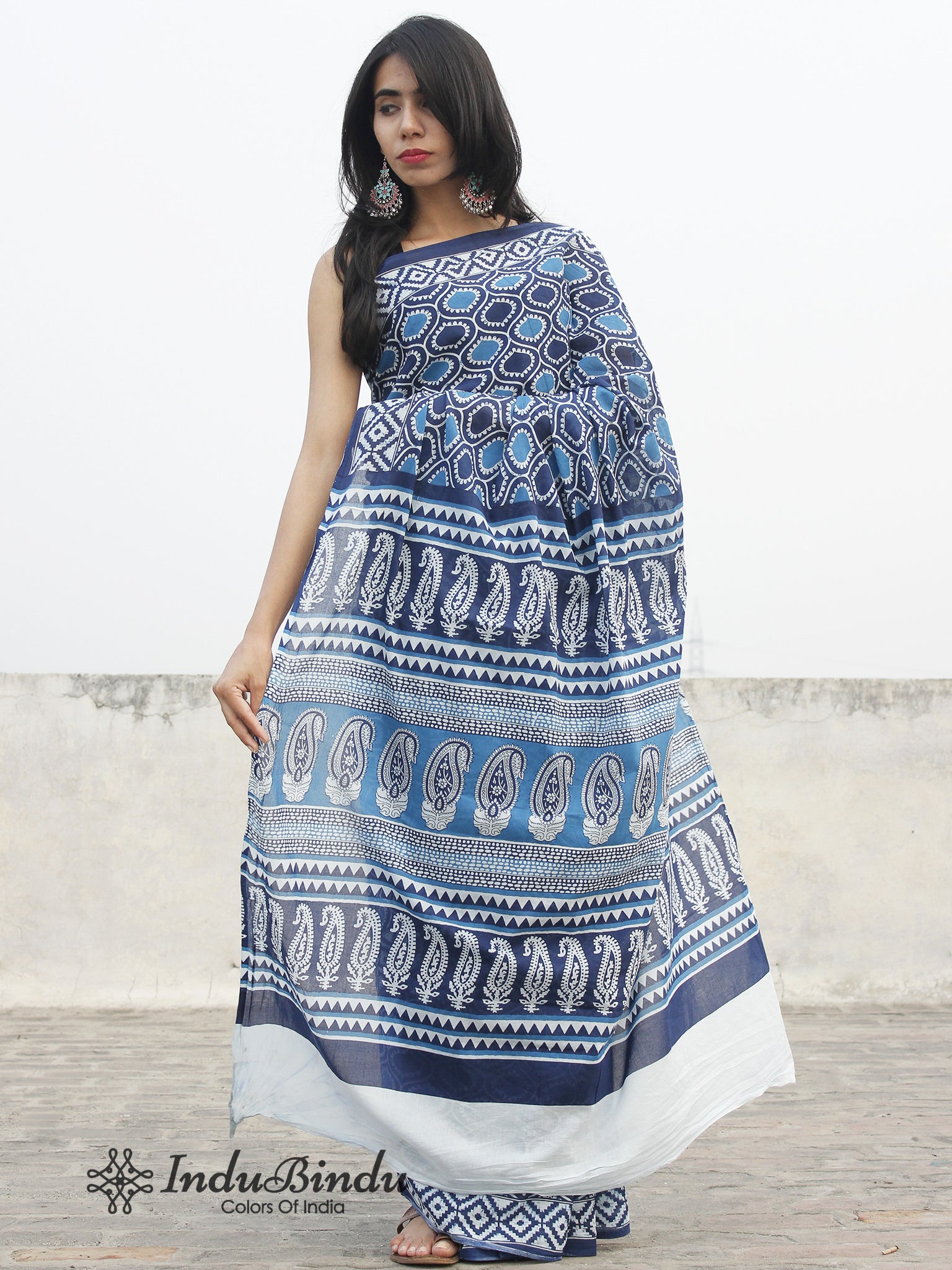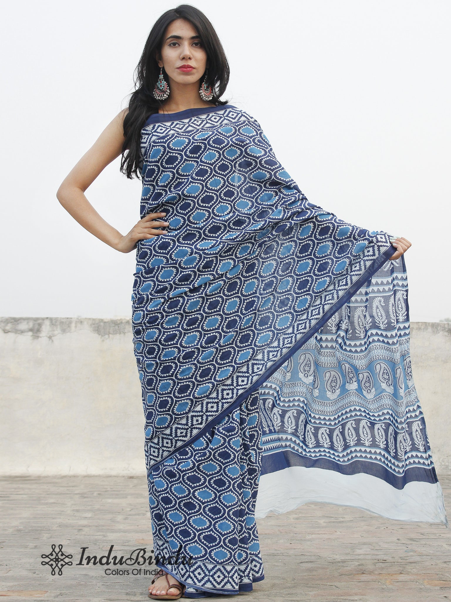 Indigo Blue White Hand Block Printed Cotton Saree In Natural Colors - S031702388