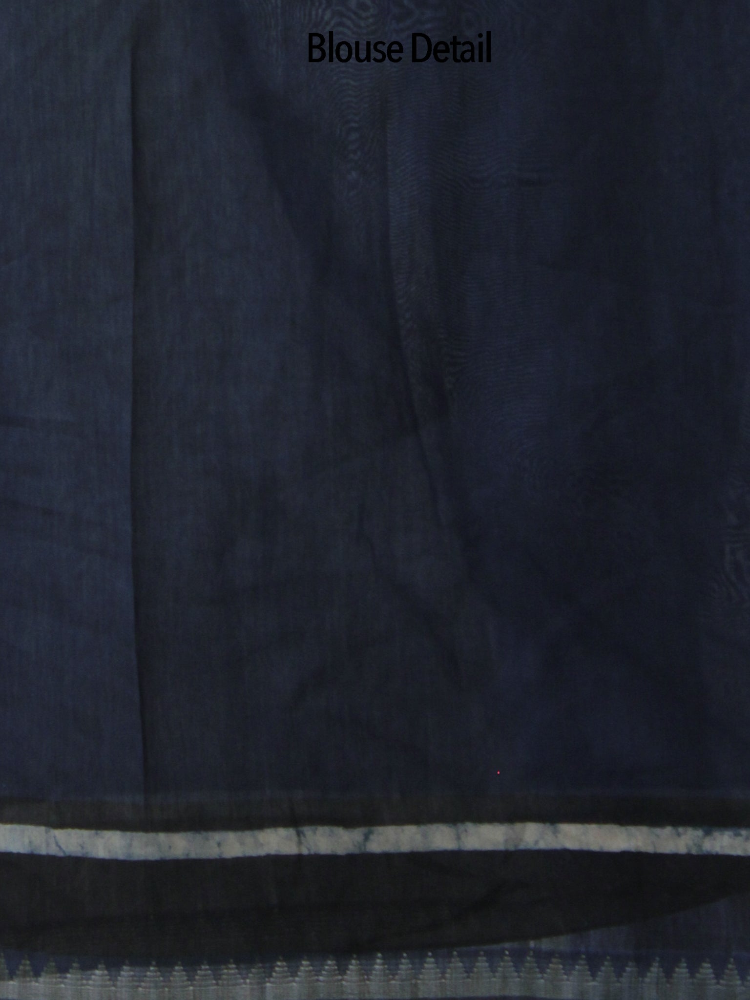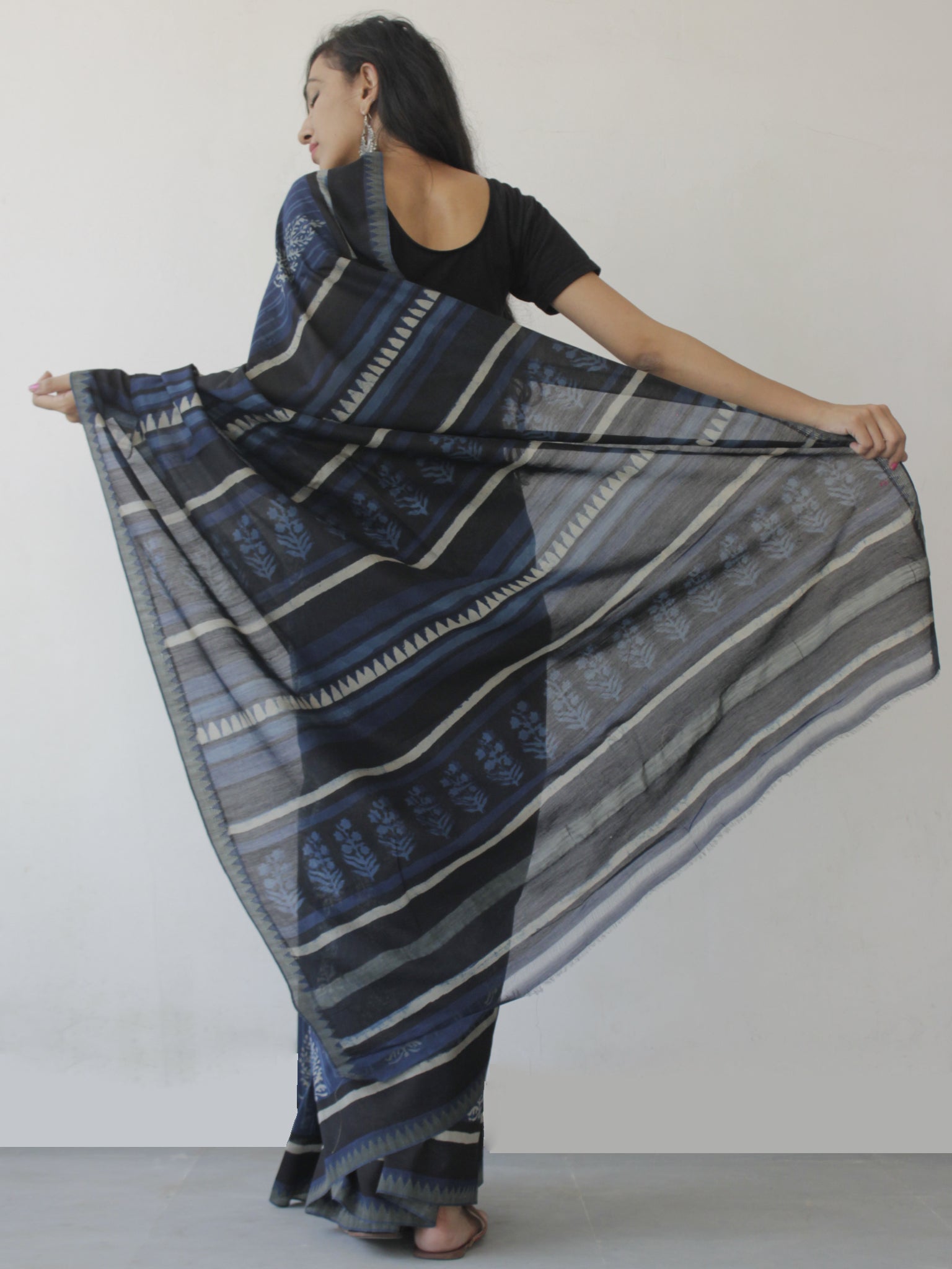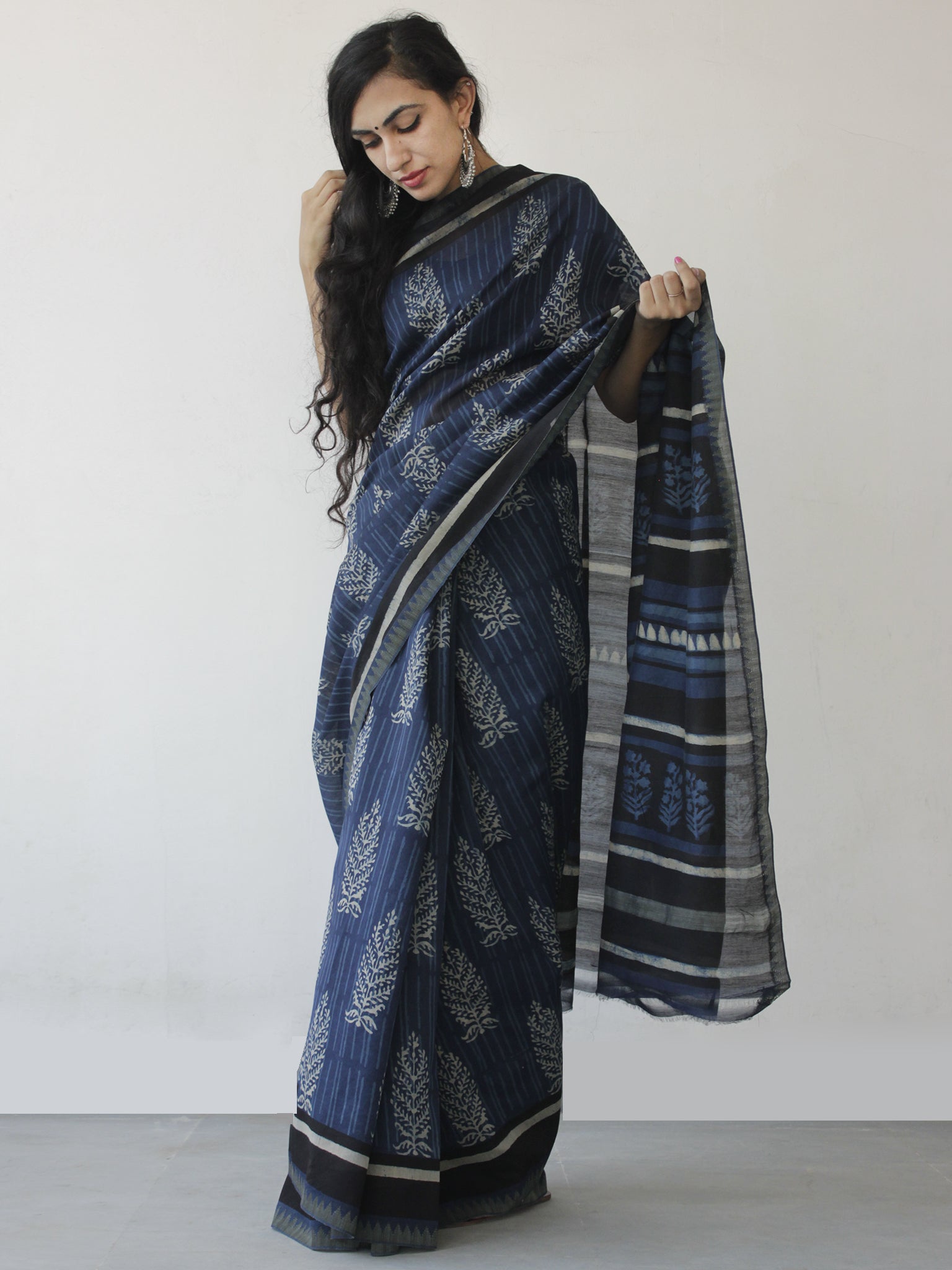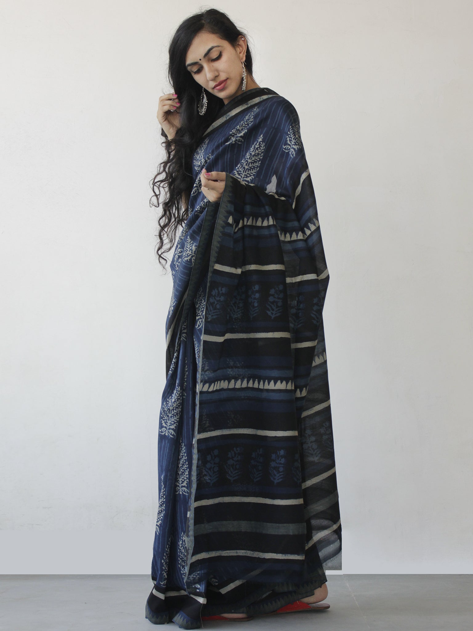 Indigo Ivory Black Hand Block Printed Chanderi Saree With Ghicha Border - S031702457