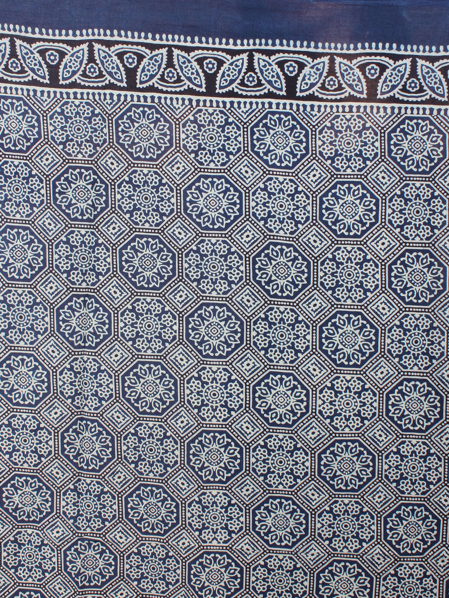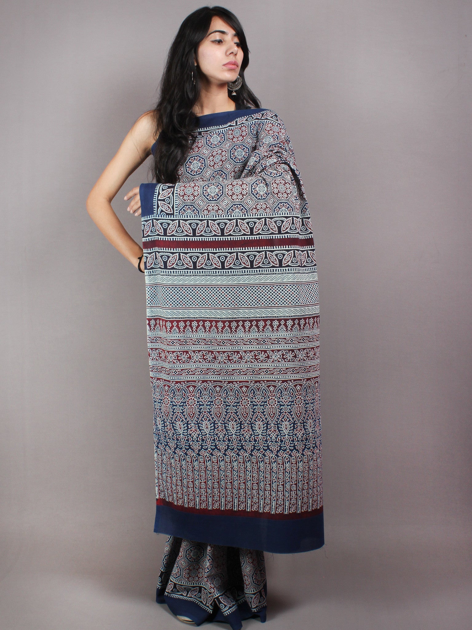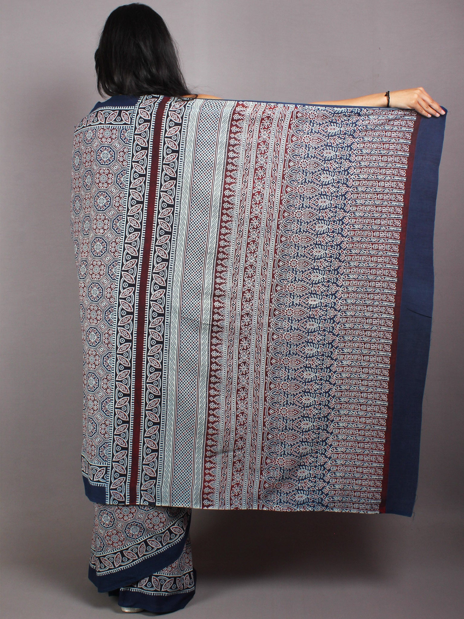 Indigo Maroon Mughal Nakashi Ajrakh Hand Block Printed in Natural Vegetable Colors Cotton Mul Saree - S03170601