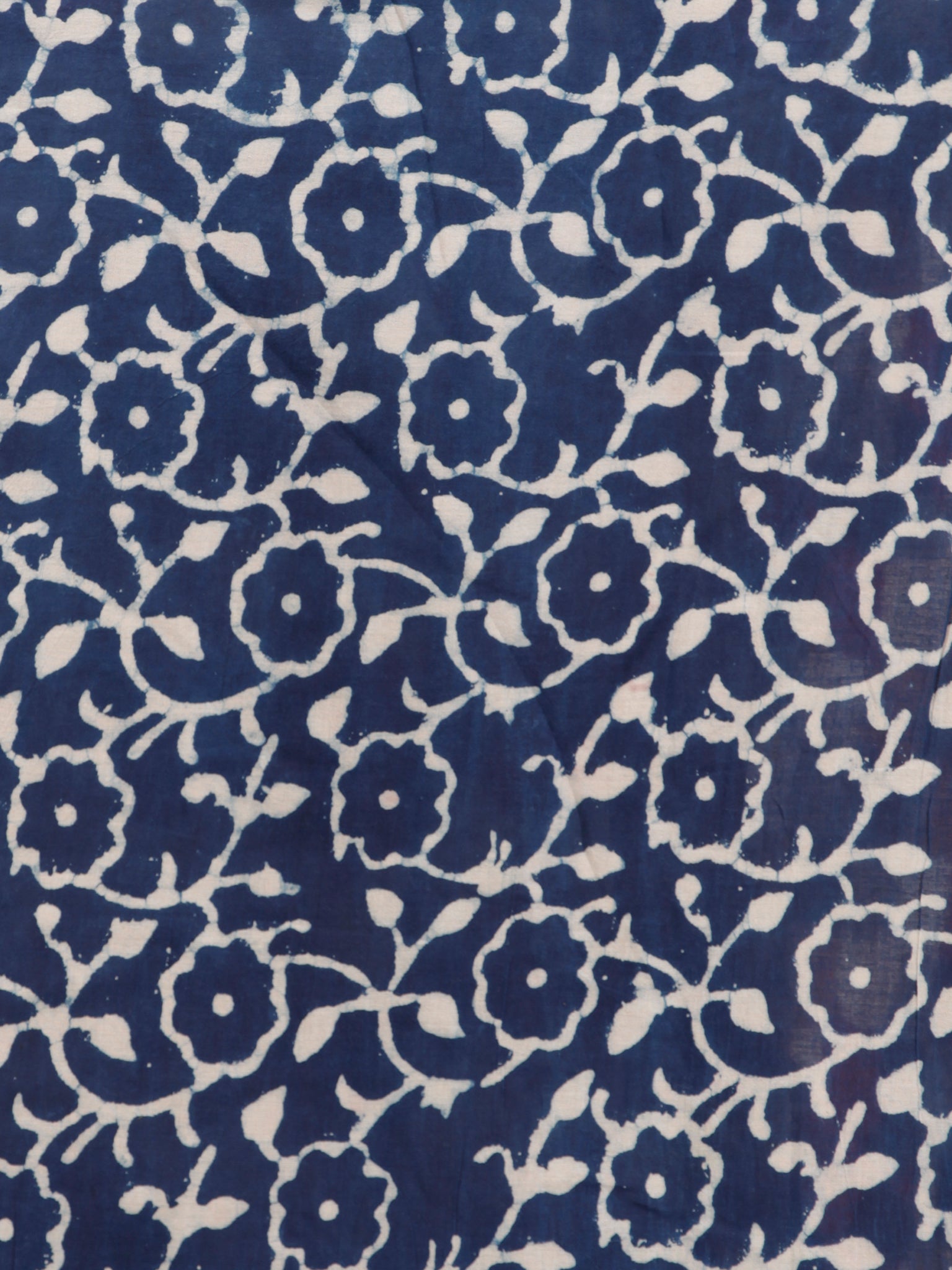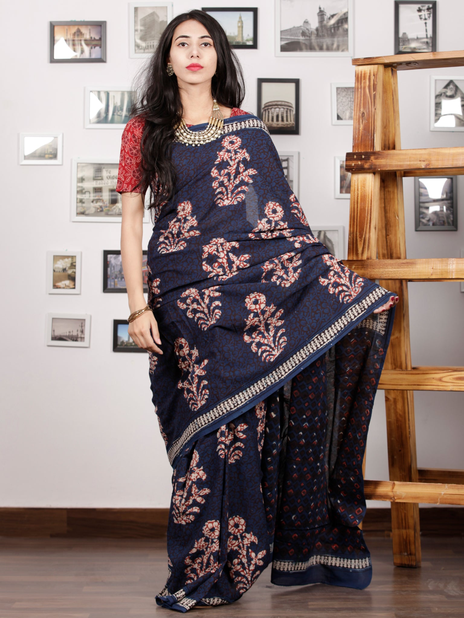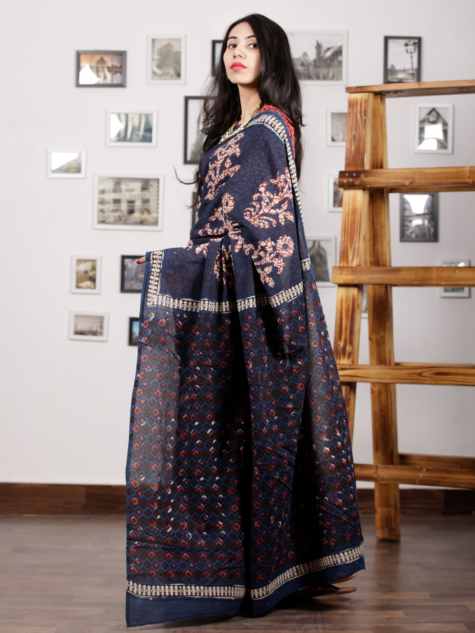 Indigo Red White Hand Block Printed Cotton Mul Saree - S031703008