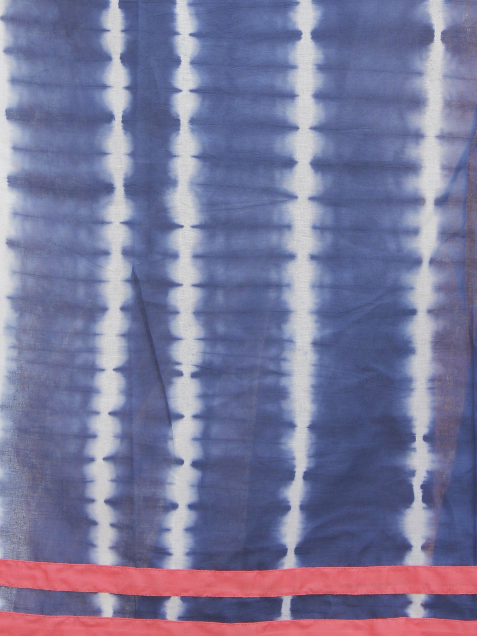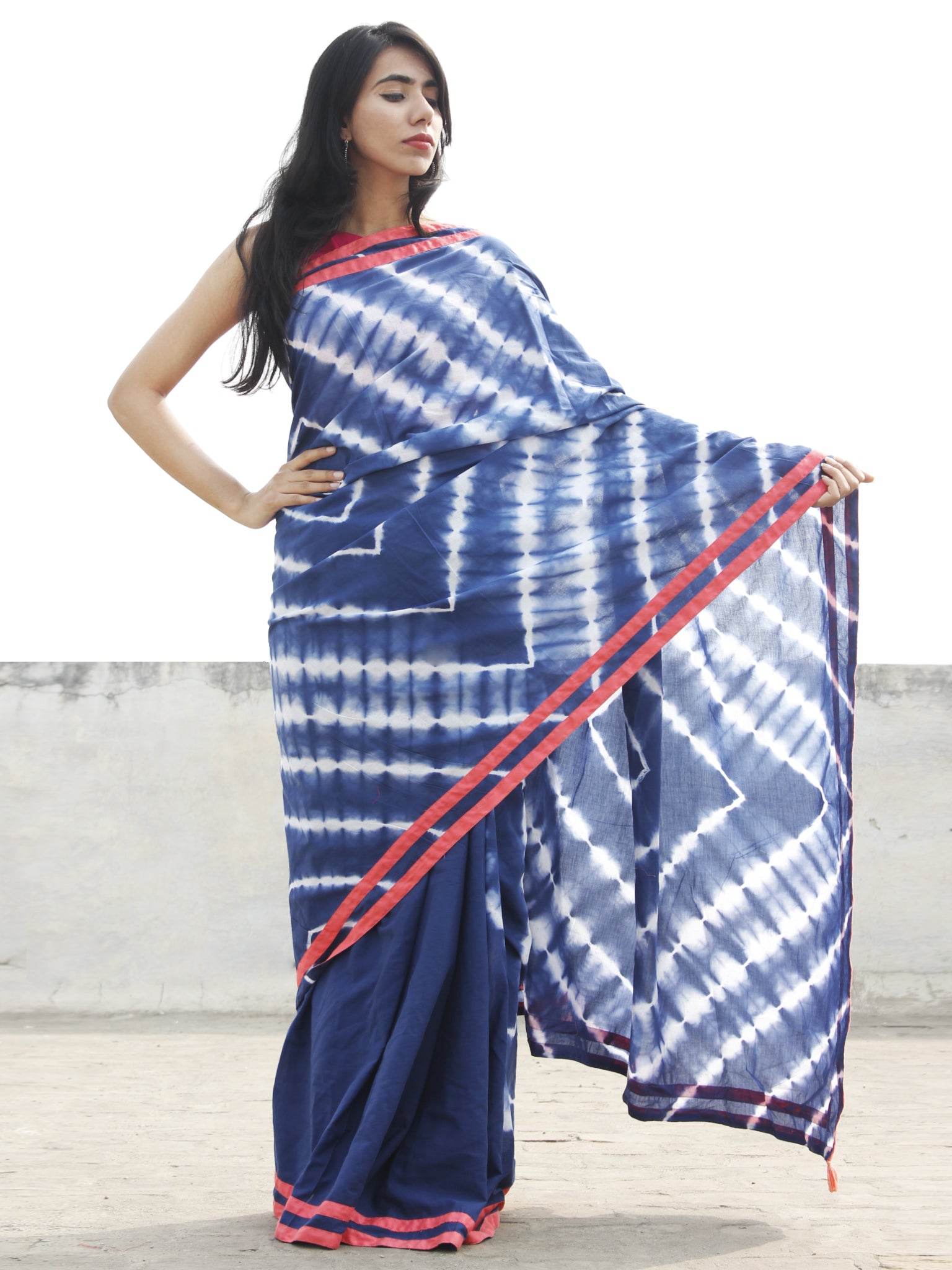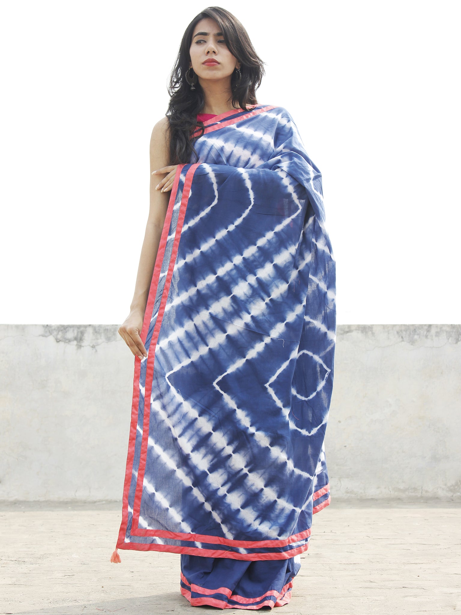 Indigo White Hand Shibori Dyed Saree With Peach Border & Tassels - S031702562