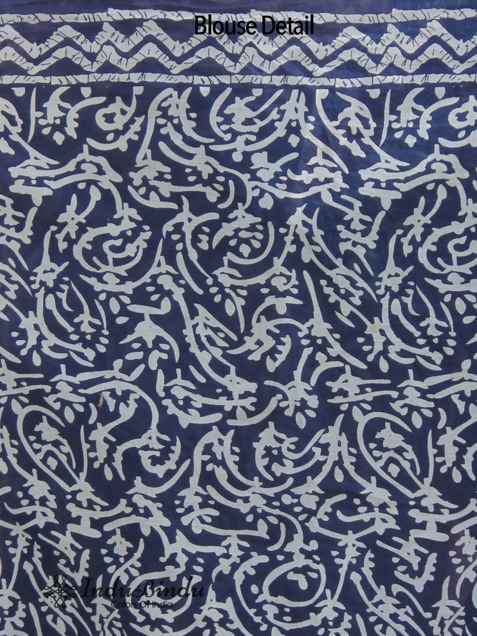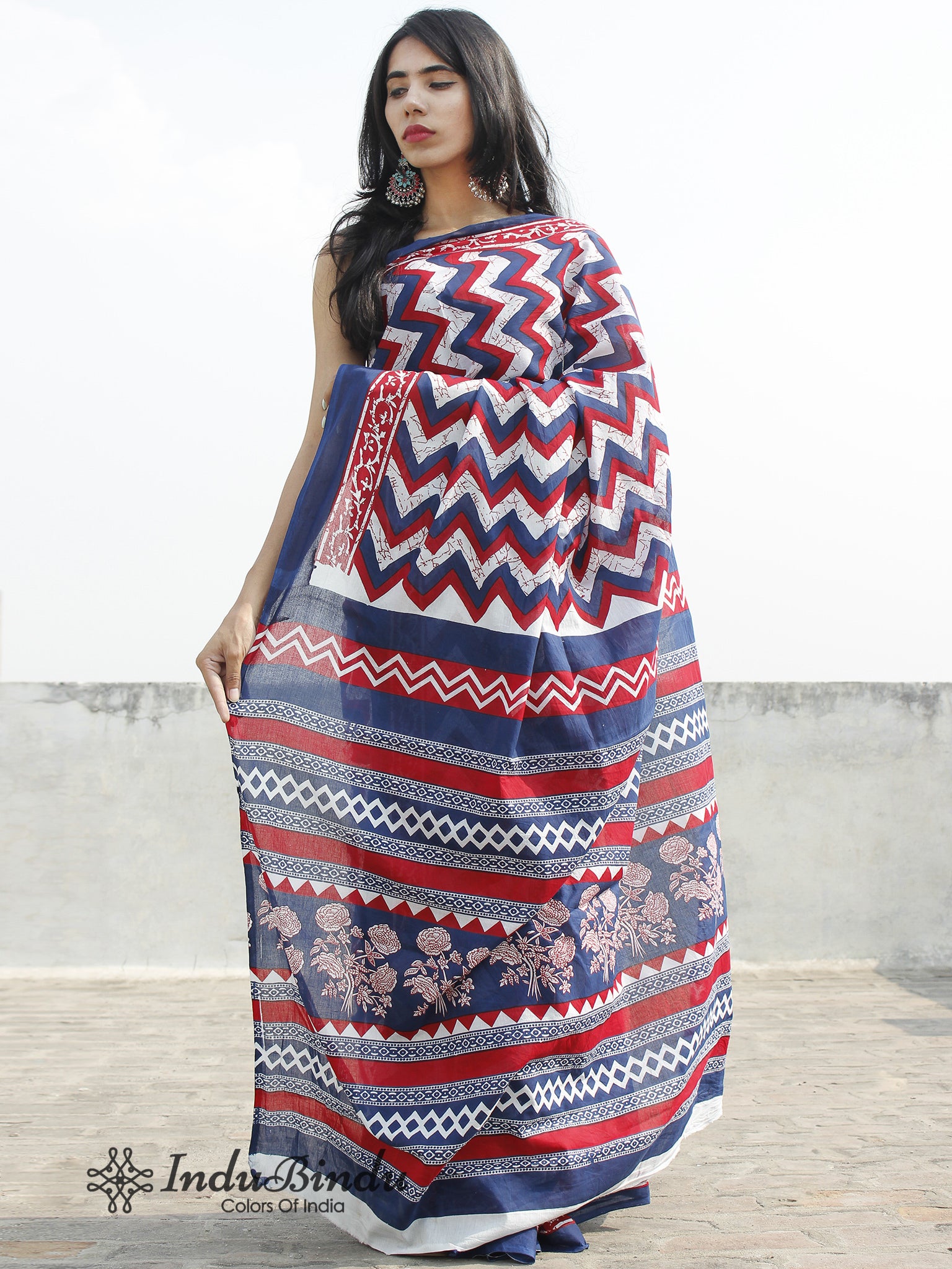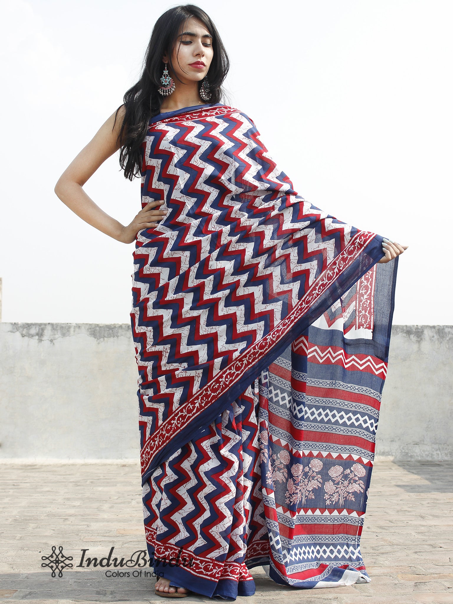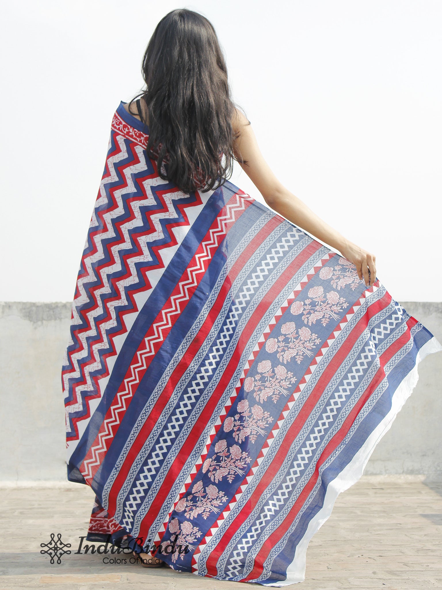 Indigo White Red Hand Block Printed Cotton Saree In Natural Colors - S031702381