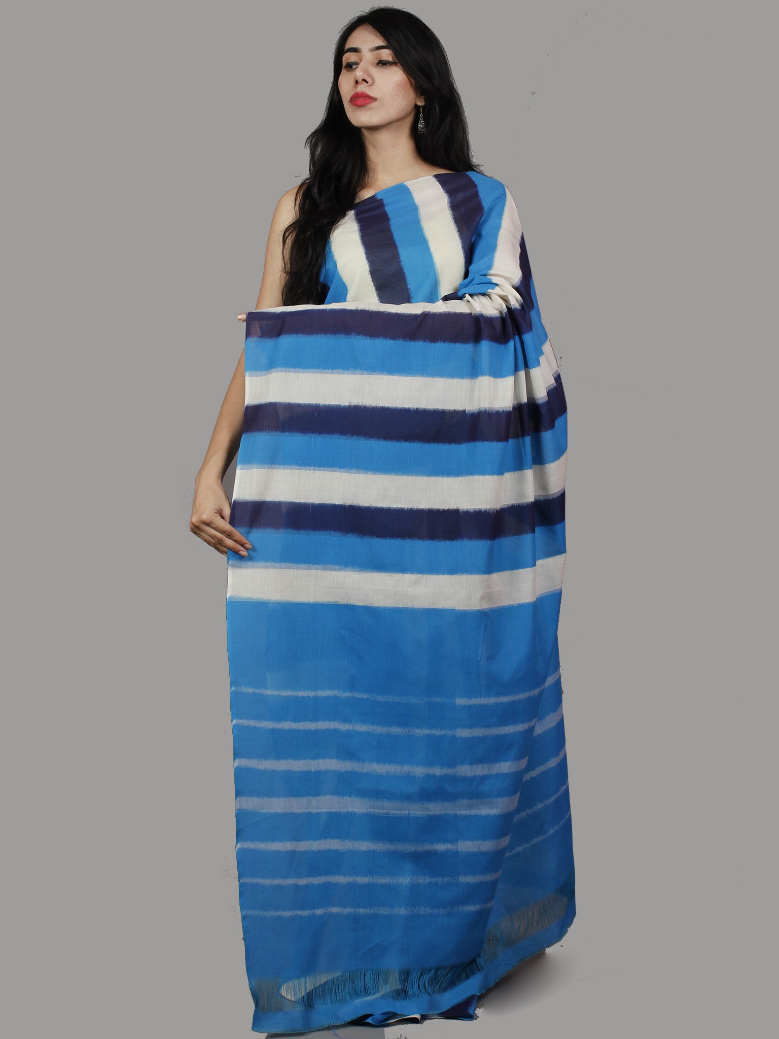 Indigo Blue White Ikat Handwoven Pochampally Mercerized Cotton Saree - S031701422