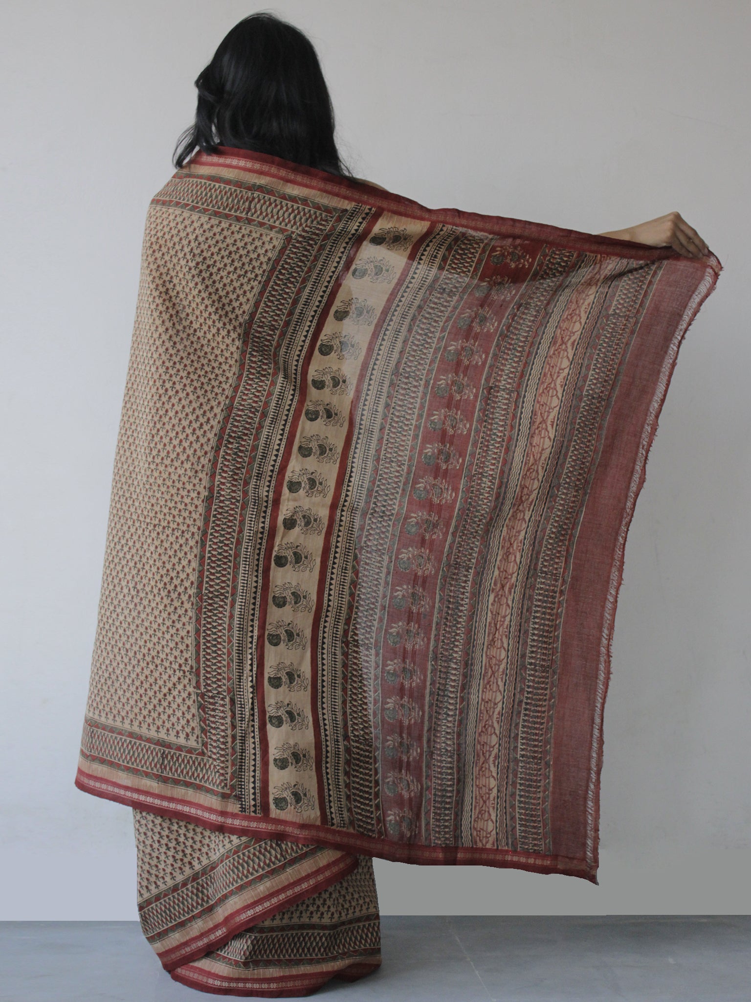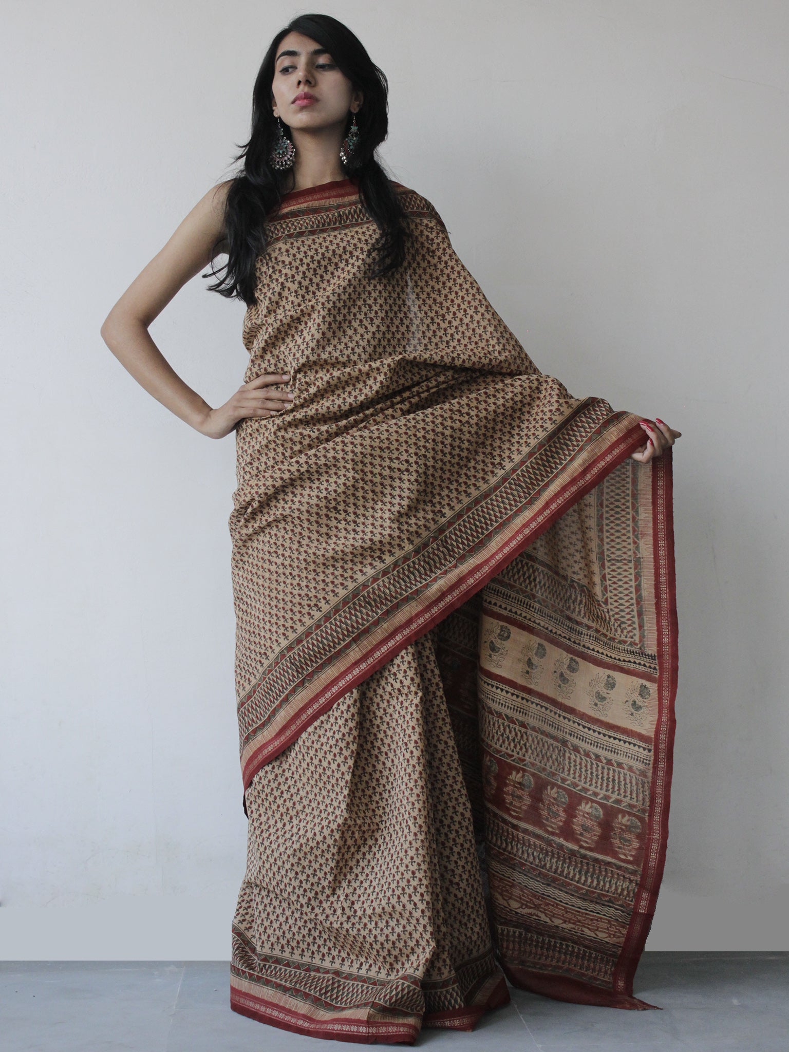 Maroon Brown Green Handloom Cotton Hand Block Printed Handloom Saree in Natural Dyes - S031702515
