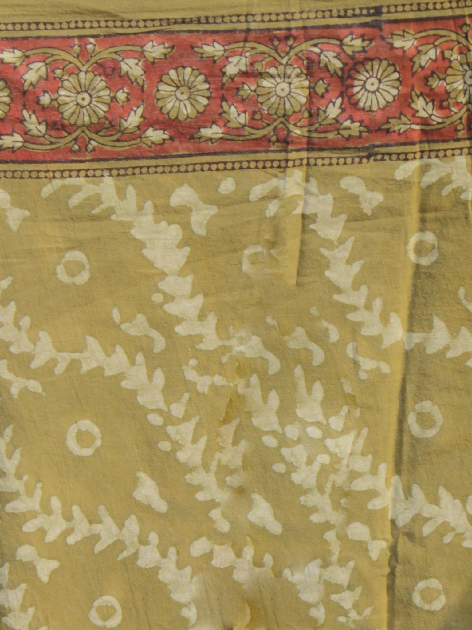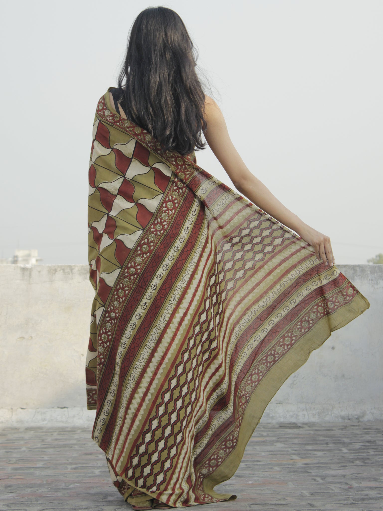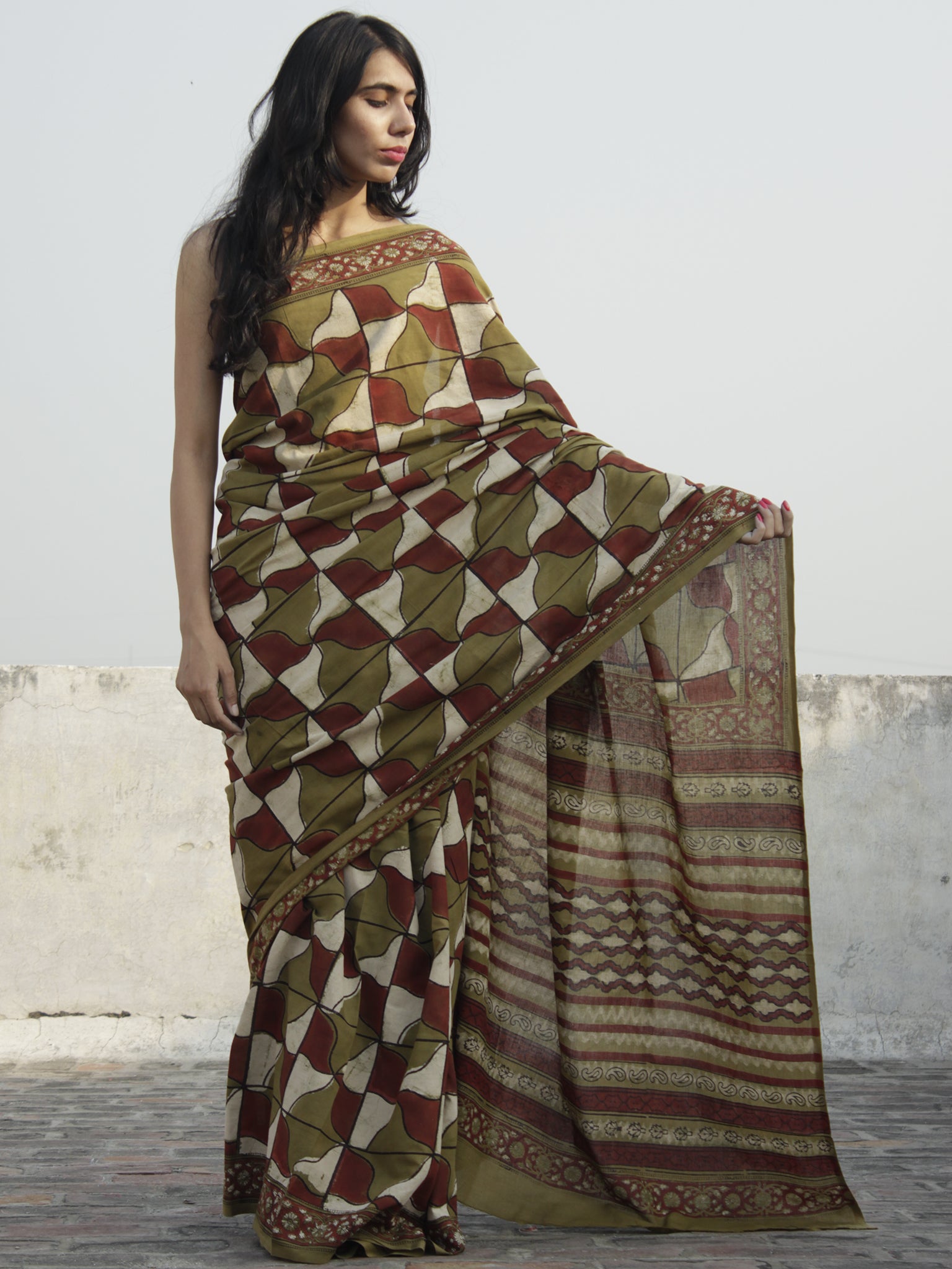 Olive Green Rust Ivory Hand Block Printed Cotton Saree In Natural Colors - S031702304