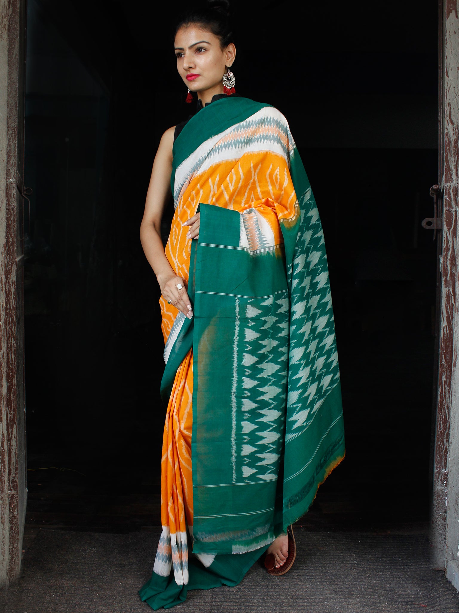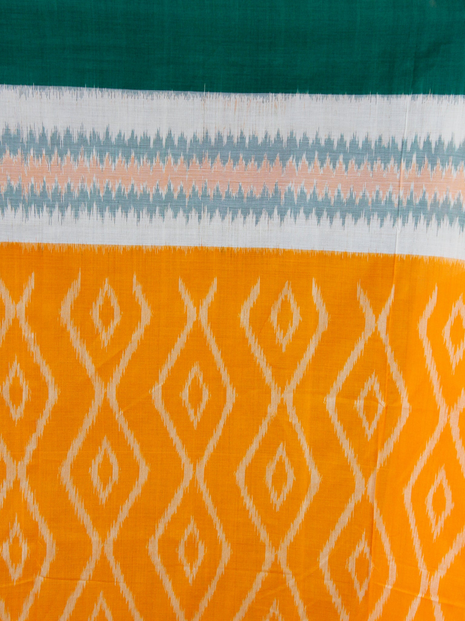 Orange Green White Ikat Handwoven Mercerised Cotton Saree - S031703627