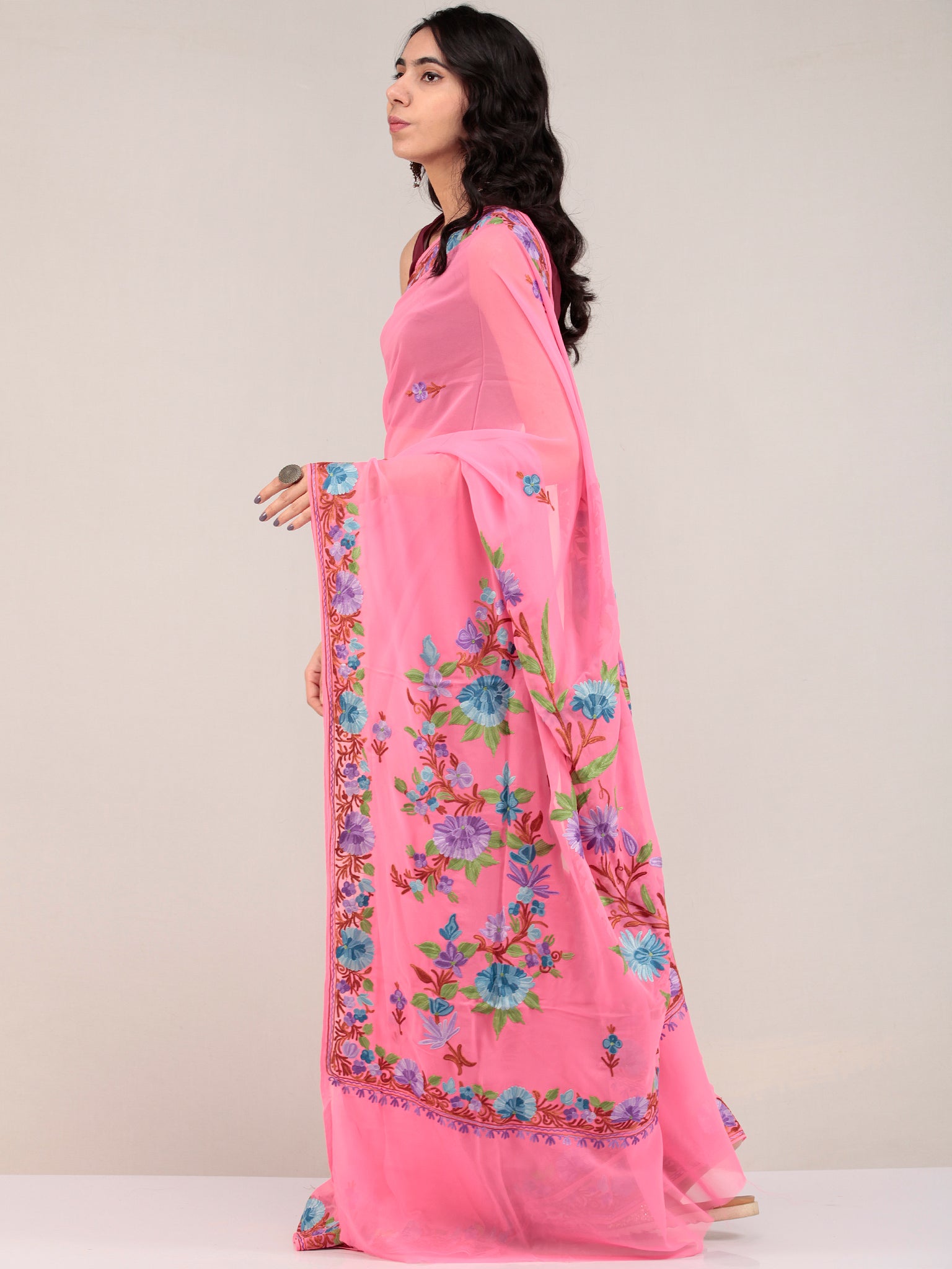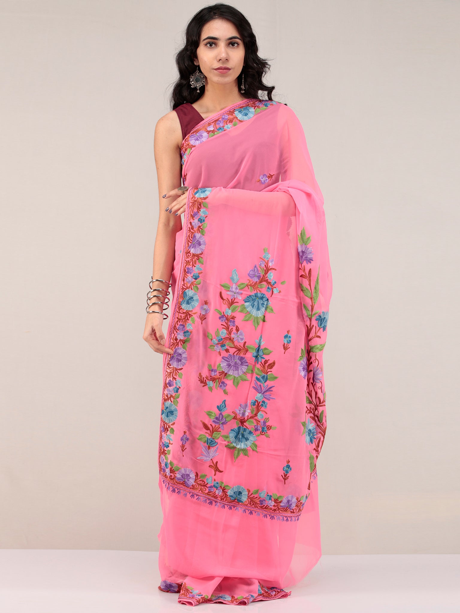 Pink Aari Embroidered Georgette Saree From Kashmir - S031704673