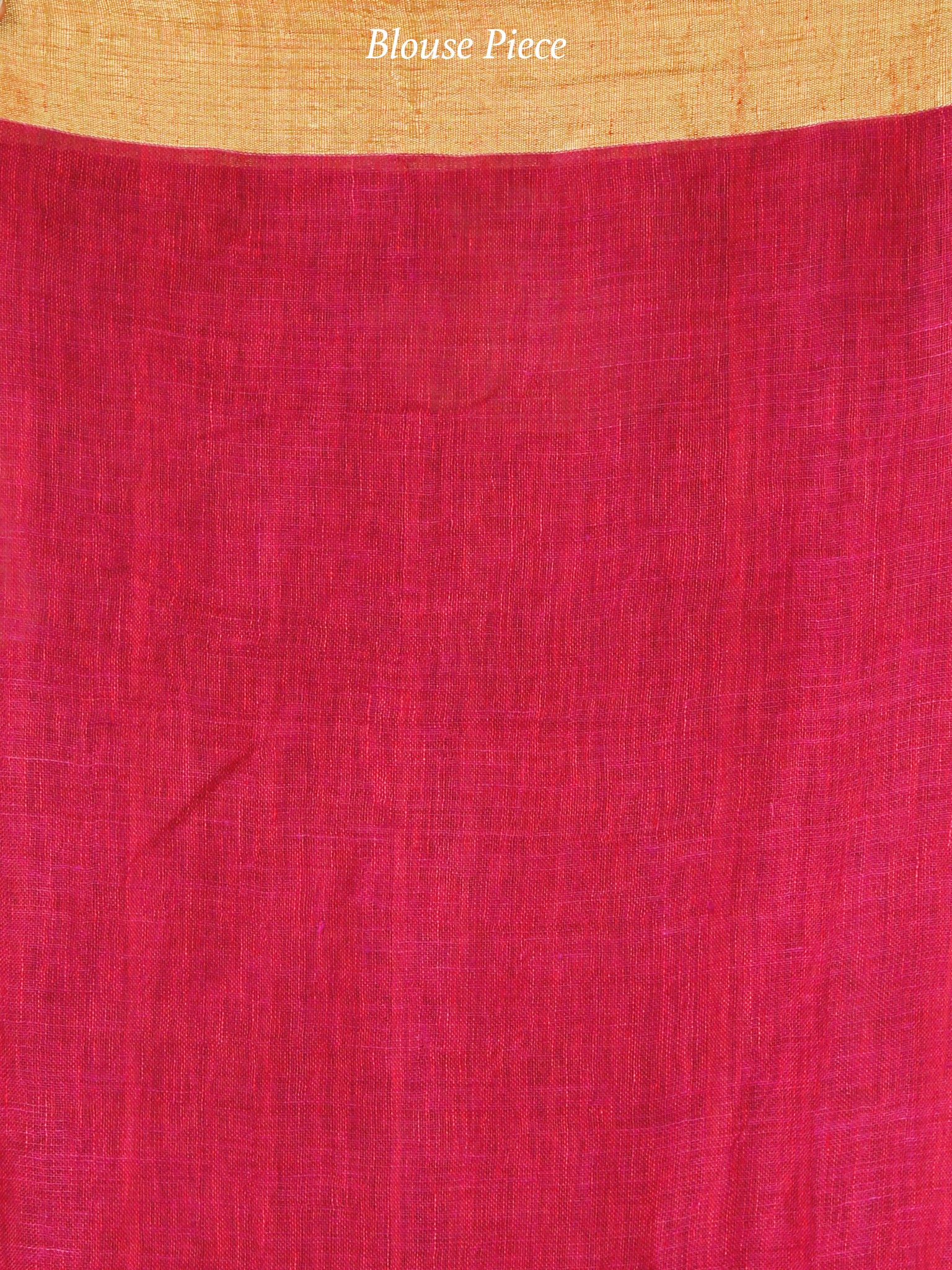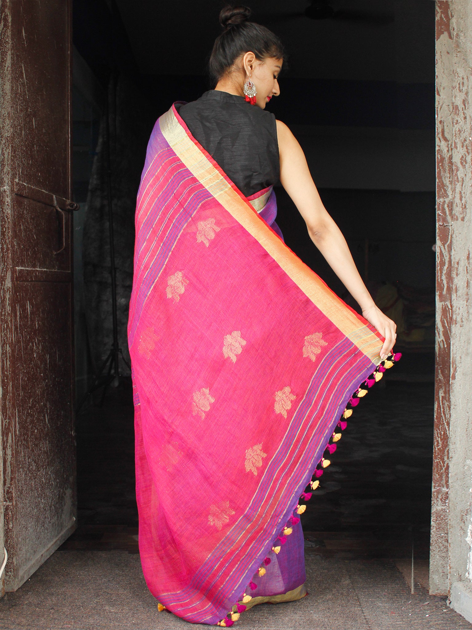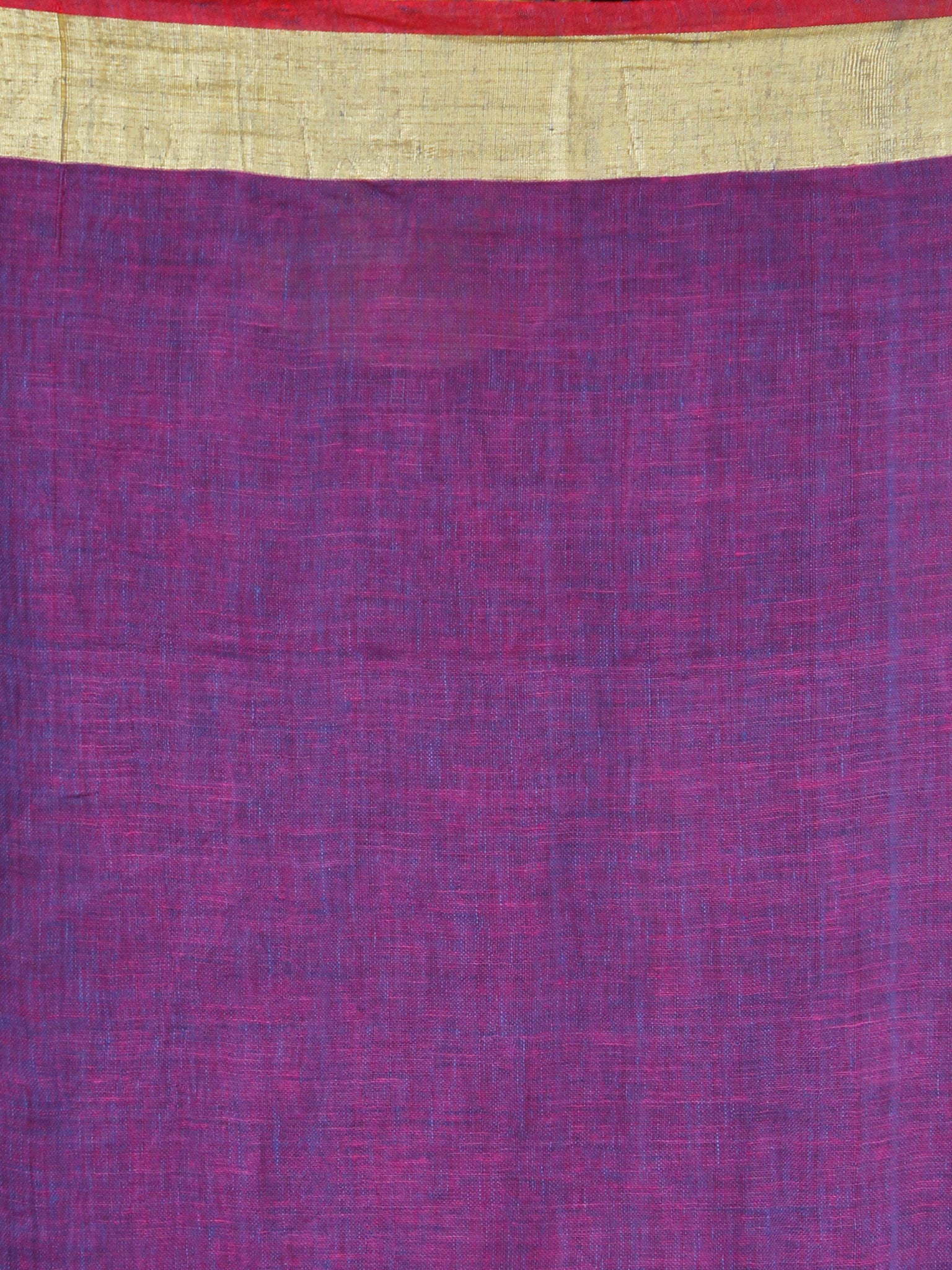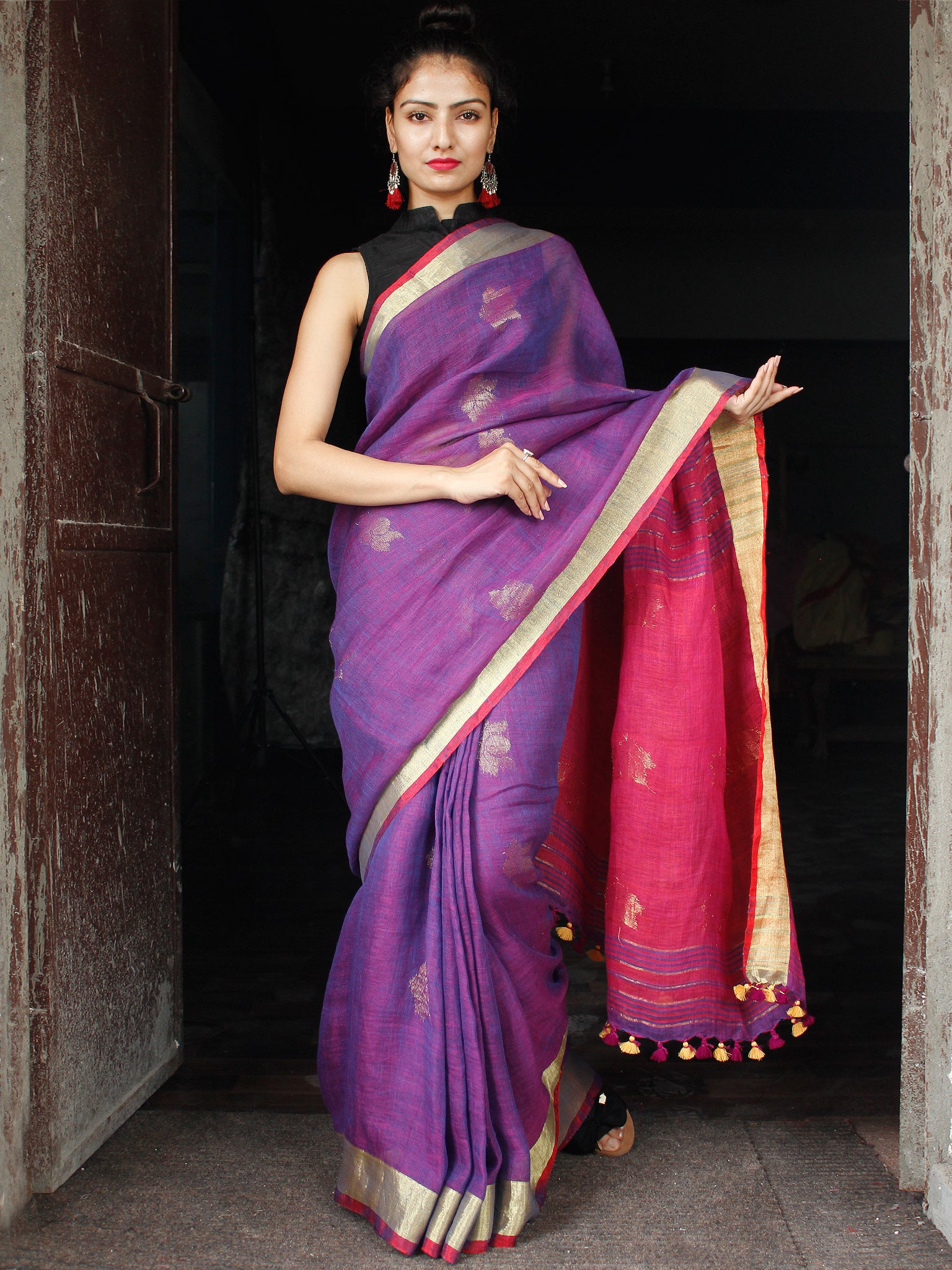 Purple Magenta Golden Handwoven Linen Jamdani Saree With Zari Border & Tassels - S031704022