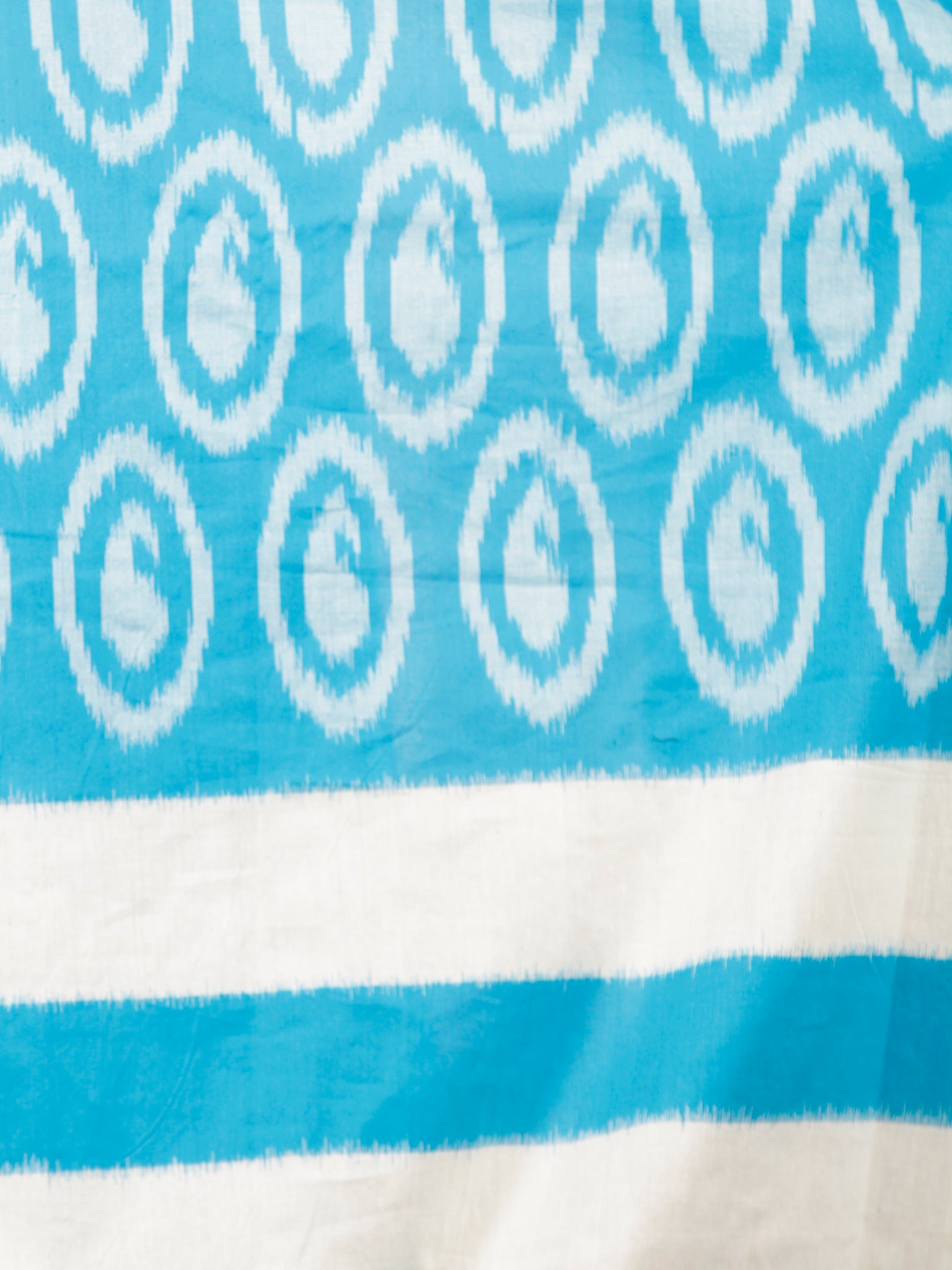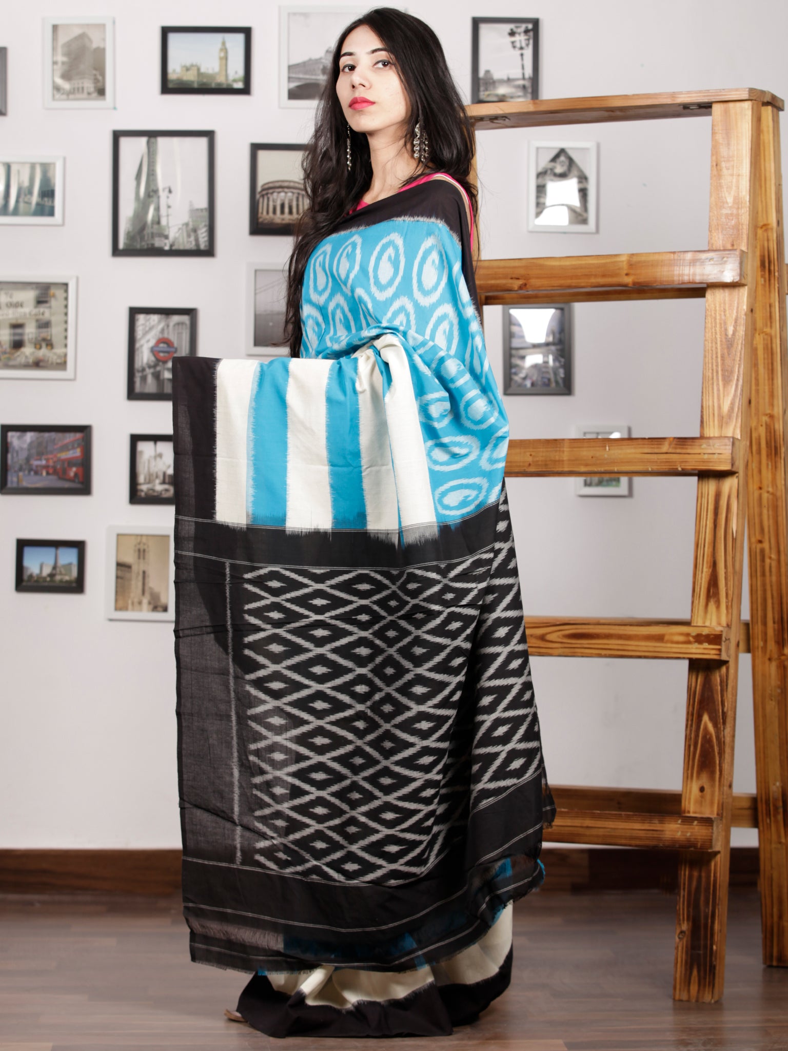 Sky Blue Ivory Black Ikat Handwoven Pochampally Mercerized Cotton Saree - S031701578