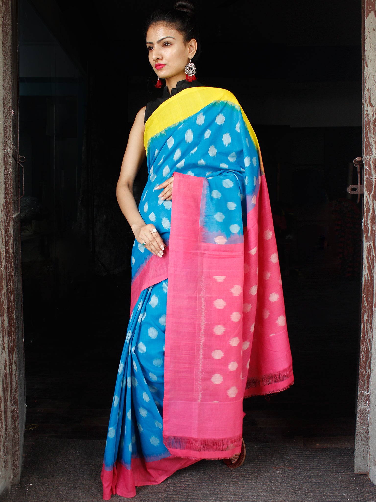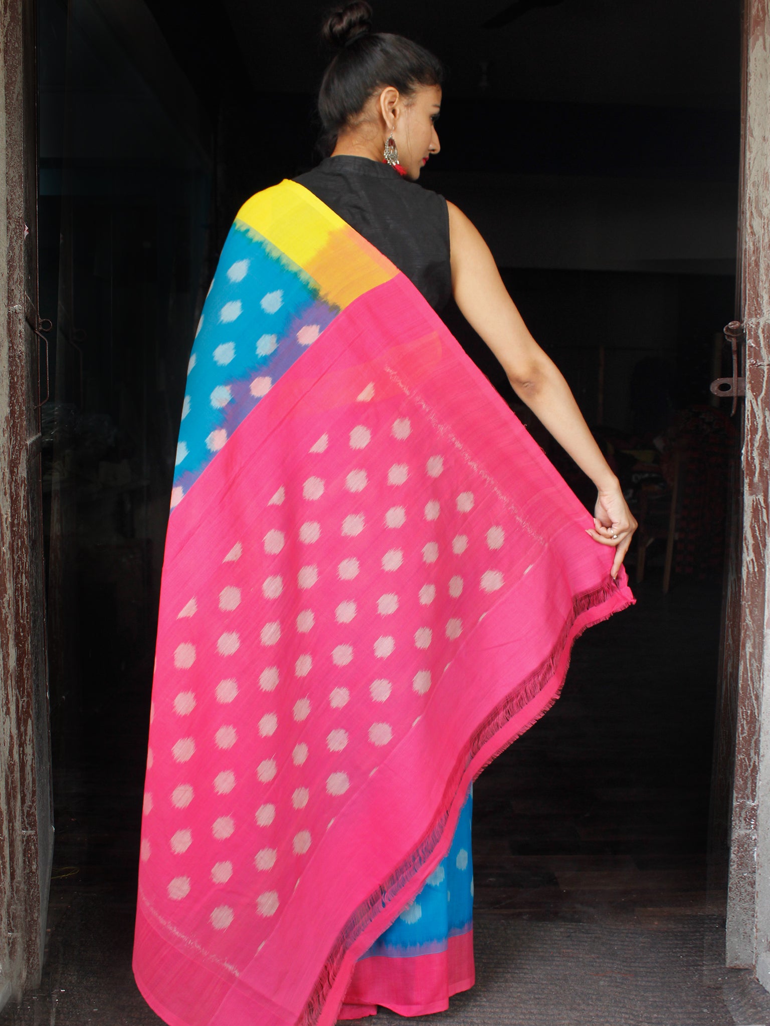 Sky Blue Pink Yellow Grey Ikat Handwoven Ganga Jamuna Border Cotton Saree - S031703638