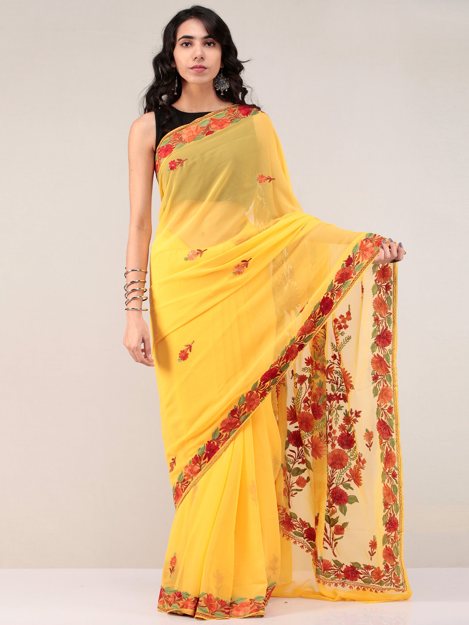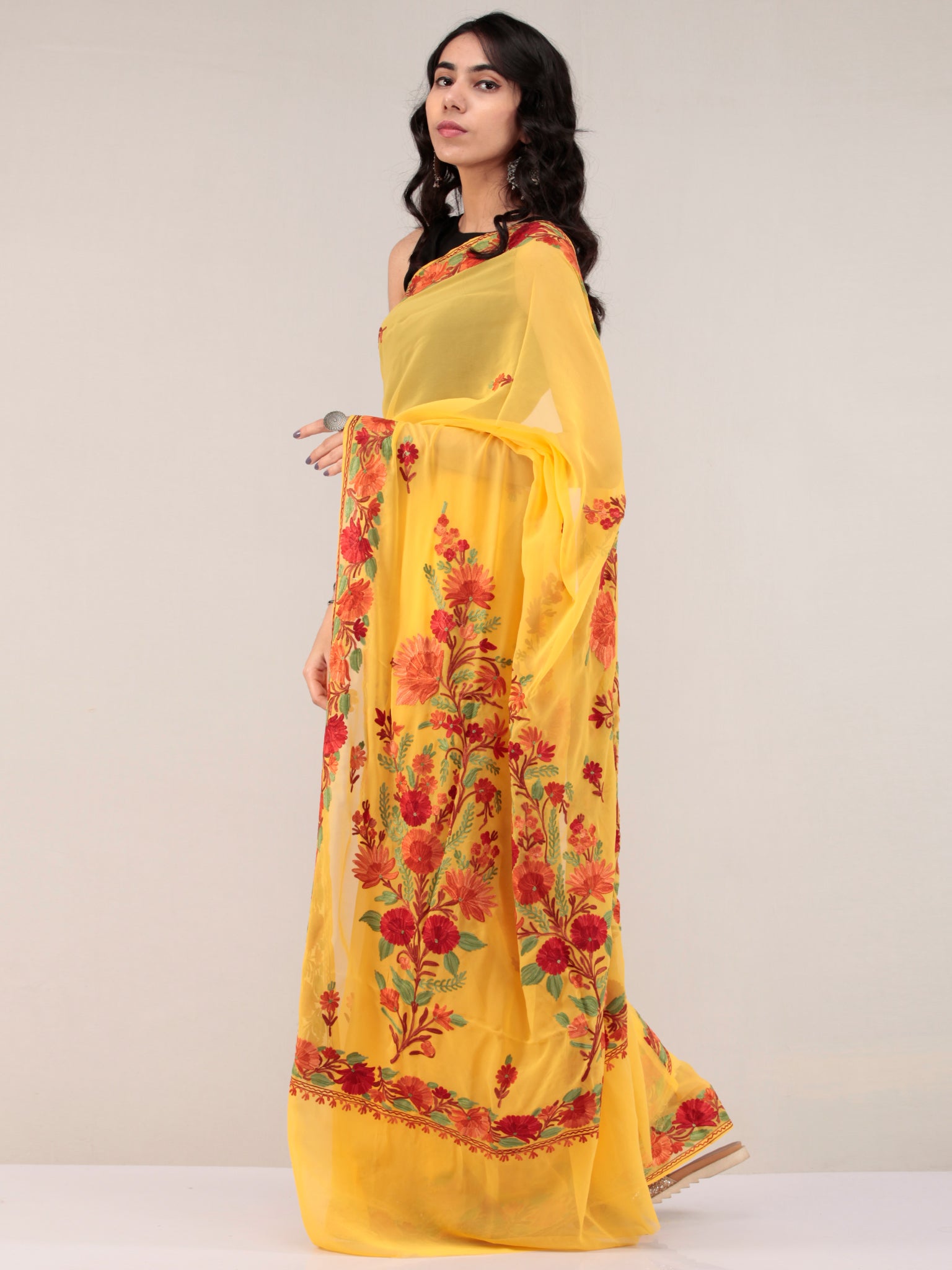 Yellow Aari Embroidered Georgette Saree From Kashmir - S031704665