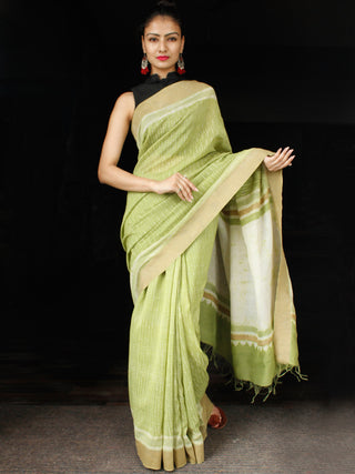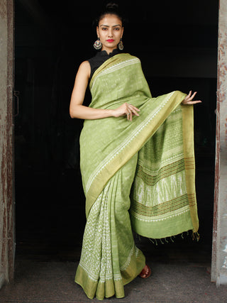 Chartreuse Green White Hand Block Printed Handwoven Linen Saree With Zari Border - S031703595