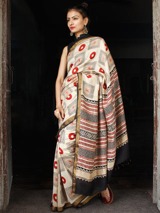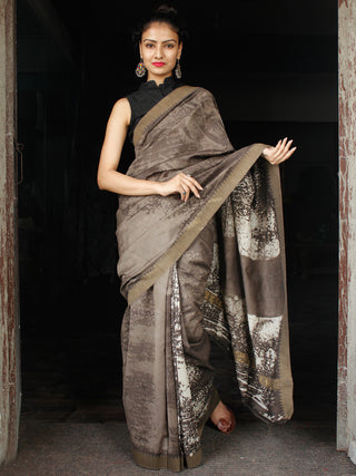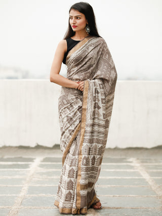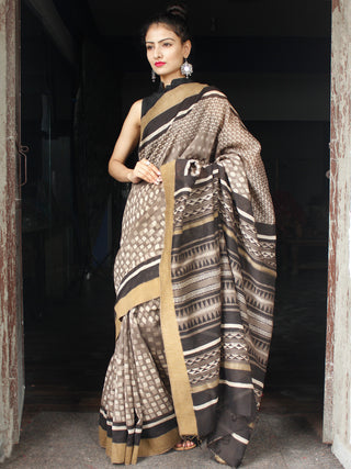 Light Brown Ivory Black Chanderi Silk Hand Block Printed Saree With Geecha Border - S031704005