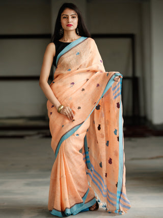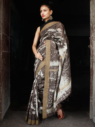 Kashish Ivory Hand Block Printed Handwoven Linen Saree With Zari Border - S031704038