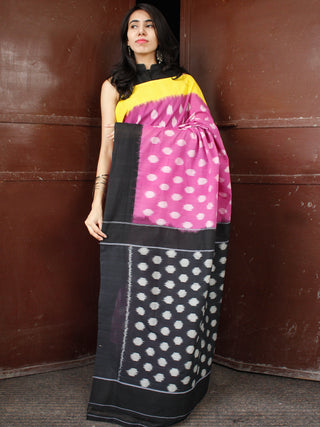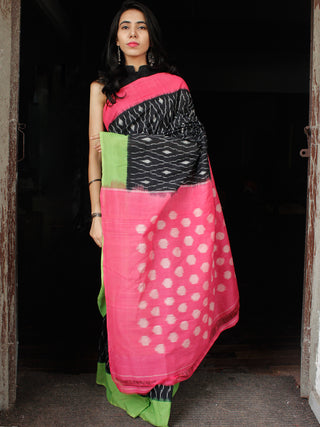 Black Pink Green Grey Double Ikat Handwoven Cotton Saree With Ganga Jamuna Border - S031703644