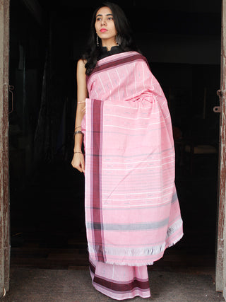 Baby Pink White Maroon Ikat Handwoven Cotton Saree With Ganga Jamuna Border - S031703645
