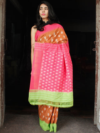 Peanut Brown Pink Green Double Ikat Handwoven Cotton Saree With Ganga Jamuna Border - S031703647