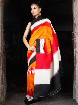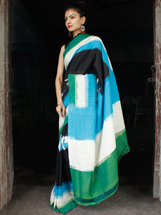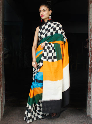 Black White Green Blue Yellow Ikat Handwoven Mercerised Cotton Saree - S031703624