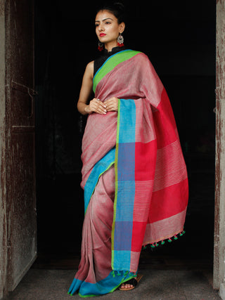 Pink Blue Green Linen Handloom Saree With Ganga Jamuna Border & Tassels - S031704013